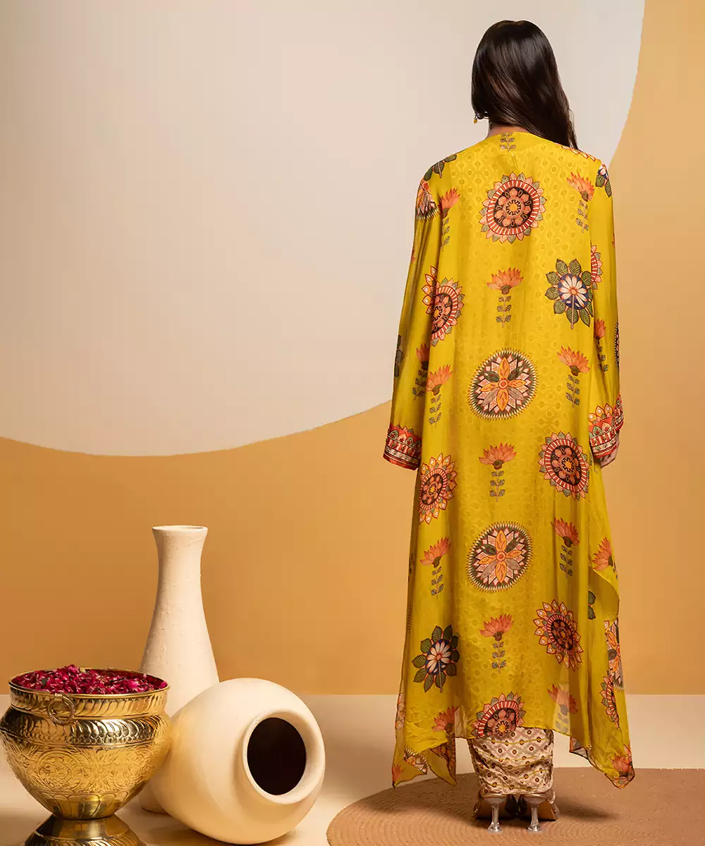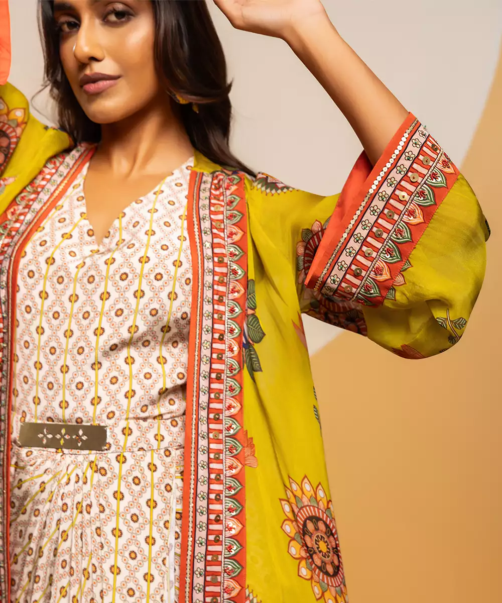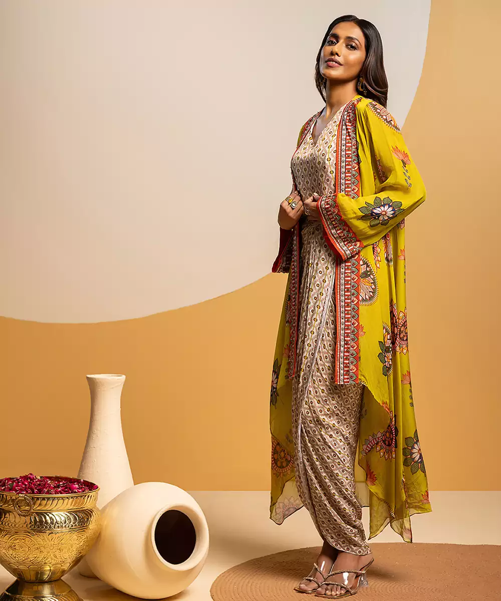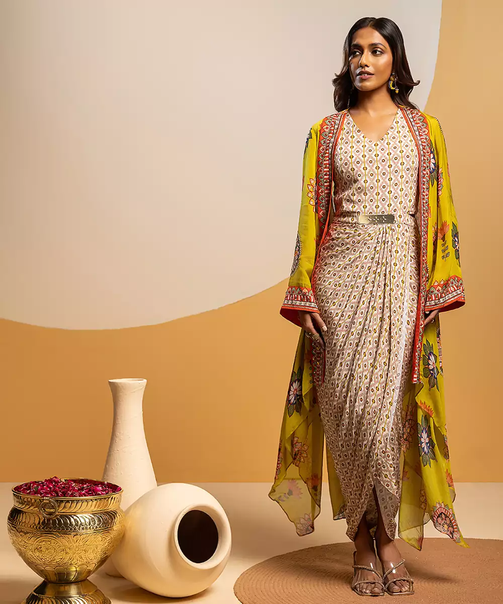 Multicolor Taarani Printed Drape Dress With Statement Metal Buckle, Paired With Embellished Jacket In Organza. Colour: Multicolor Fabric: Satin Components: 1 Dress / 1 Cape