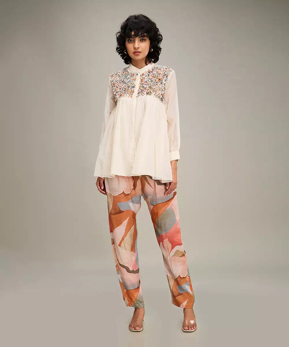Featuring A Off White Embellished Top In Handloom Net Paired With Printed Pants In Muslin Slub.