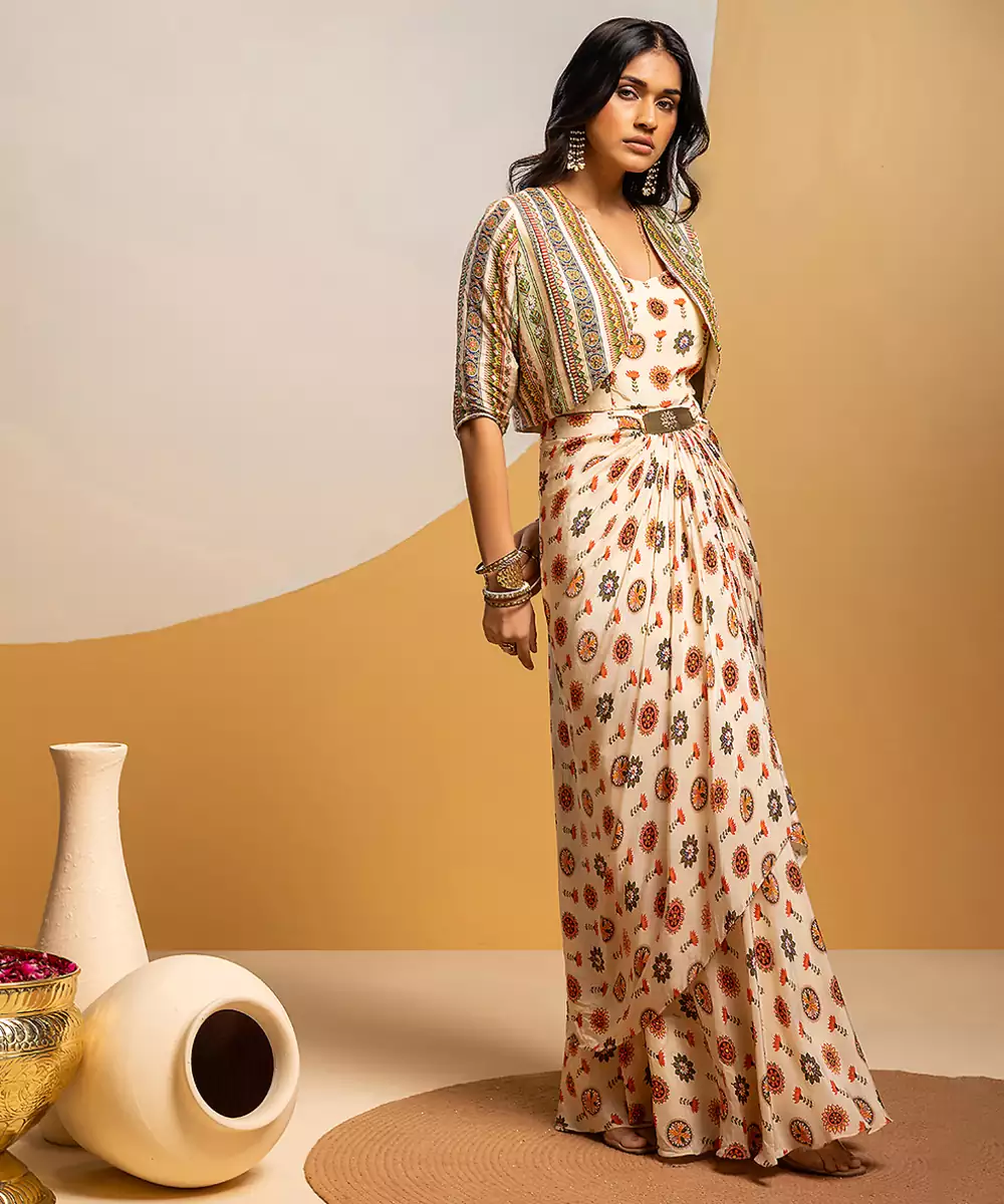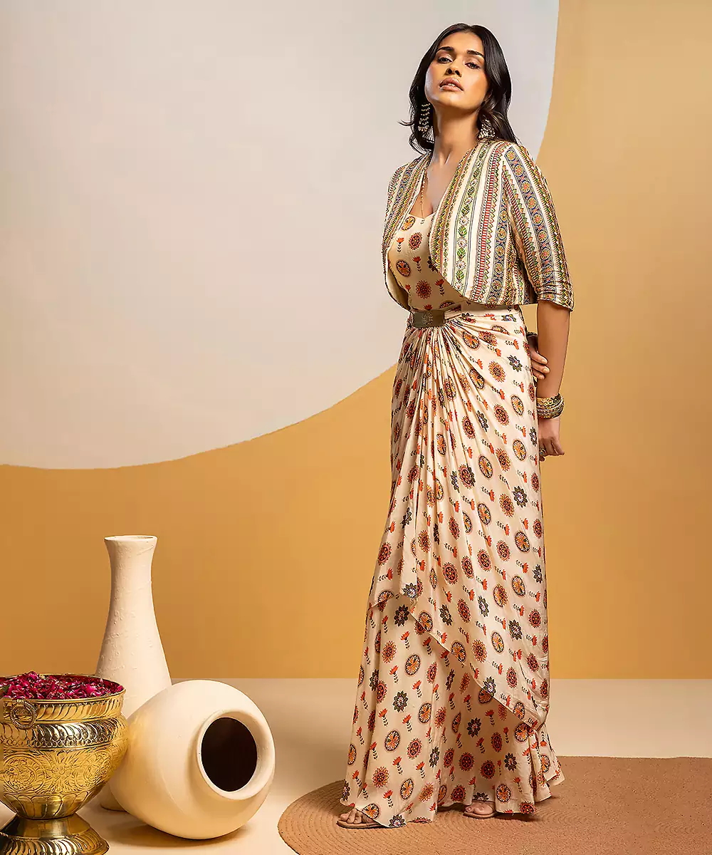 Off White Taarani Printed Long Drape Dress In Crepe, Paired With Embroidered Jacket In Silk.