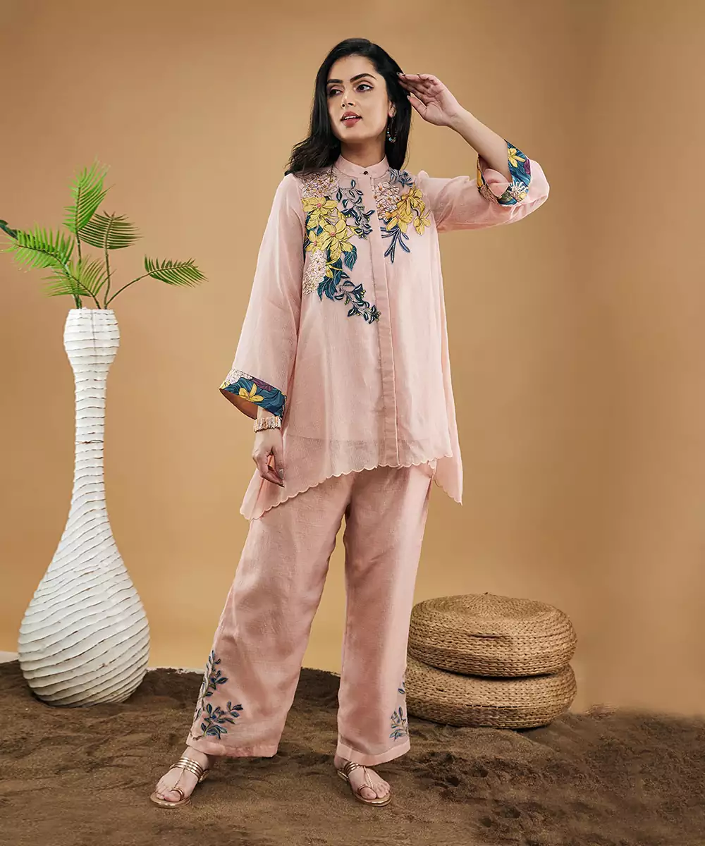 Featuring Peach Zinnia Applique High Low Shirt With Pants. Colour : Peach Fabric : Cotton Components : 2 (Pant,Top) Work : Embroidered