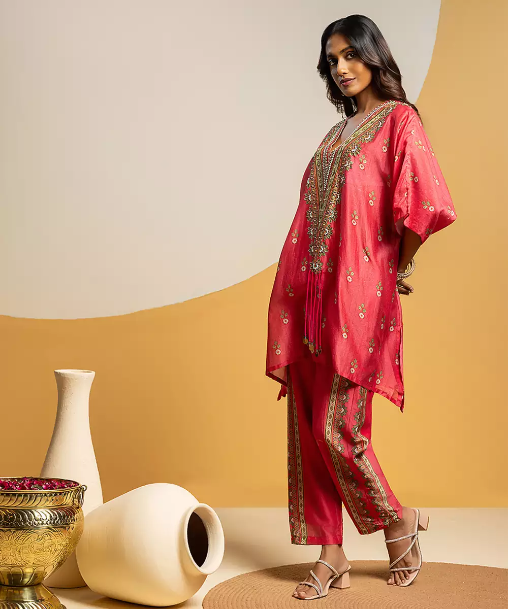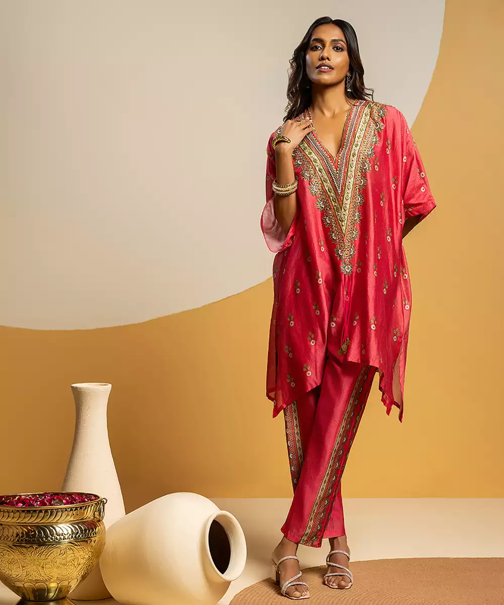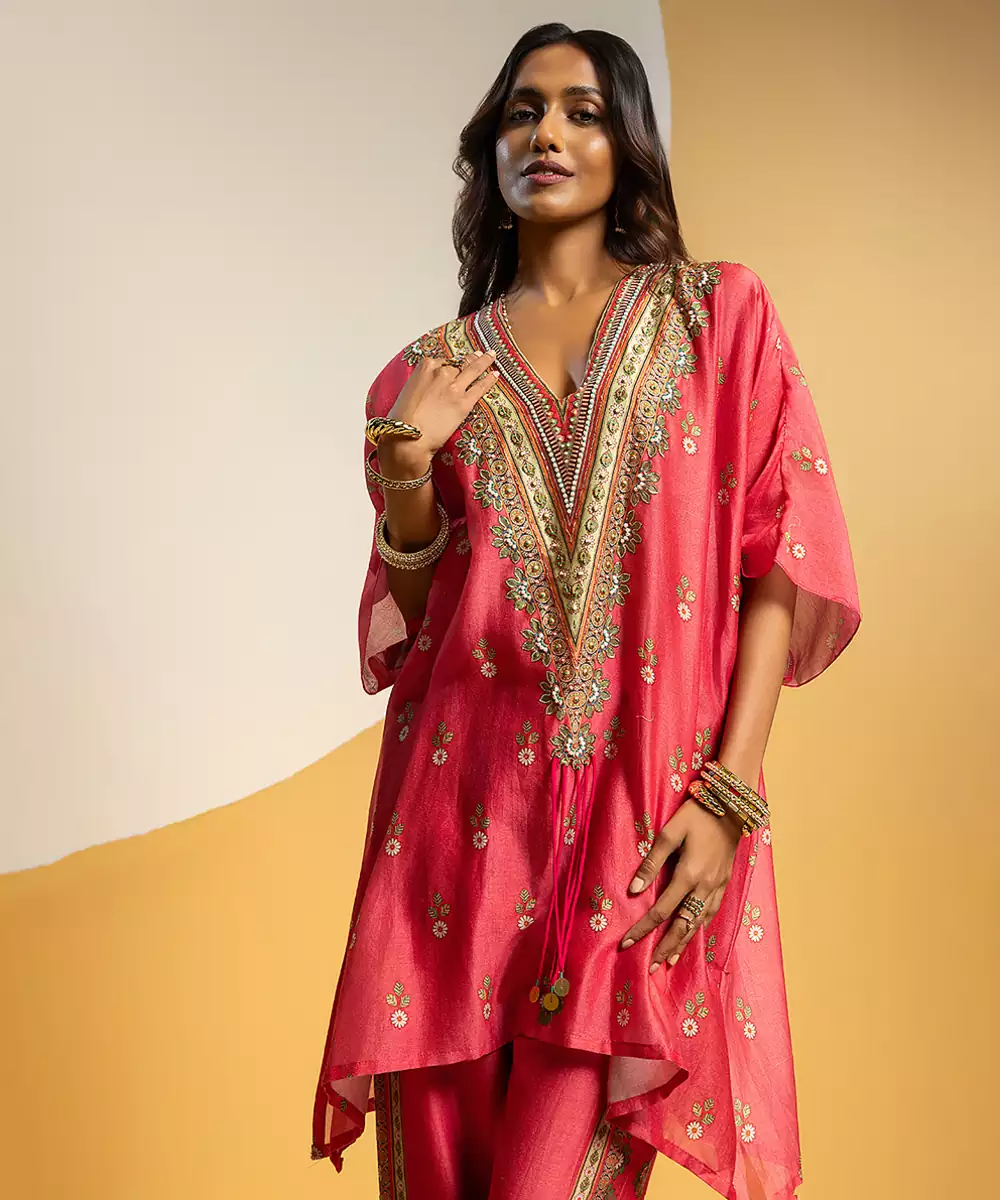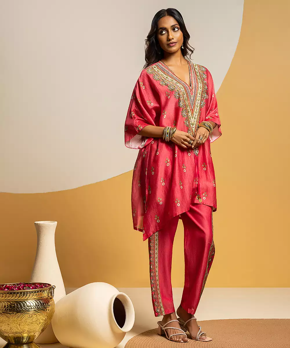 Pink Taarani Embellished V Neck Kurta, Paired With Printed Pants In Chanderi. Colour: Pink Fabric: Chanderi Components: 1 Kurta / 1 Pant