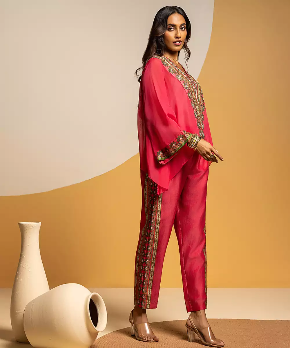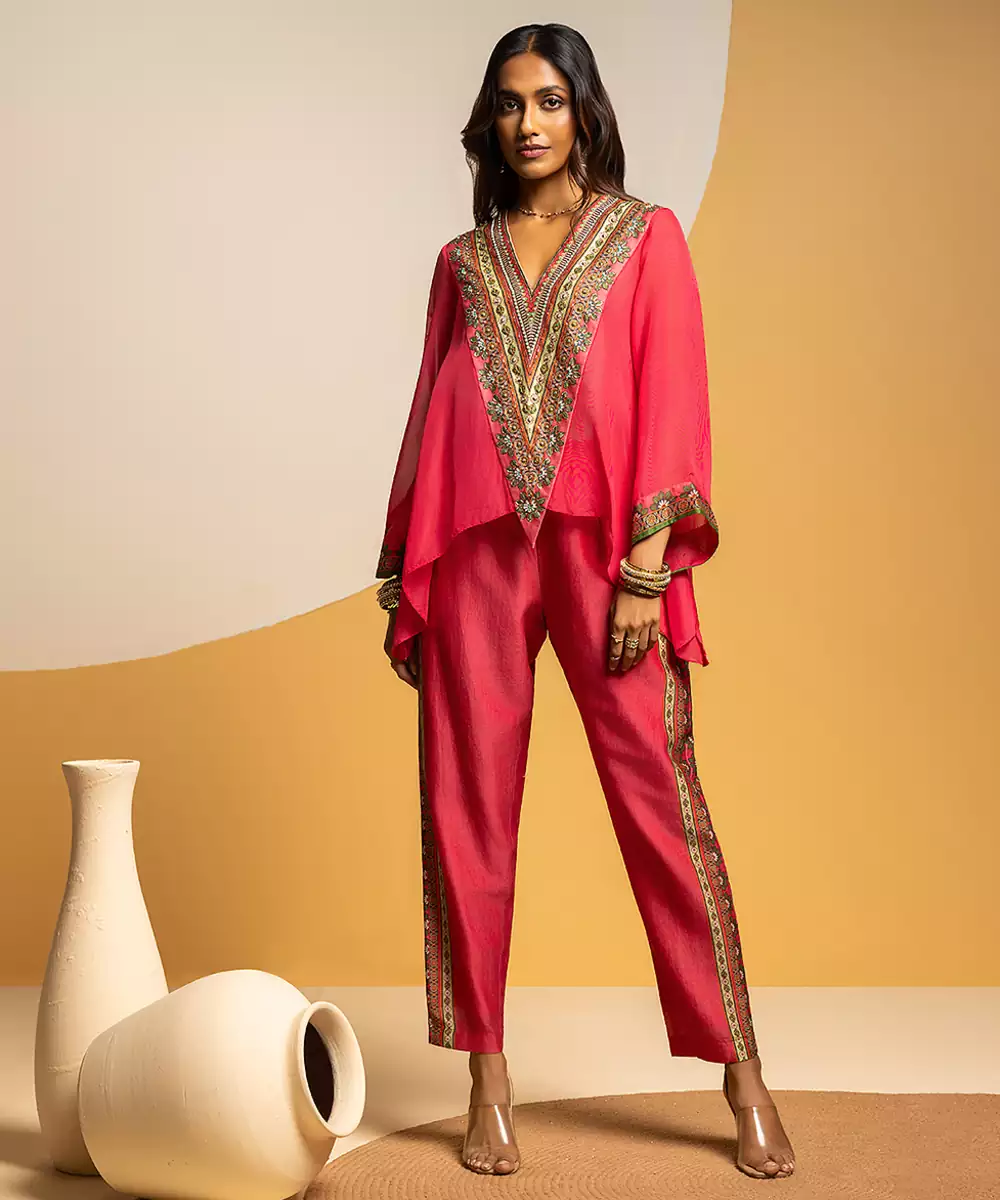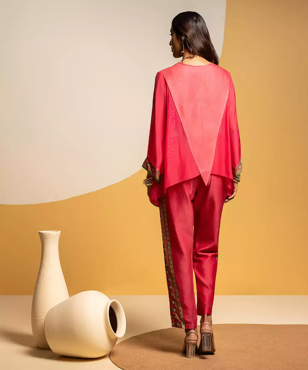 Pink Taarani Embellished V Neck Asymmetric Top, Paired With Printed Pants In Chanderi. Colour: Pink Fabric: Chanderi Components: 1 Kurta / 1 Pant