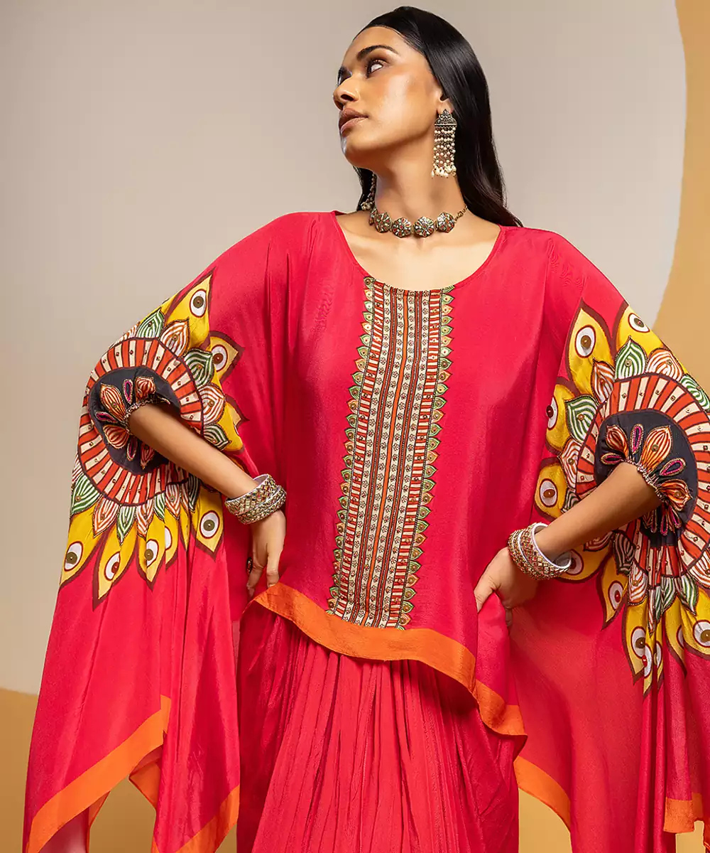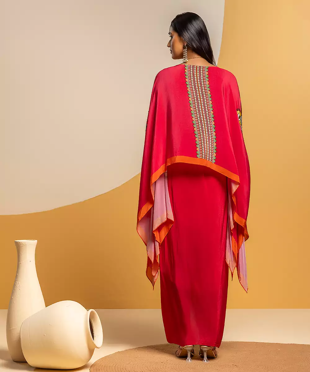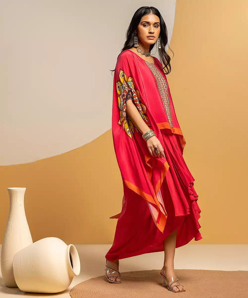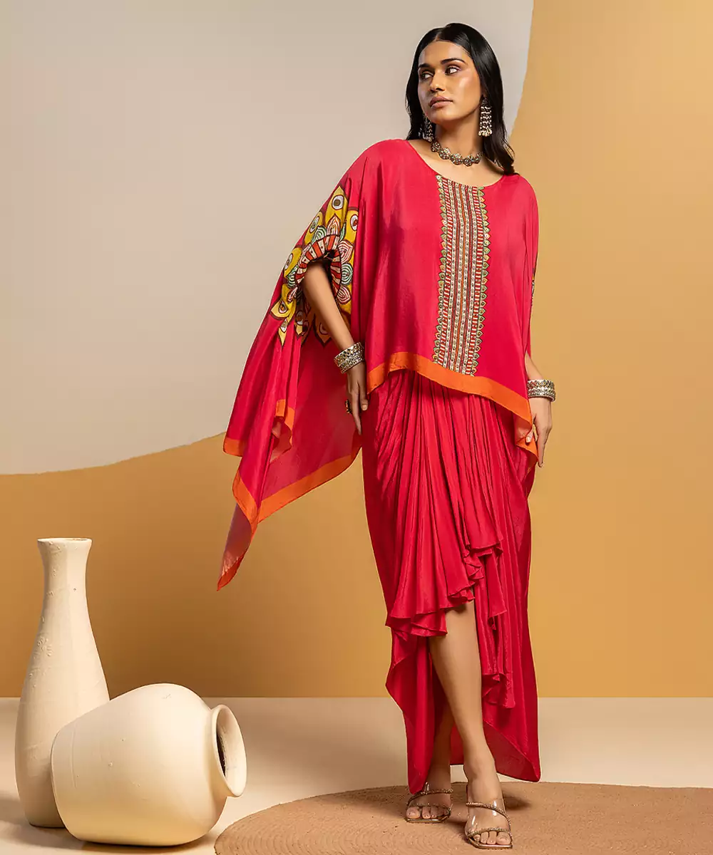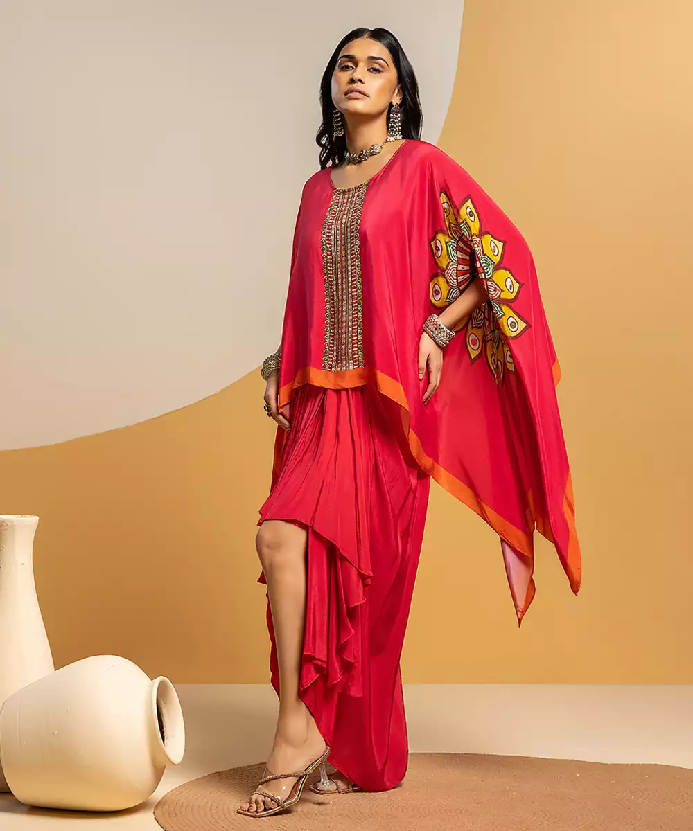 Pink Taarani Embellished Kimono Asymmetric Top, Paired With Printed Drape Skirt In Crepe. Colour: Pink Fabric: Crepe Components: 1 Top / 1 Skirt
