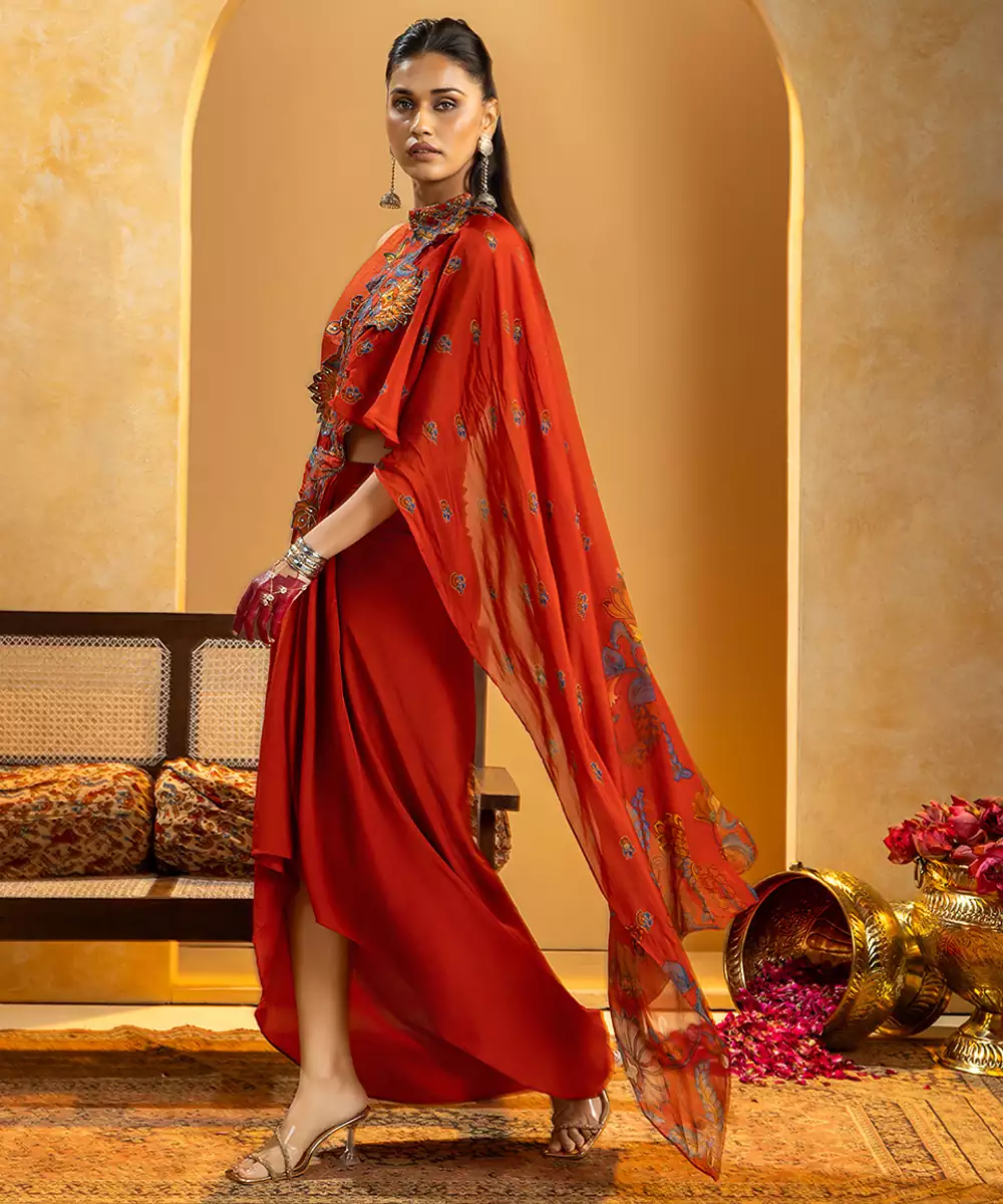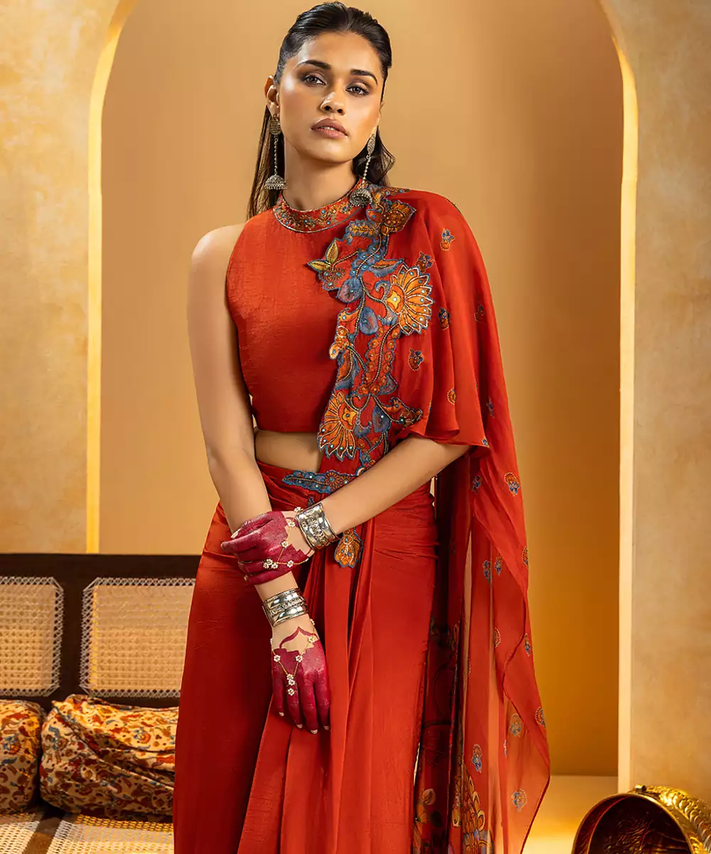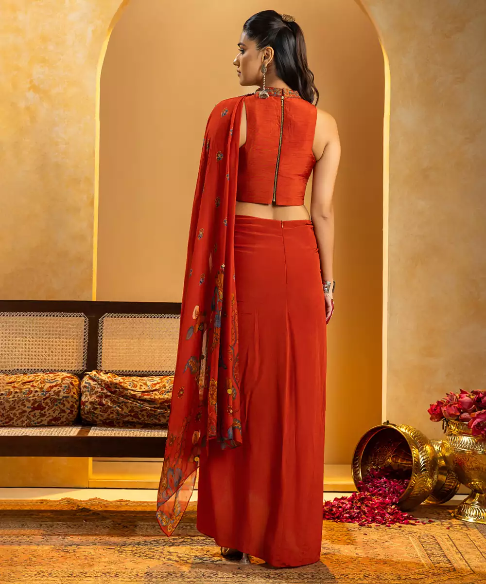 Maroon Rangtara Appliquéd Border Pre Stitched Saree In Crepe, Paired With A Halter Neck Blouse In Silk.