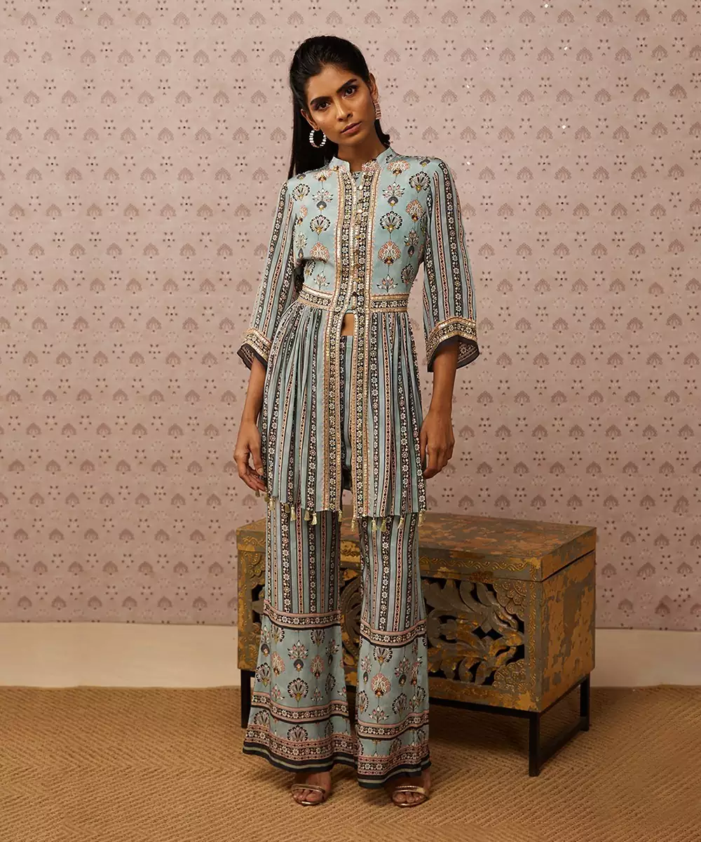Ice Blue Sarouk Embroidered Kurta Top With Pants In Crepe. Colour : Blue Fabric : Crepe Components : 2 (Palazzo,Kurta) Work : Printed