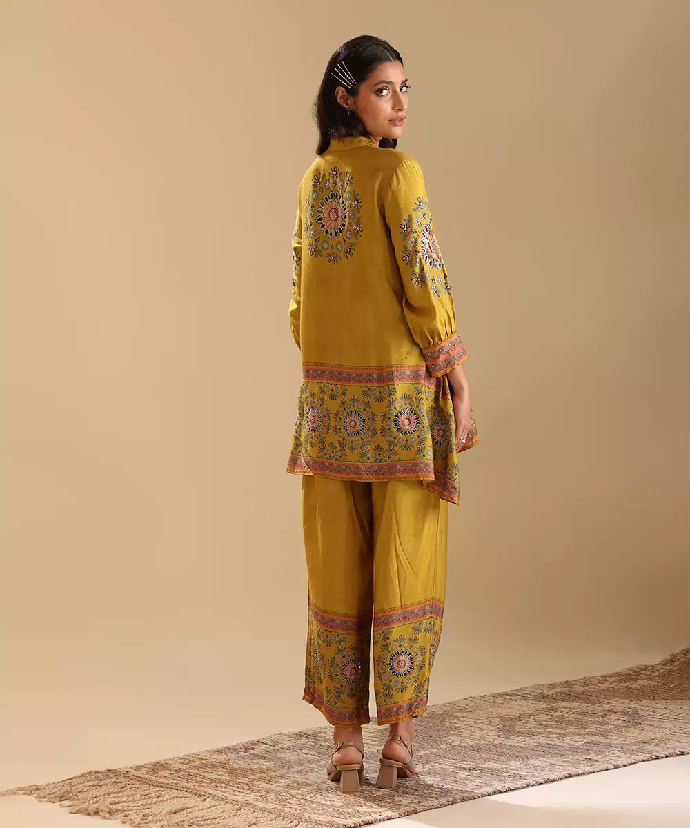 Yellow Eraya Embellished Shirt With Gathered Sleeves Paired With Pants In Cotton Silk