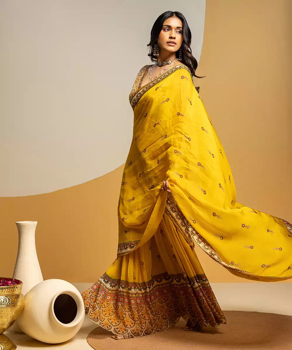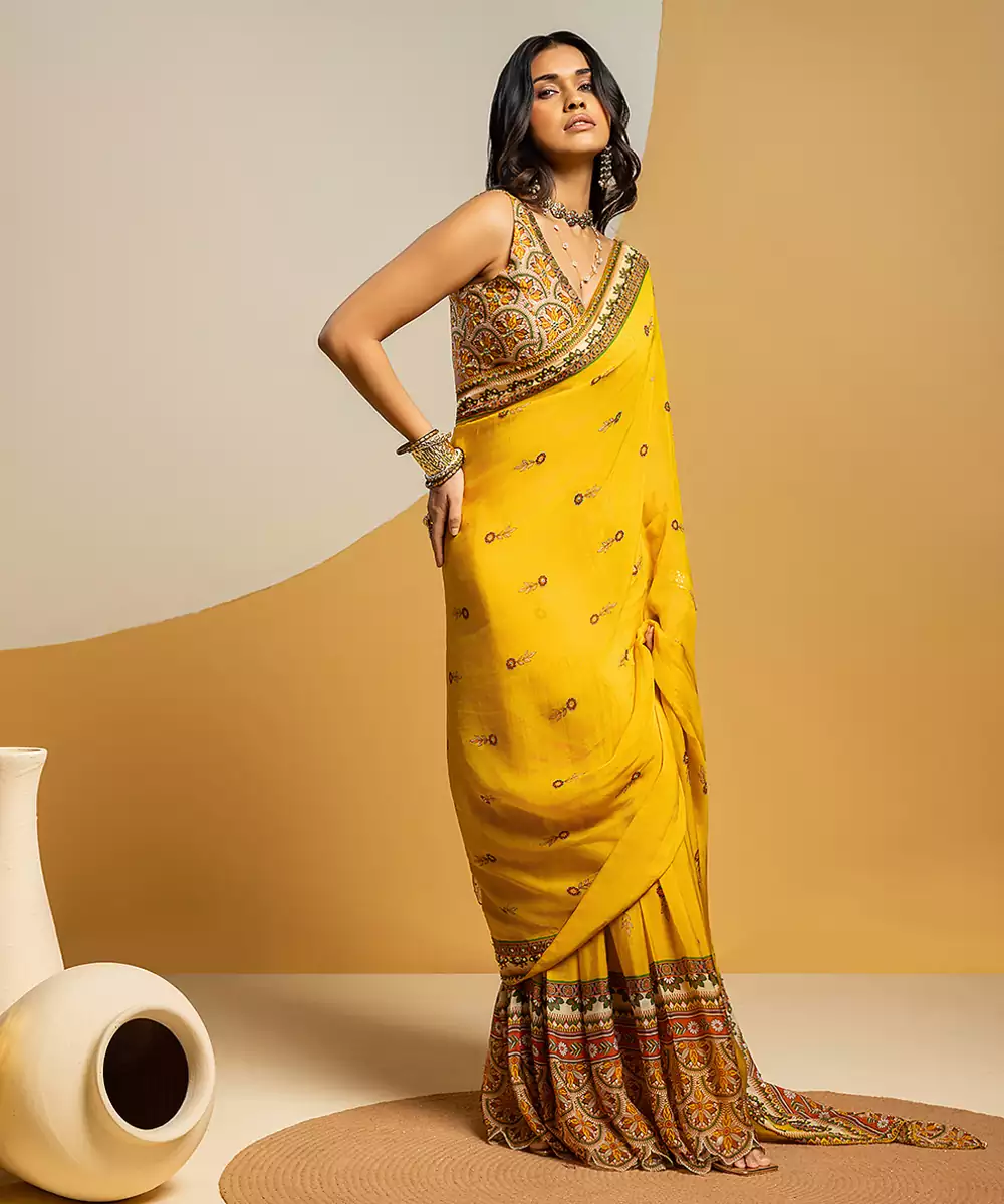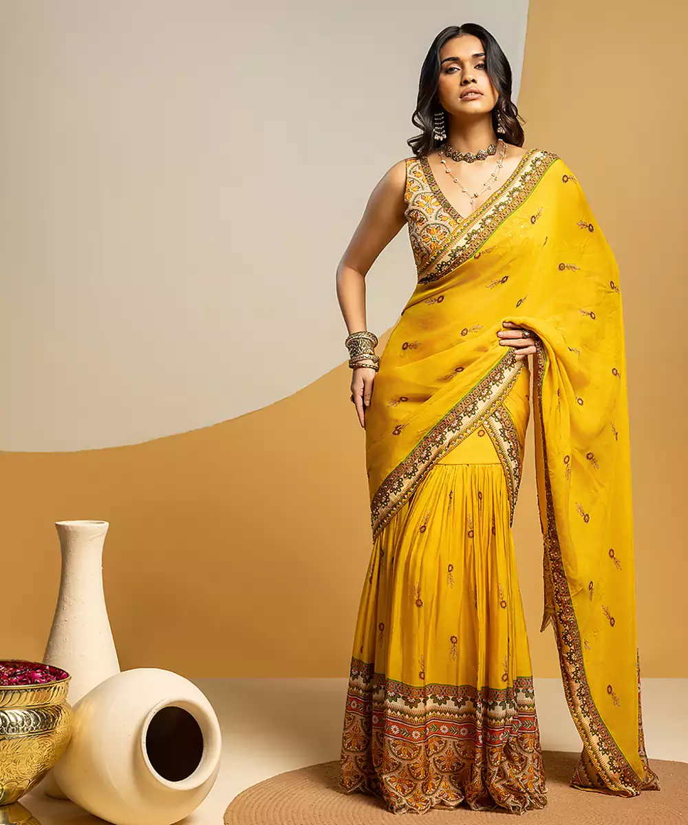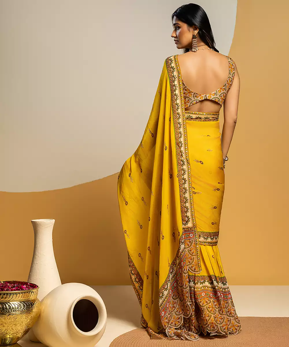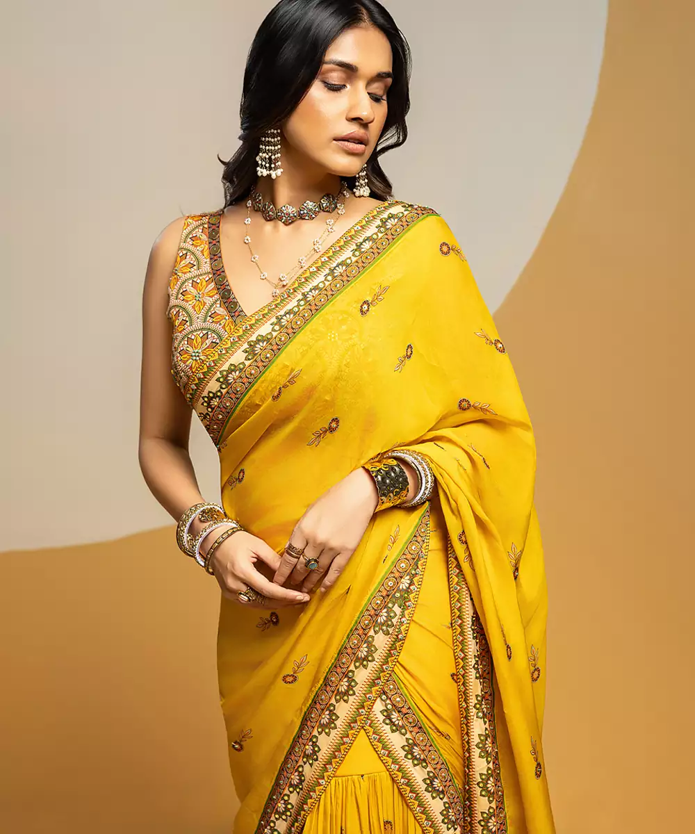 Yellow Taarani Embellished Pre Stitched Saree In Organza, Paired With V Neck Blouse In Silk.