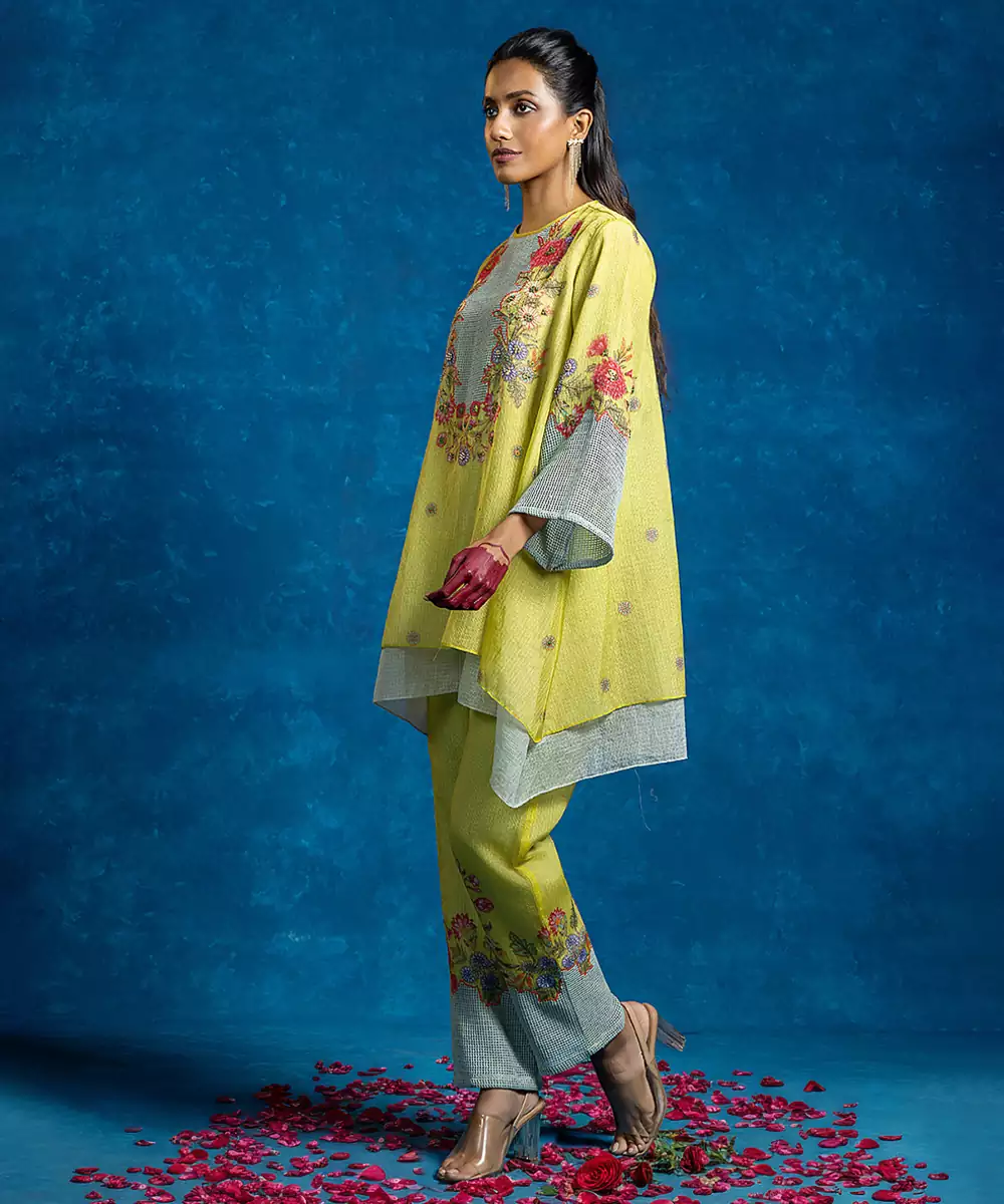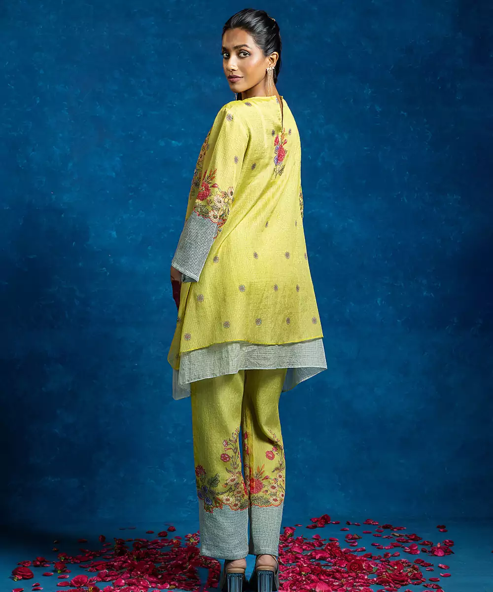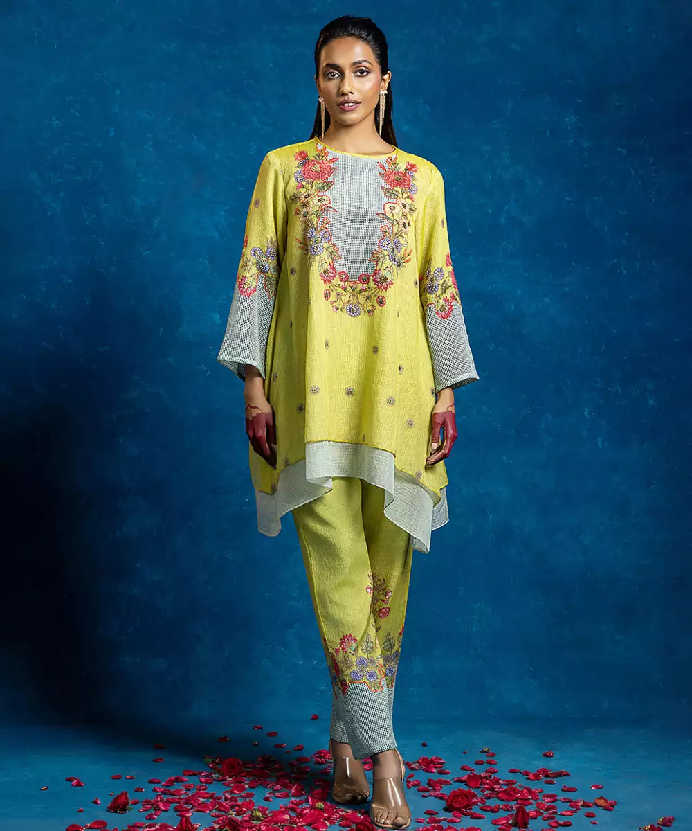 Yellow Rangtara Colour Blocked Kurta With Appliqué Detail, Paired With Printed Pants In Kota Silk. Colour: Yellow Fabric: Silk Components: 1 Kurta / 1 Pant