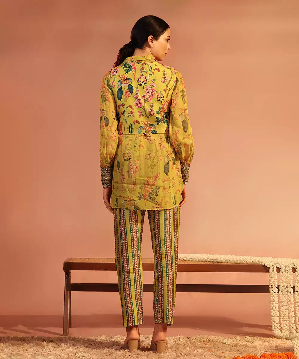 Yellow Tamaya Printed Sheer Shirt Kurta And Pants, Paired With An Embroidered Jacket In Malaysian Silk.