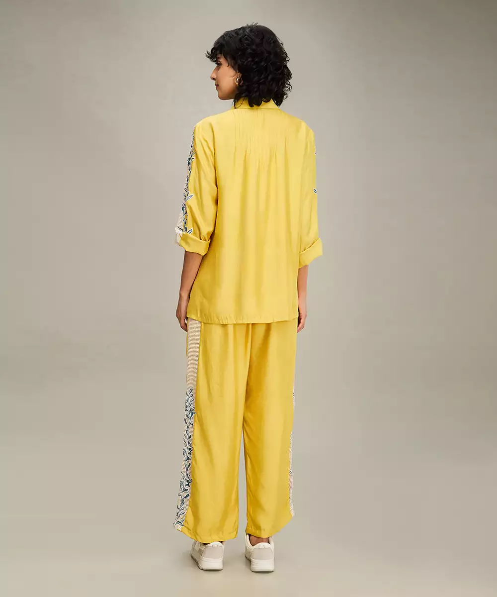 Featuring A Yellow Shirt With Floral Applique Embroidery. Paired With Chanderi Pant.