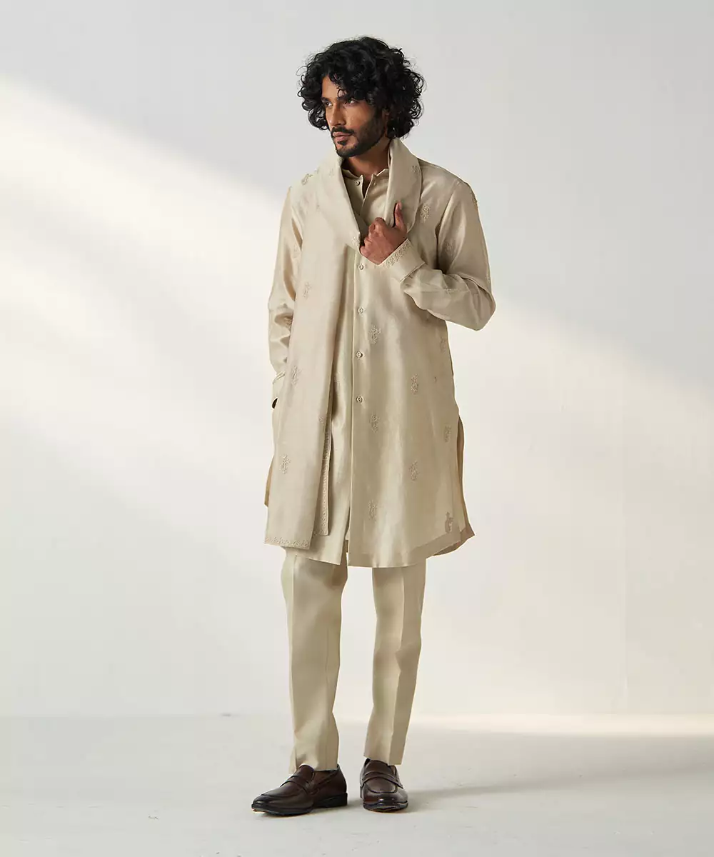 This Set Includes Kurta, Pants And Stole. The Kurta Features Dori Embroidery Detailing On The Cuffs And Collar ,Paired With Chanderi Straight Pants. The Stole Consists Of Intricate Dori Embroidery.