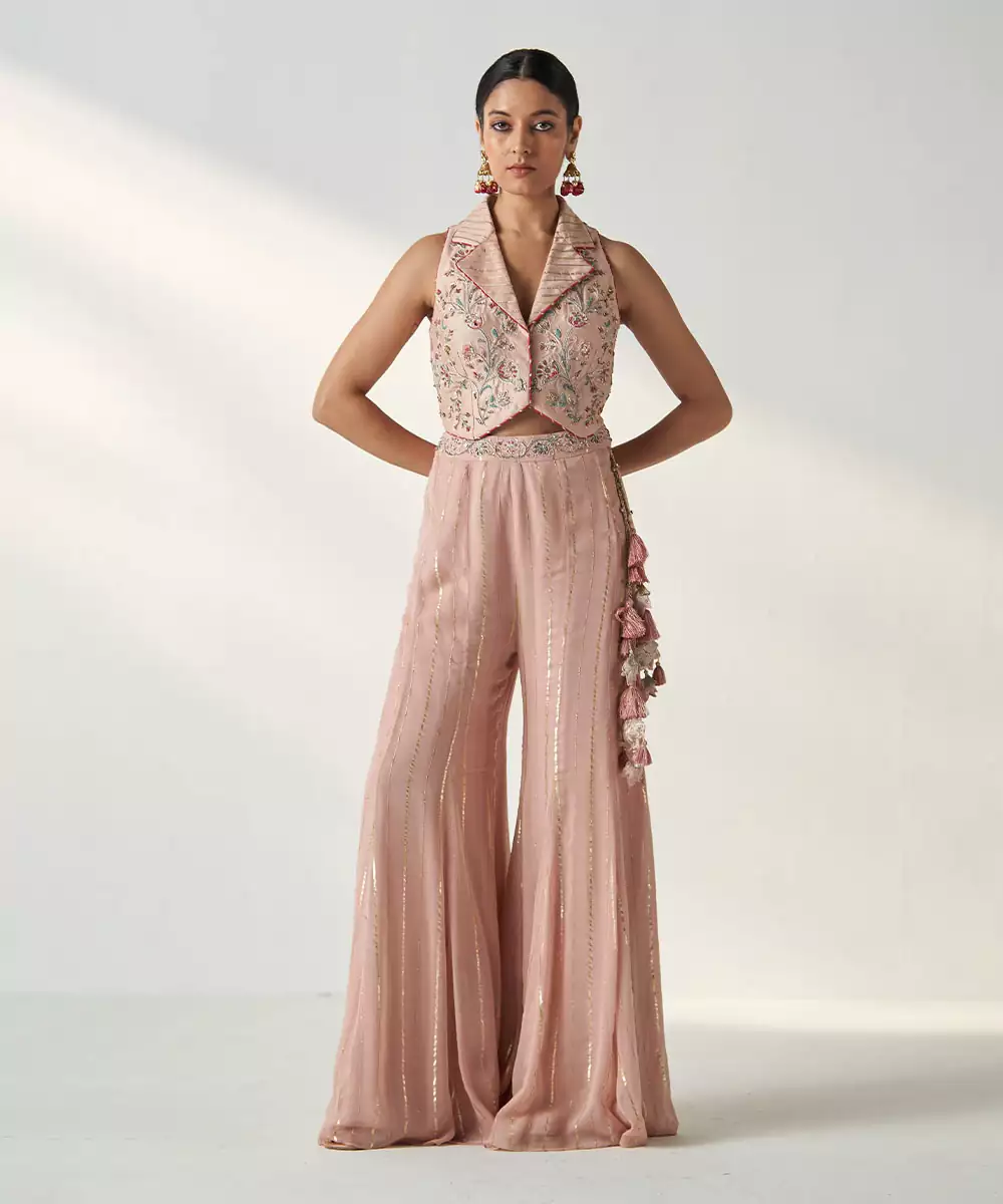 This Set Includes Gilet With Sharara Pants. Chanderi Gilet Has Intricate Hand Embroidery Paired With Tassels On Sharara Pants