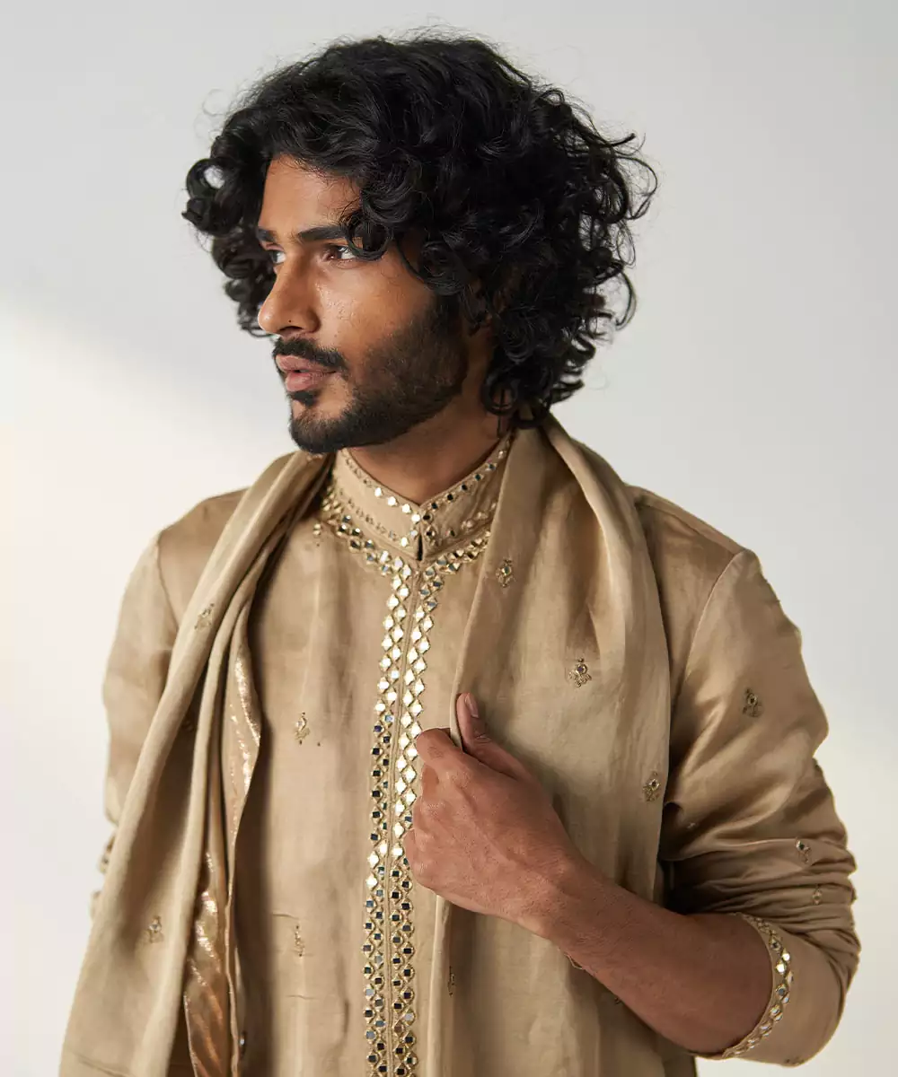 This Set Includes Kurta, Pants And Stole. The Kurta Features Dori Embroidery Along With Mirror Work Detailing On The Cuffs And Collar And On Front Panel Of Kurta,Paired With Chanderi Straight Pants. The Stole Consists Of Mirror Embroidery Along With Chanderi Facing On The Border
