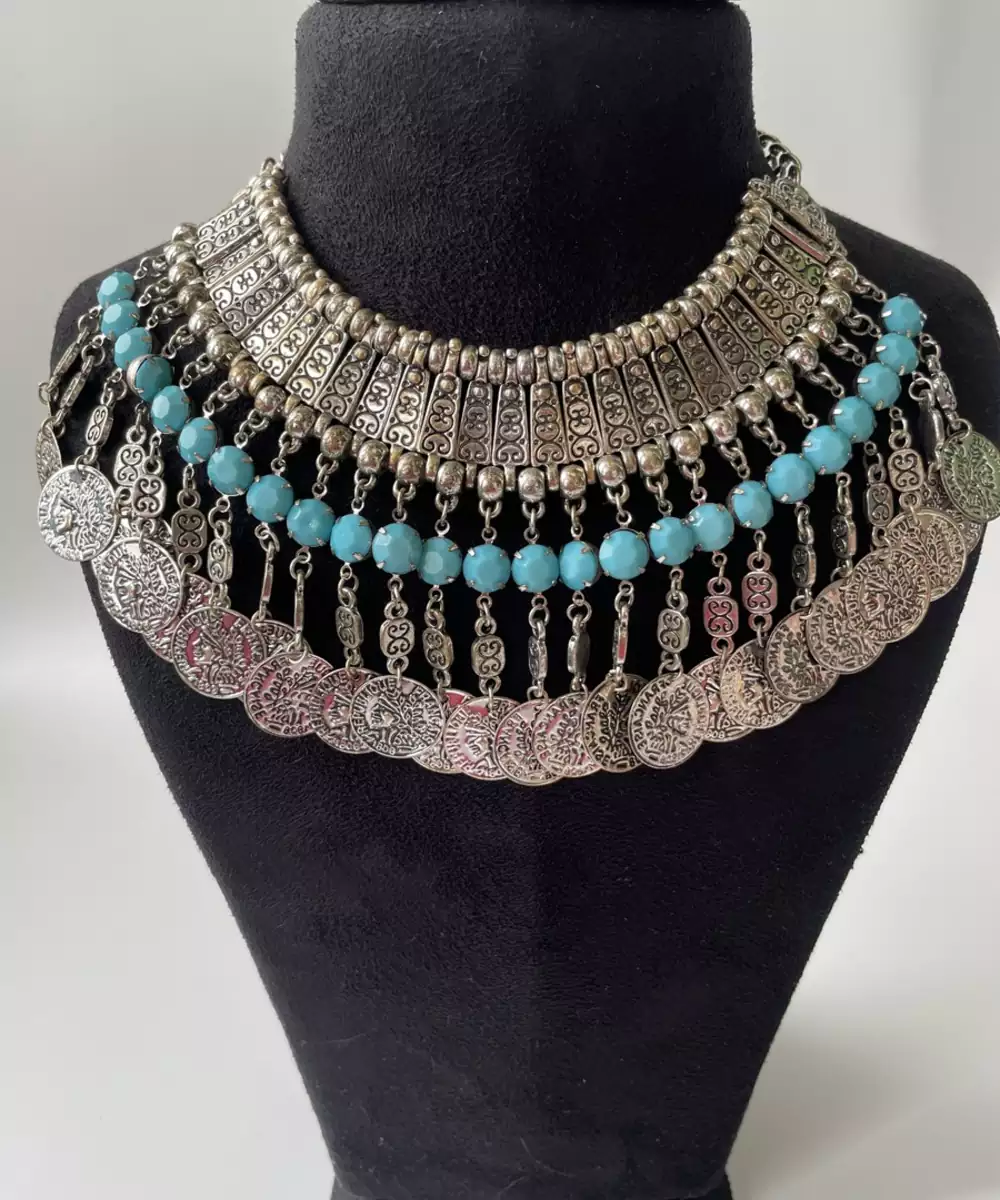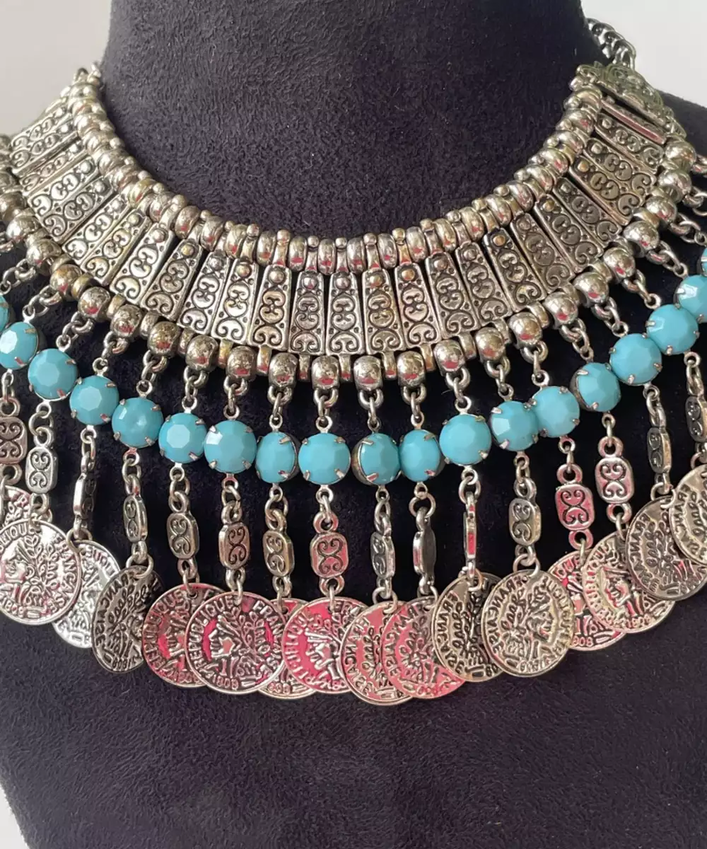 This Exquisite Oxidised Necklace Features Intricate Coin Motifs And Stunning Turquoise Accents, Adding A Touch Of Elegance And Sophistication To Any Outfit. Crafted With High Quality Materials, This Necklace Is Perfect For Any Occasion And Is Sure To Make A Statement. Elevate Your Style With This Unique Piece.