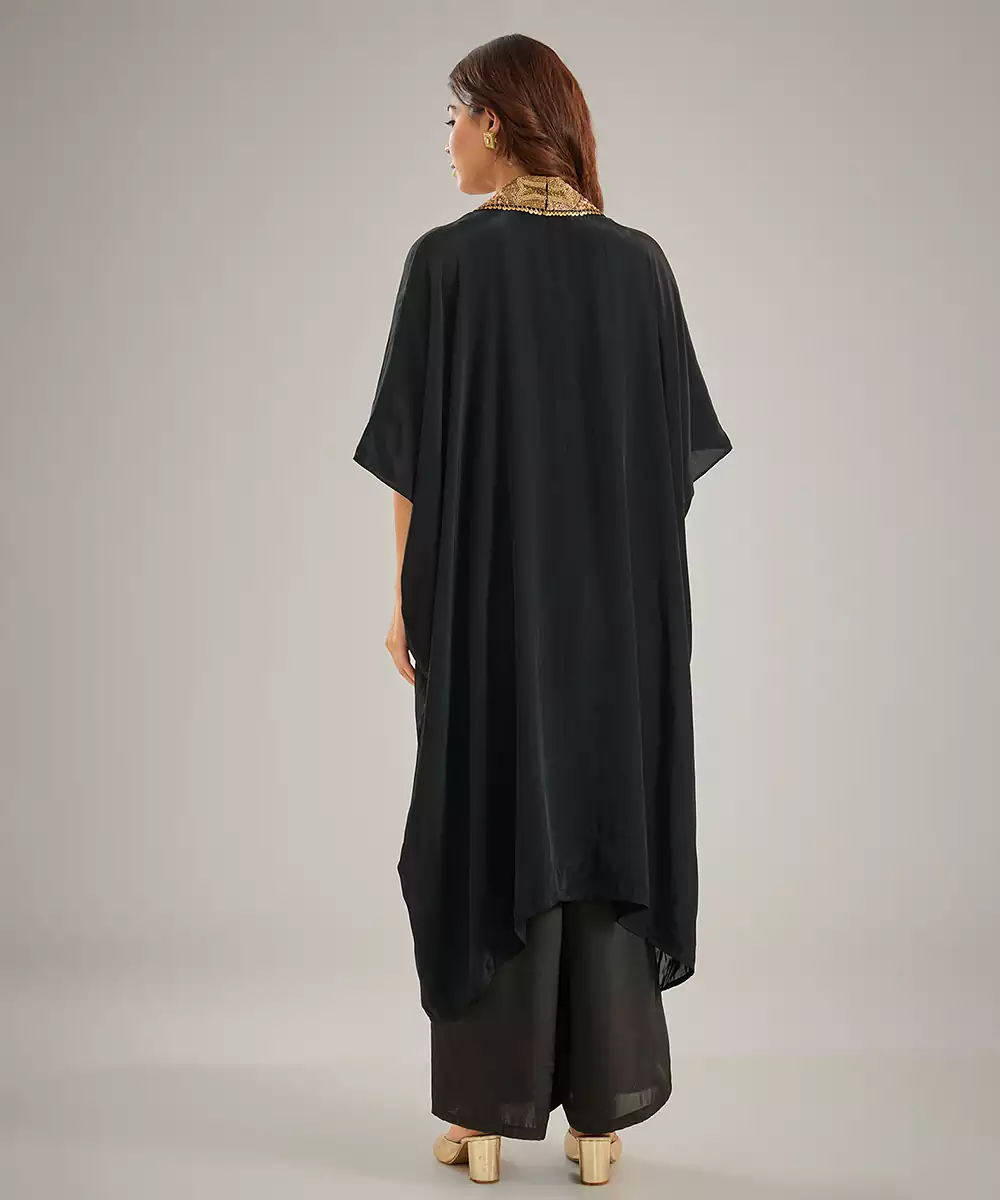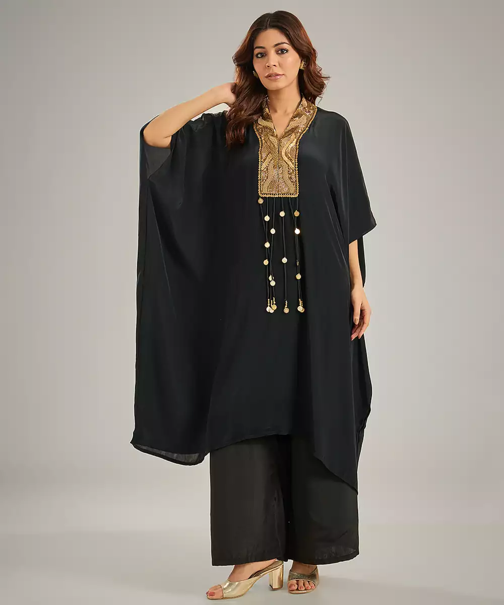 This Black Embroidered Crepe Kaftan Set Exudes Sophisticated Charm With Its Flowing, Lightweight Fabric And Relaxed, Graceful Silhouette. Intricate Embroidery Adds A Subtle, Festive Touch, Enhancing Its Timeless Ethnic Appeal. Perfect For Weddings, Parties, And Special Occasions, It Blends Comfort With Elegance, Creating A Stylish And Refined Ensemble.