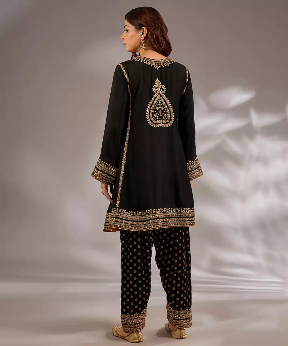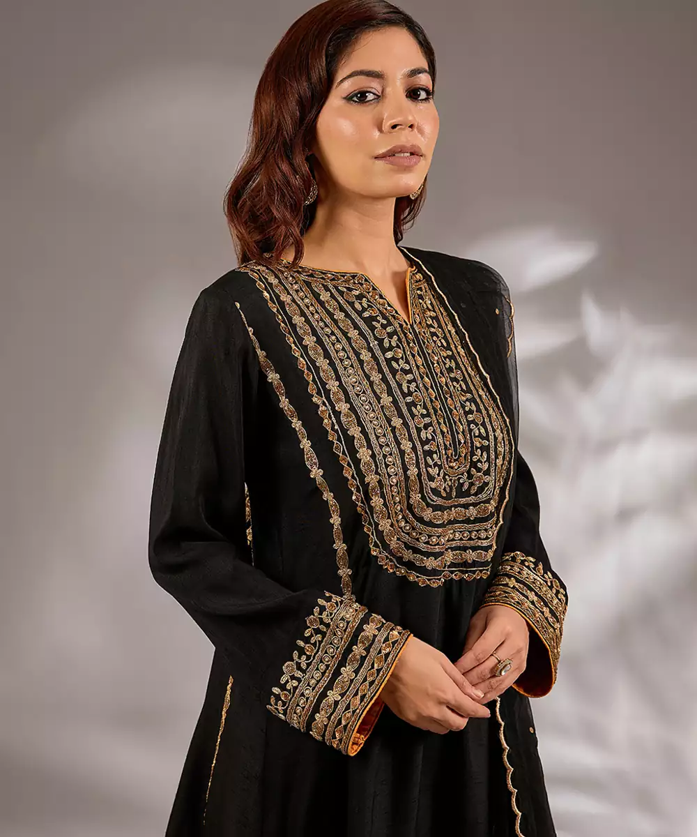 This Black Embroidered Silk Kurta Set Exudes Timeless Sophistication With Its Smooth, Luxurious Fabric And Graceful Drape. Intricate Embroidery Adds A Festive, Artisanal Touch, Enhancing Its Classic Ethnic Charm. Perfect For Weddings, Celebrations, And Special Occasions, It Blends Comfort With Elegance, Creating A Stylish And Refined Ensemble.