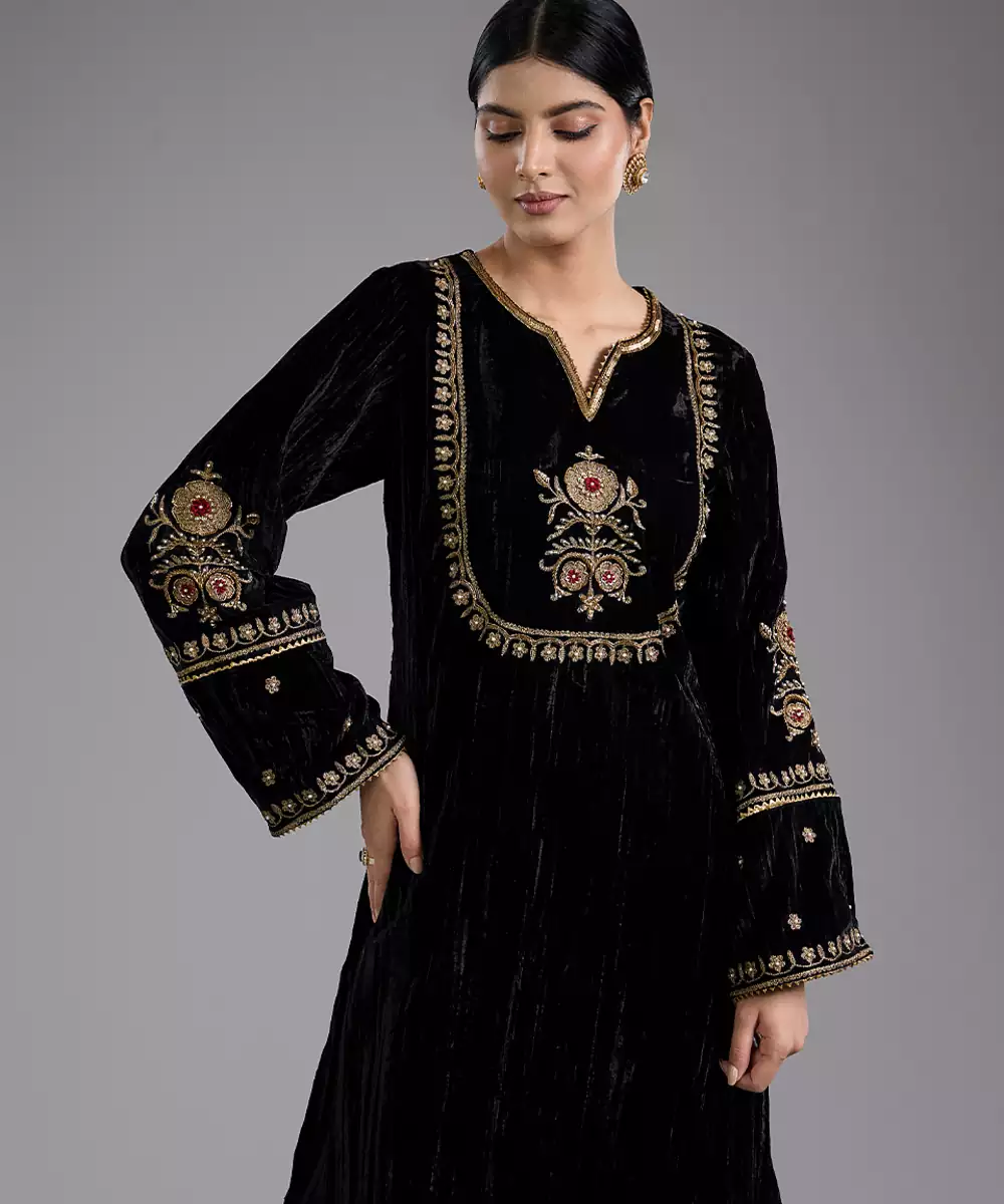 This Black Embroidered Velvet Kurta Set Exudes Luxurious Elegance With Its Rich, Plush Fabric And Graceful Drape. Intricate Embroidery Adds A Festive, Artisanal Touch, Enhancing Its Classic Ethnic Charm. Perfect For Weddings, Parties, And Special Occasions, It Blends Comfort With Sophistication, Creating A Stylish And Timeless Ensemble.
