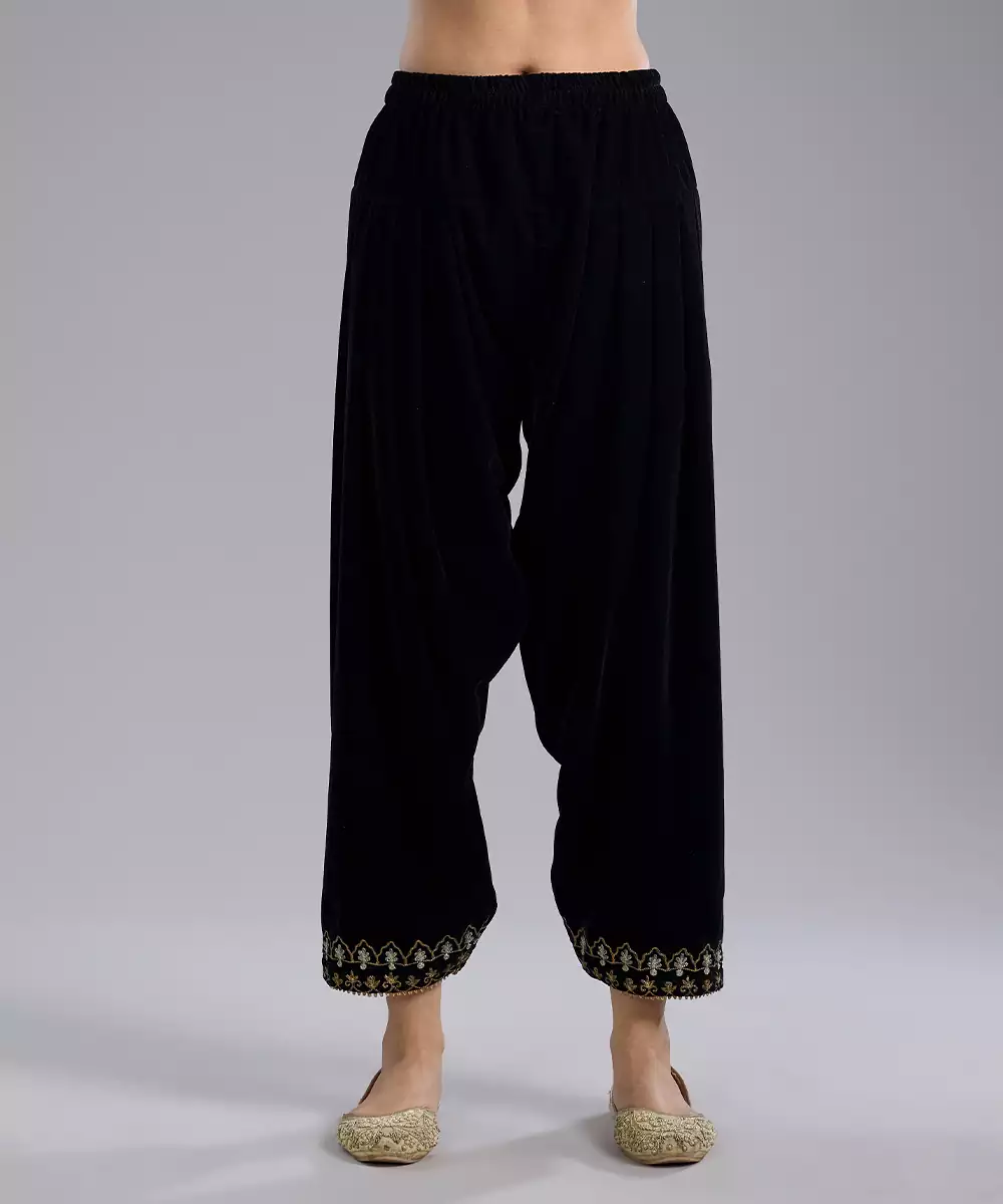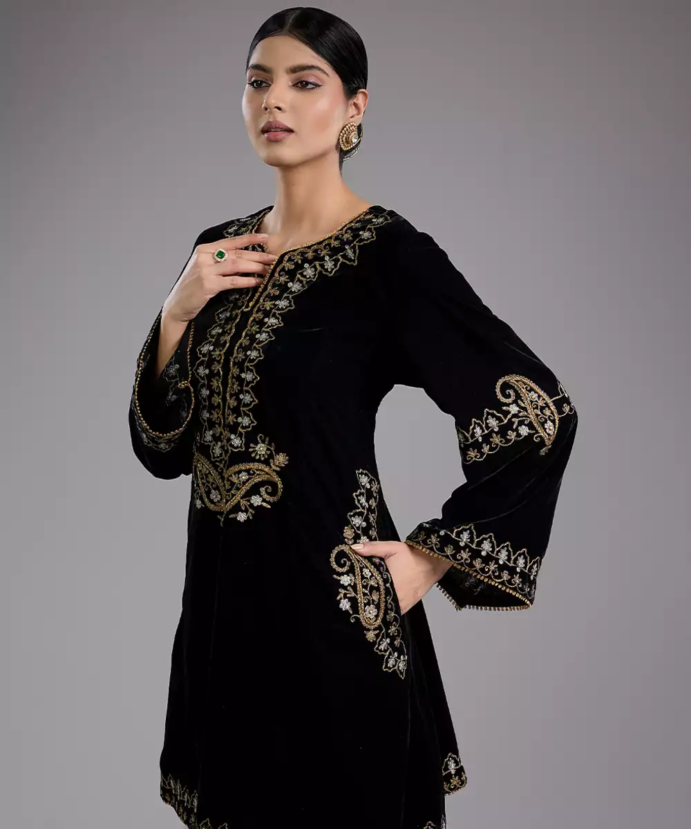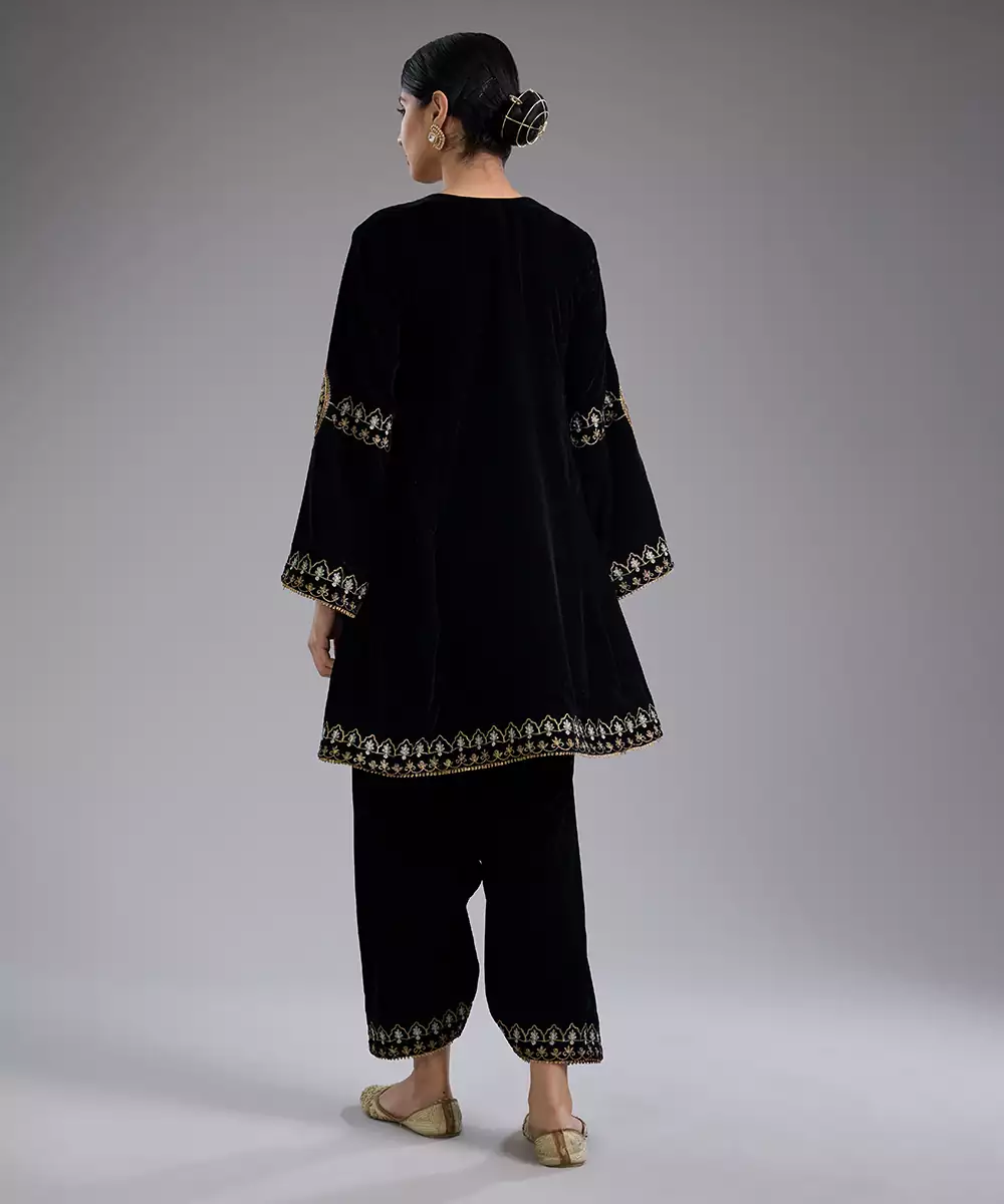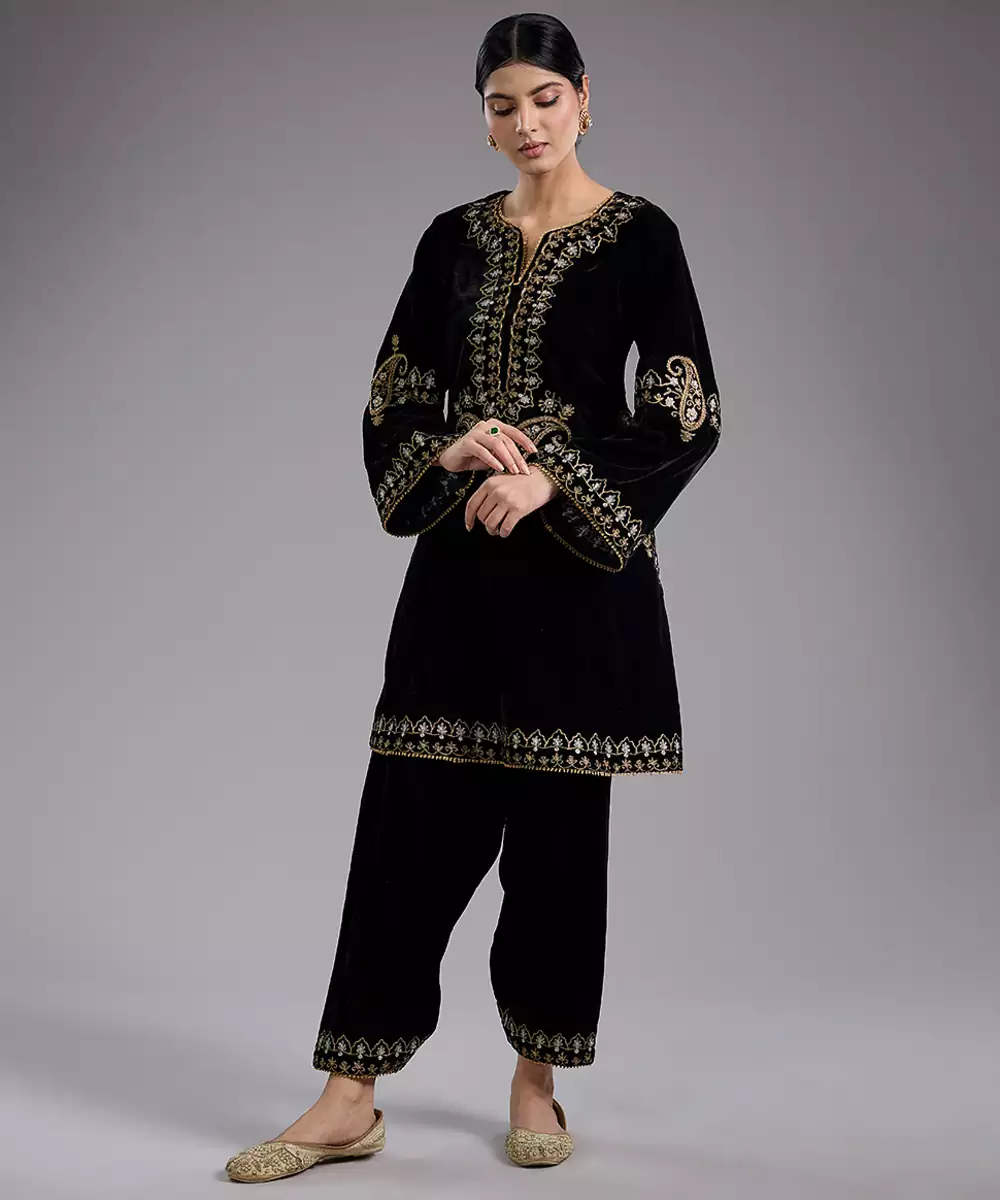 This Black Embroidered Velvet Kurta Set Exudes Luxurious Elegance With Its Rich, Plush Fabric And Graceful Drape. Intricate Embroidery Adds A Festive, Artisanal Touch, Enhancing Its Classic Ethnic Charm. Perfect For Weddings, Parties, And Special Occasions, It Blends Comfort With Sophistication, Creating A Stylish And Timeless Ensemble.