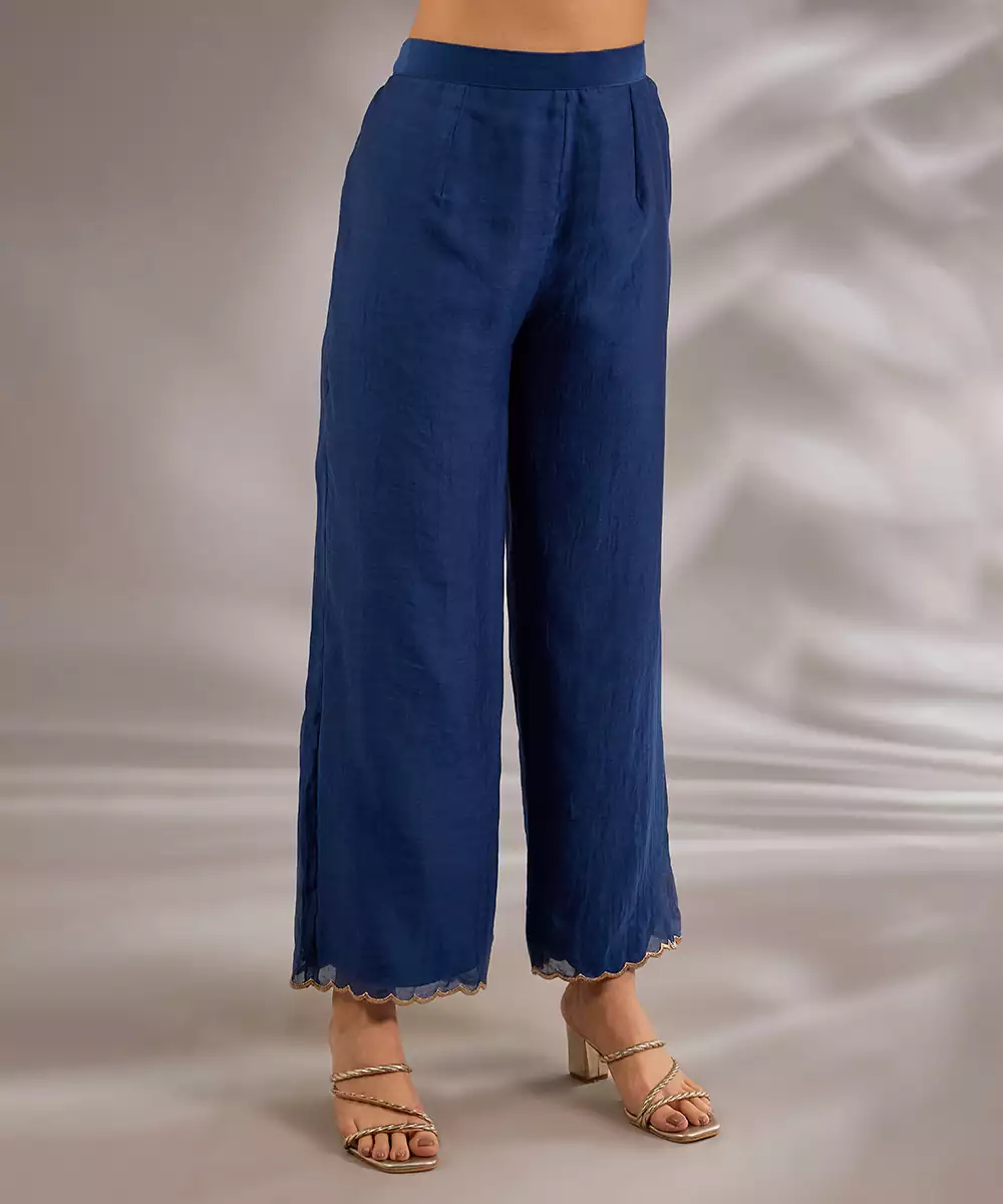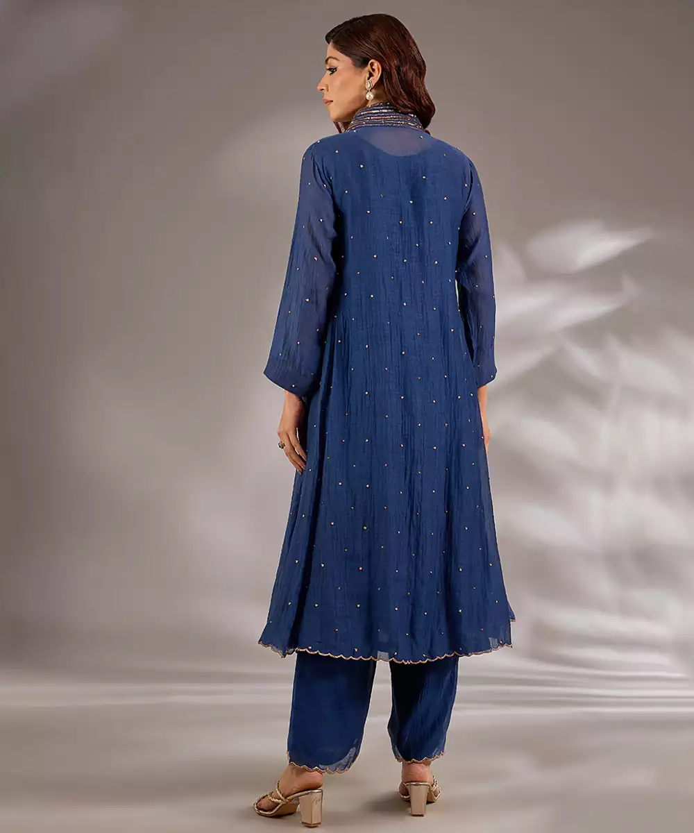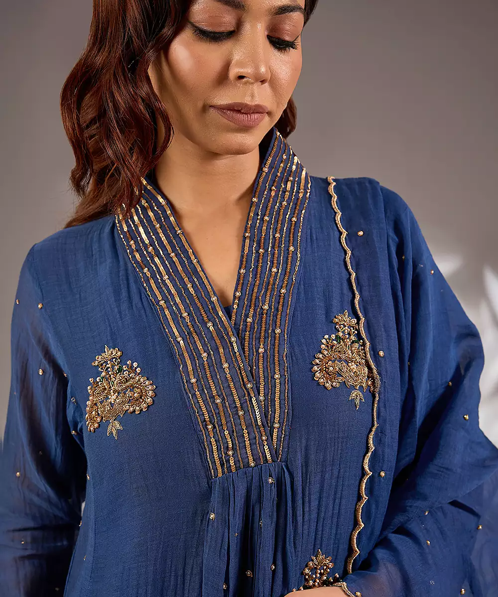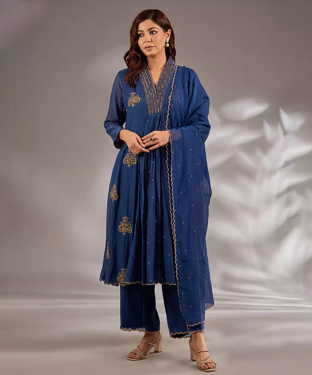 This Blue Embroidered Chanderi Kurta Set Radiates Graceful Charm With Its Lightweight, Airy Fabric And Flowing Drape. Intricate Embroidery Adds A Festive, Artisanal Touch, Enhancing Its Traditional Elegance. Perfect For Weddings, Celebrations, And Special Occasions, It Blends Comfort With Sophistication, Creating A Stylish And Timeless Ethnic Ensemble.