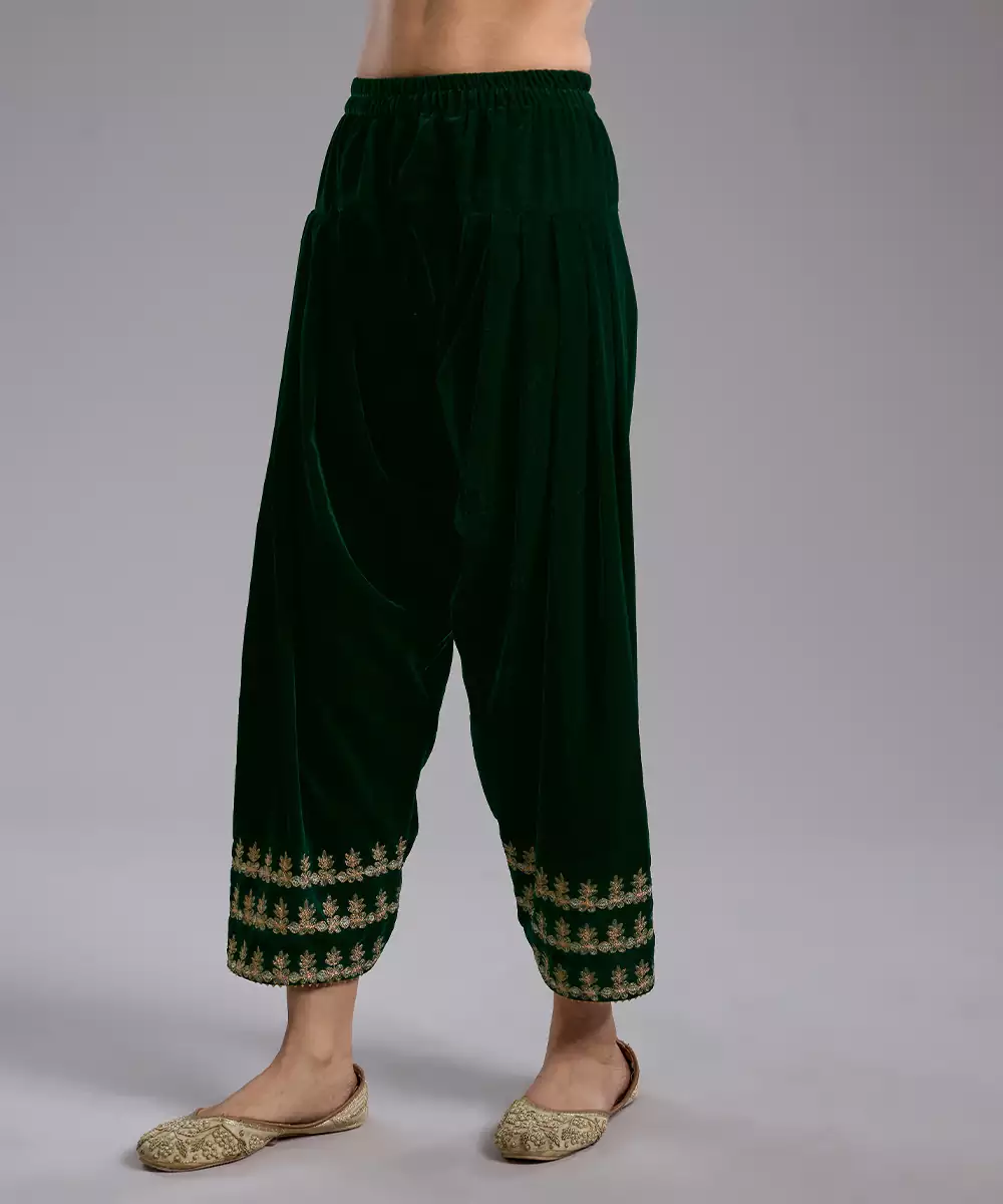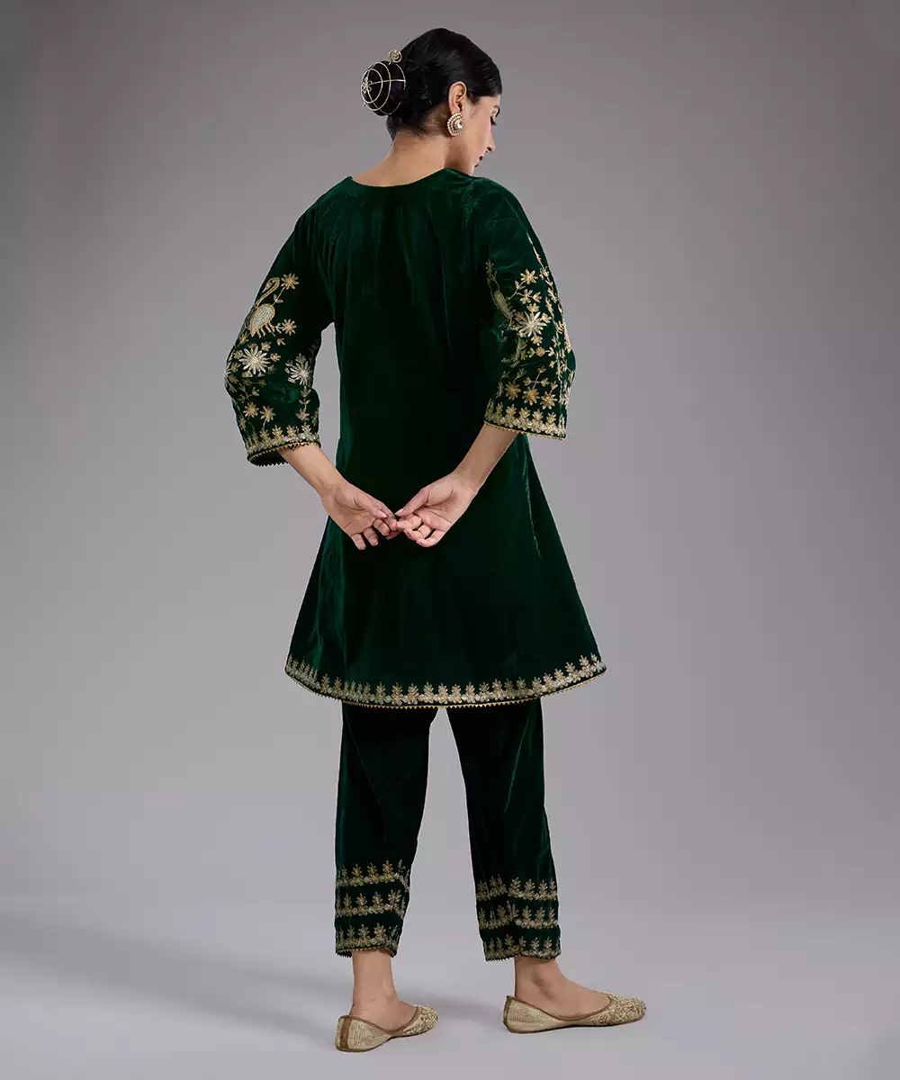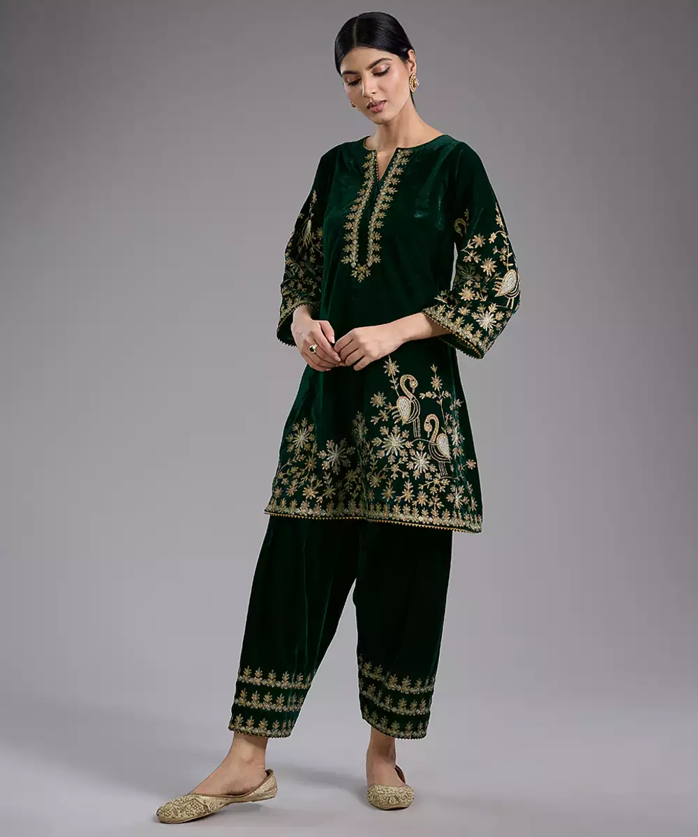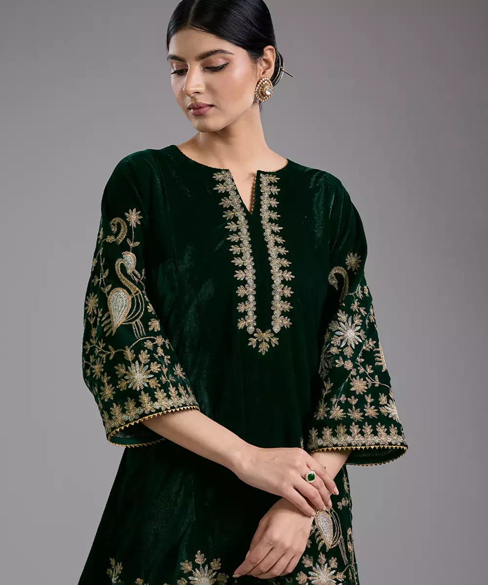 This Green Embroidered Velvet Kurta Set Exudes Luxurious Elegance With Its Rich, Plush Fabric And Graceful Drape. Intricate Embroidery Adds A Festive, Artisanal Touch, Enhancing Its Classic Ethnic Charm. Perfect For Weddings, Parties, And Special Occasions, It Blends Comfort With Sophistication, Creating A Stylish And Timeless Ensemble.
