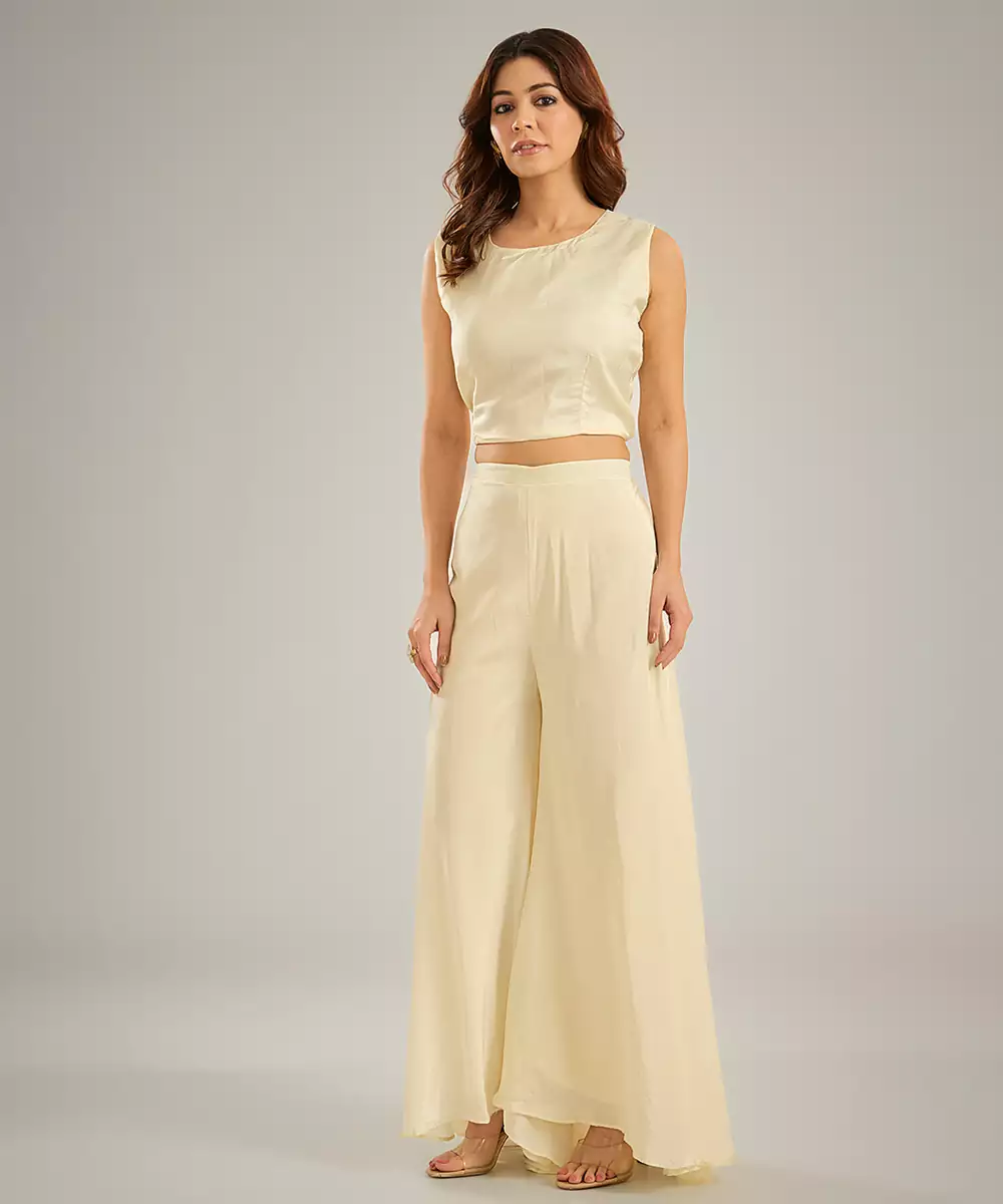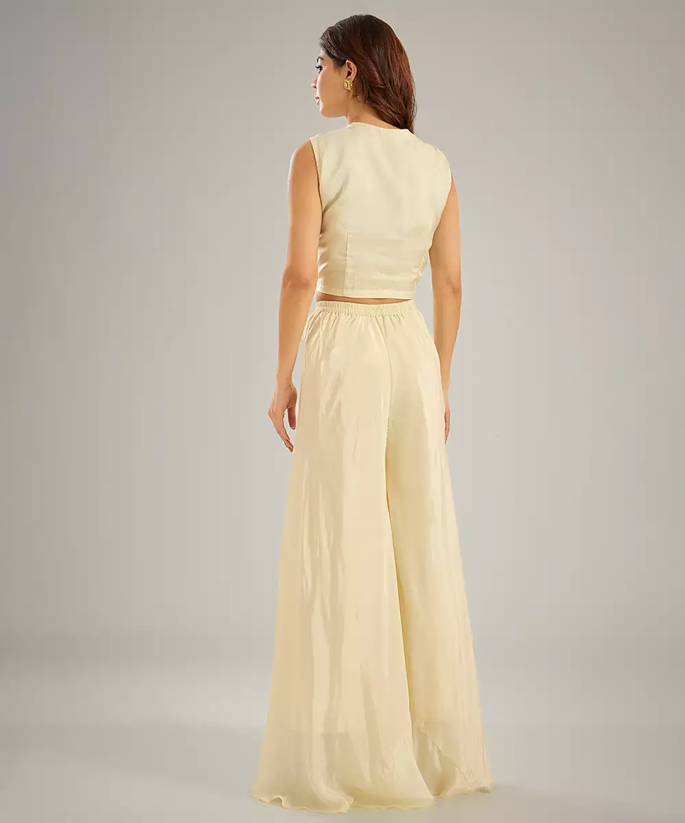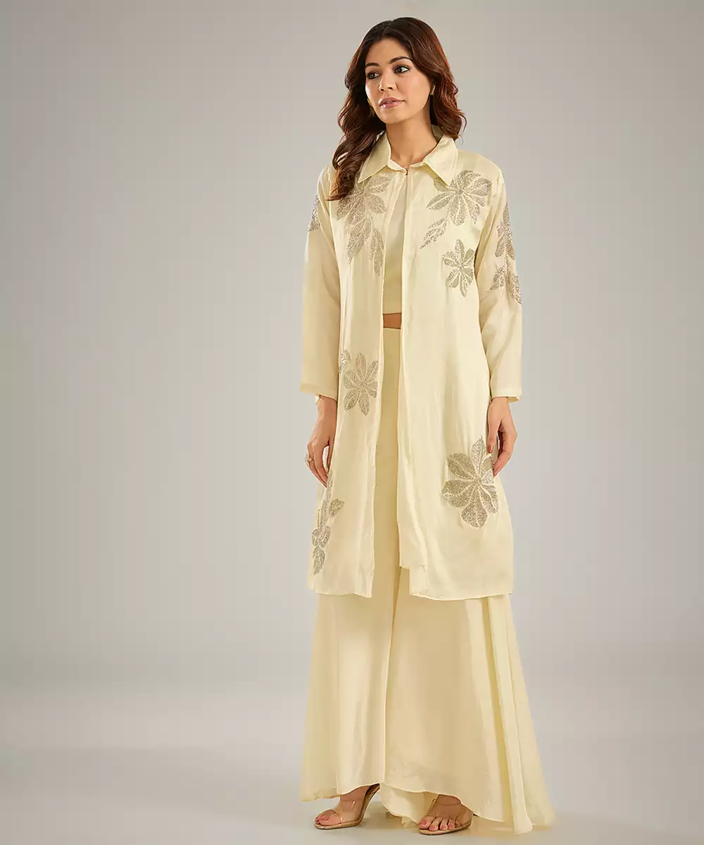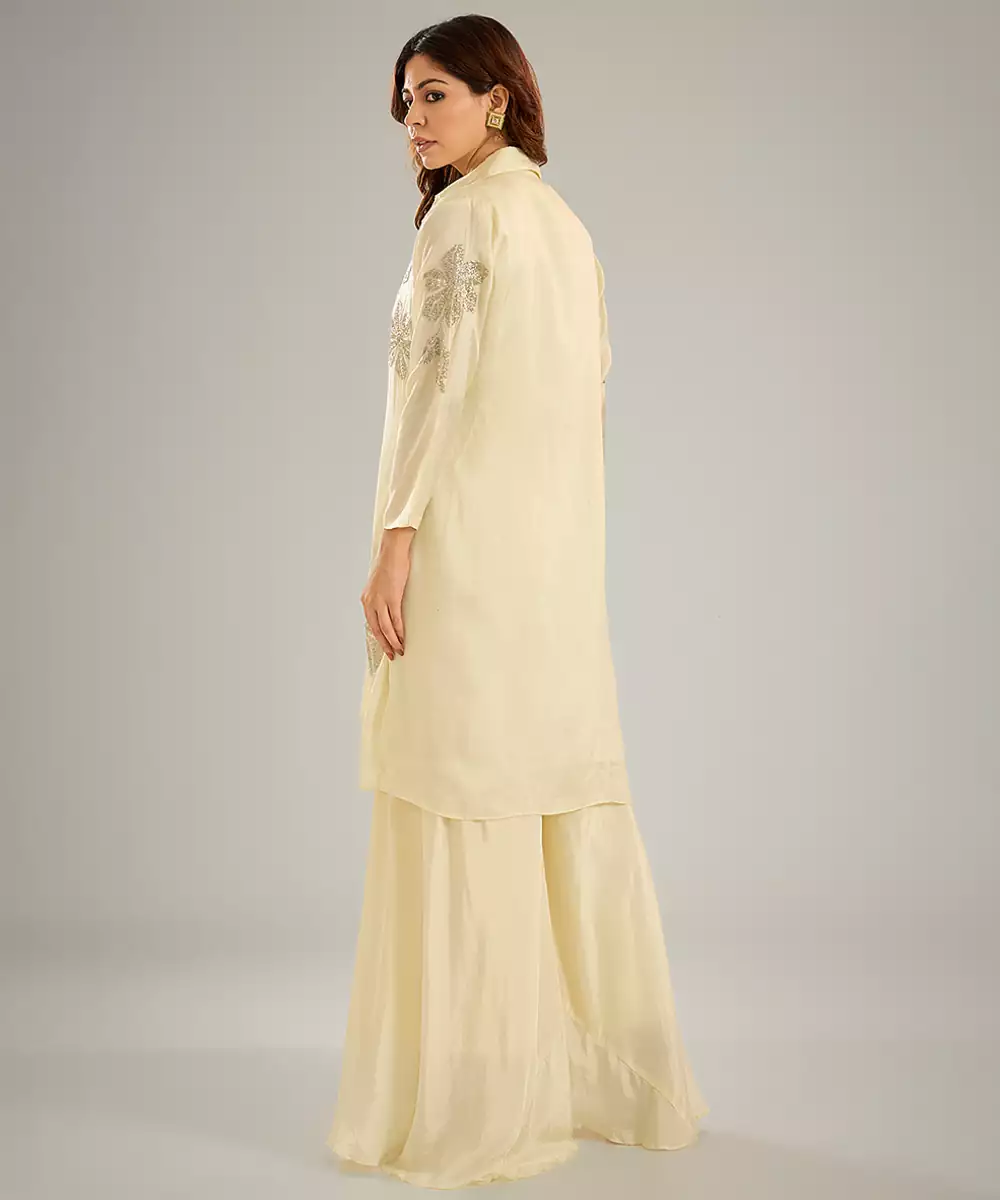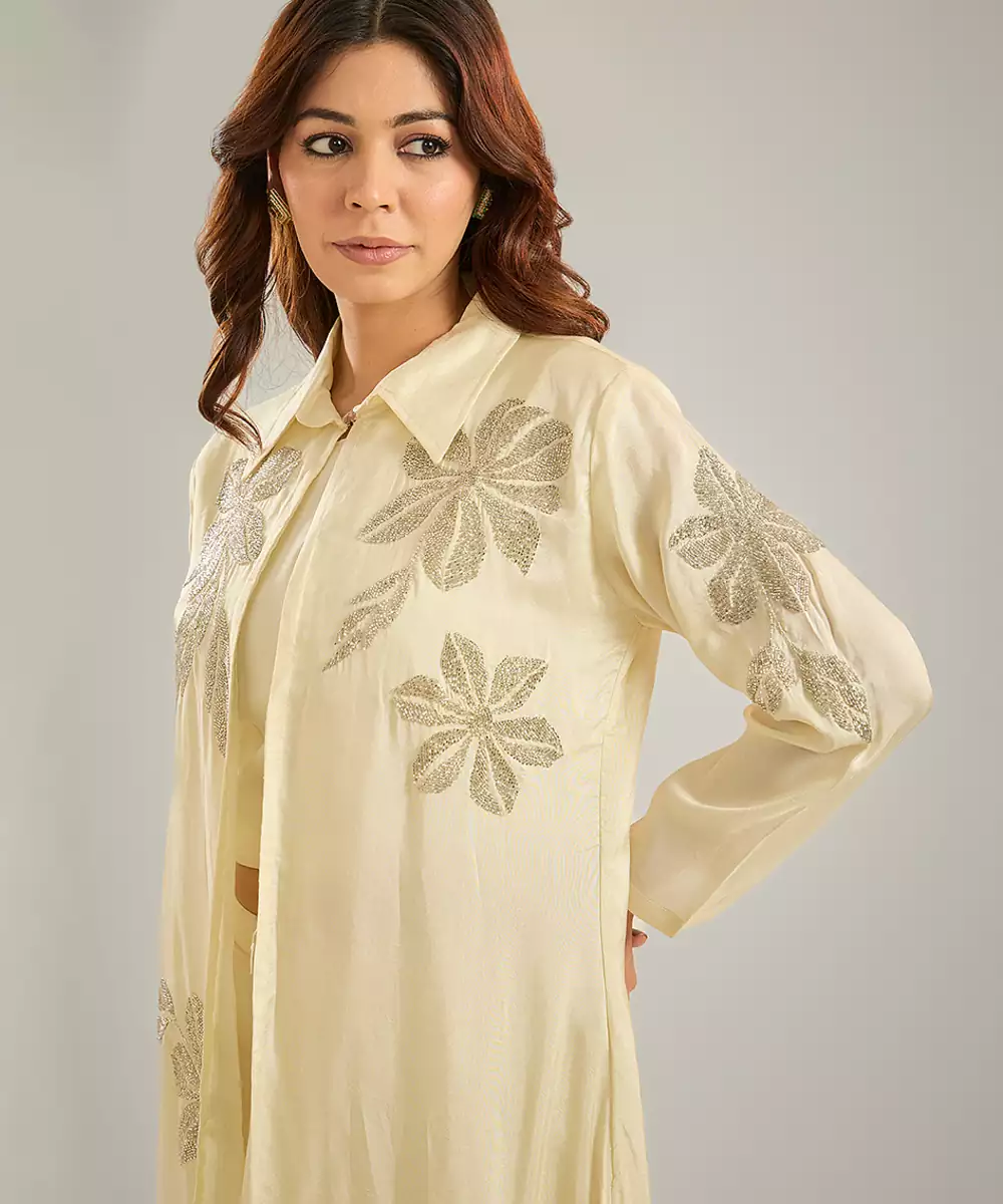 This Ivory Embroidered Silk Co Ord Set Radiates Effortless Sophistication With Its Smooth, Luxurious Fabric And Perfectly Coordinated Pieces. Intricate Embroidery Adds A Delicate, Festive Touch, Enhancing Its Modern Ethnic Charm. Ideal For Weddings, Parties, And Special Occasions, It Blends Comfort With Style, Creating A Chic And Timeless Ensemble.