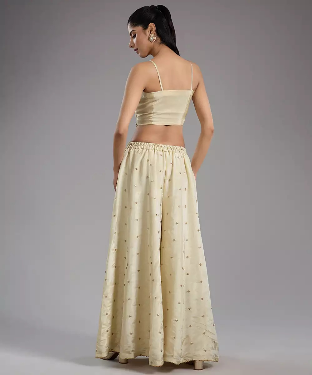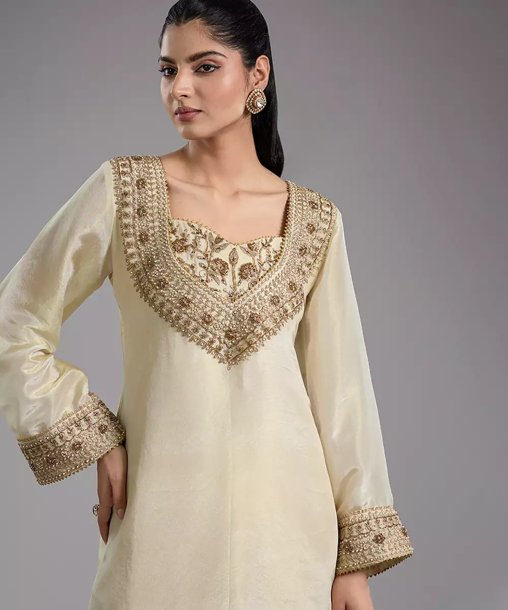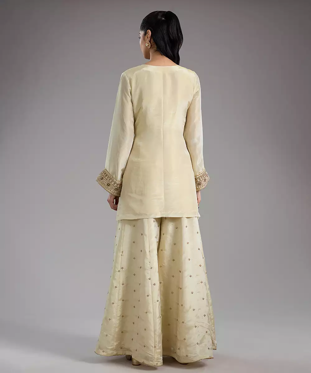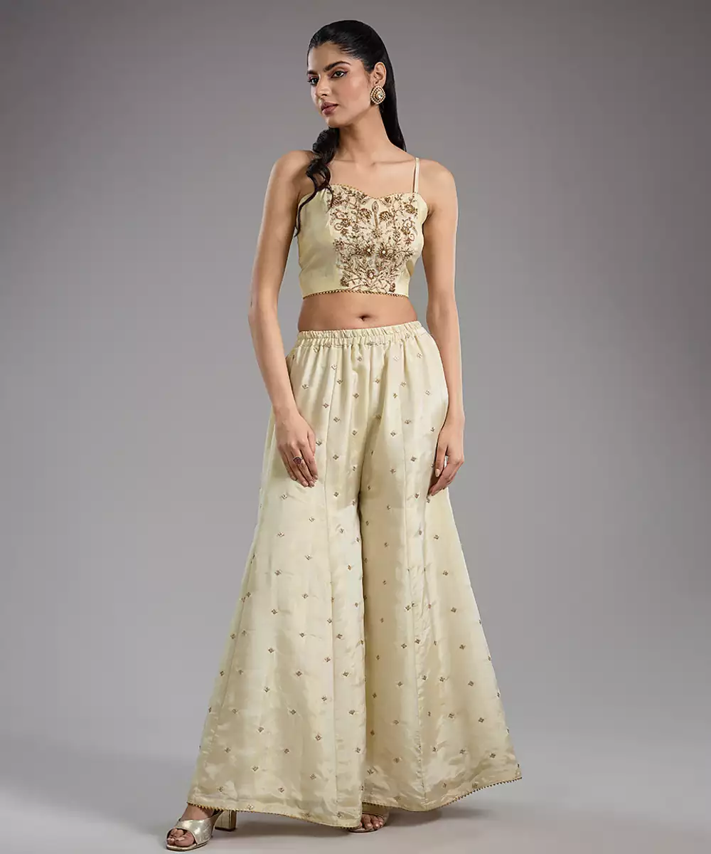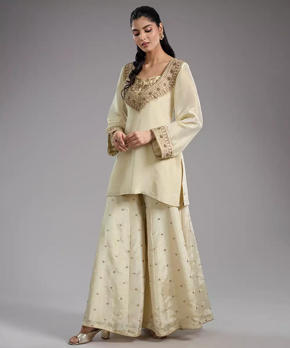 This Ivory Embroidered Tissue Sharara Set Exudes Timeless Elegance With Its Lightweight, Shimmery Fabric And Flared Silhouette. Delicate Embroidery Adds A Festive, Artisanal Touch, Enhancing Its Classic Ethnic Charm. Perfect For Weddings, Parties, And Special Occasions, It Blends Comfort With Sophistication, Creating A Stylish And Refined Ensemble.