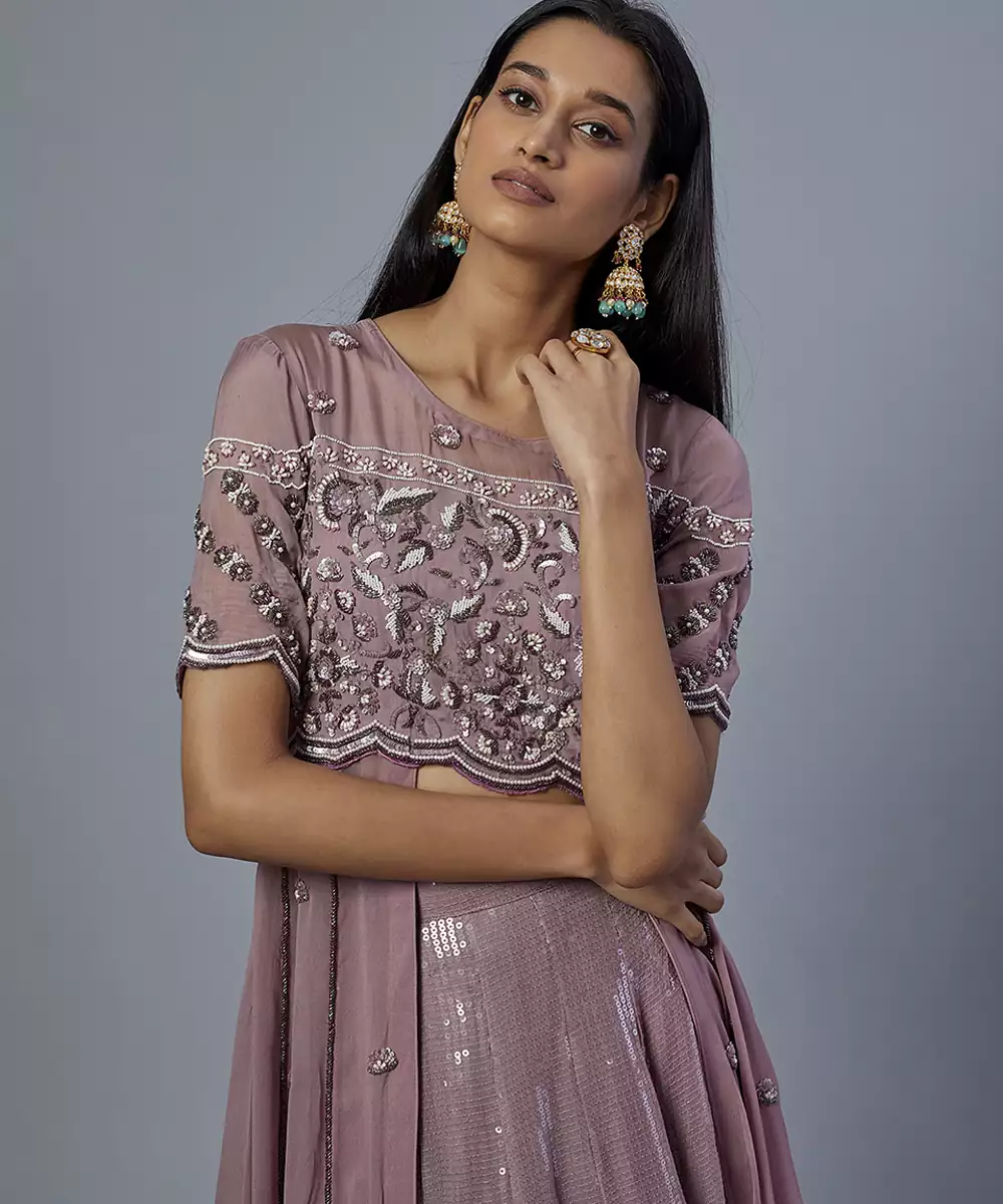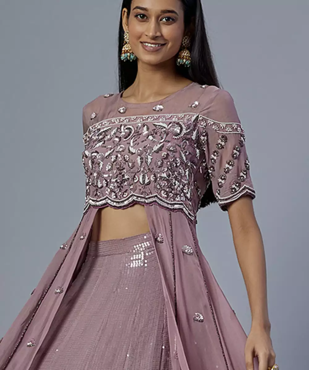 This Lavender Embroidered Organza Lehenga Set Radiates Dreamy Elegance With Its Lightweight, Sheer Fabric And Beautifully Flared Silhouette. Intricate Embroidery Adds A Delicate, Festive Touch, Enhancing Its Ethereal Charm. Perfect For Weddings, Celebrations, And Special Occasions, It Blends Comfort With Sophistication, Creating A Stylish And Timeless Ethnic Ensemble.