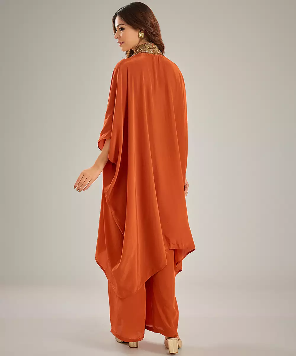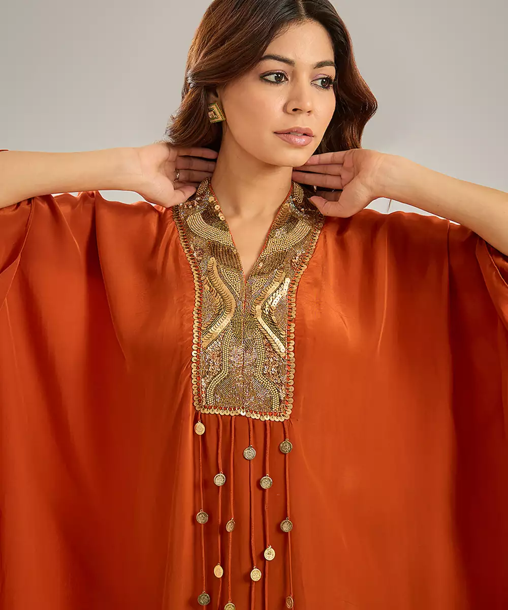 This Orange Embroidered Crepe Kaftan Set Radiates Vibrant Elegance With Its Flowing, Lightweight Fabric And Relaxed, Graceful Silhouette. Delicate Embroidery Adds A Festive, Artistic Touch, Enhancing Its Traditional Charm. Perfect For Weddings, Celebrations, And Special Occasions, It Blends Comfort With Sophistication, Creating A Stylish And Timeless Ethnic Ensemble.