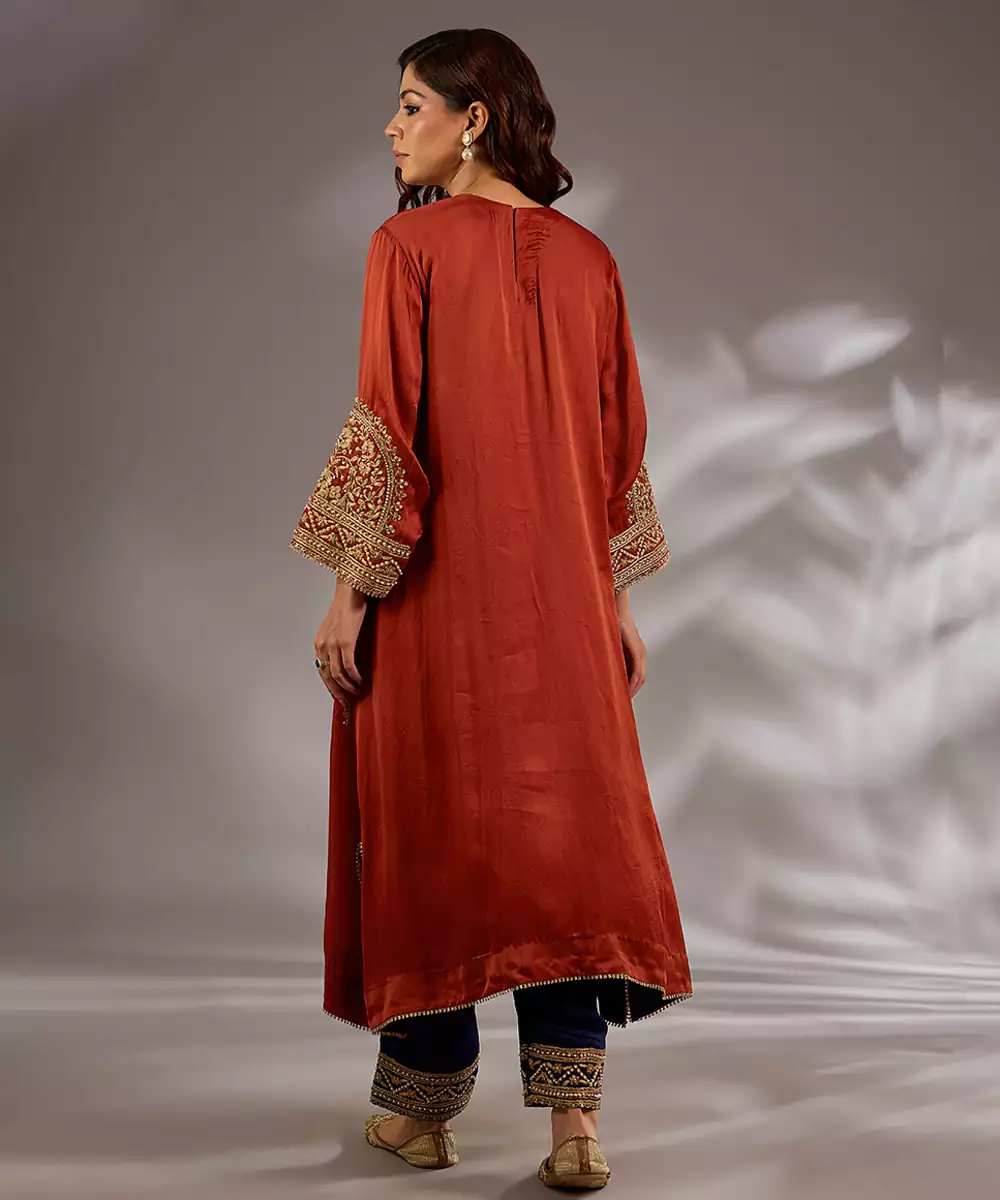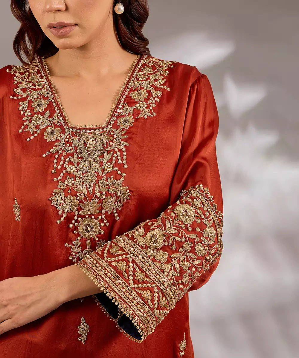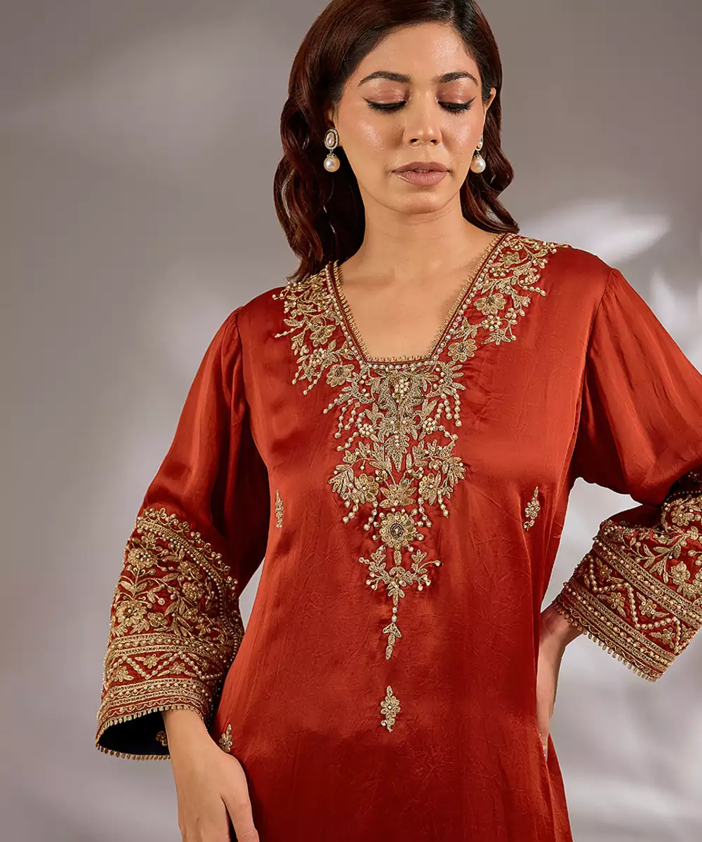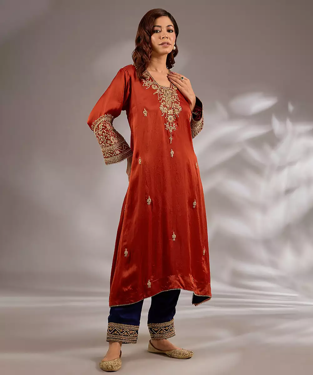 This Orange Embroidered Satin Kurta Set Radiates Vibrant Elegance With Its Smooth, Lustrous Fabric And Graceful Drape. Intricate Embroidery Adds A Festive, Artisanal Touch, Enhancing Its Traditional Charm. Perfect For Weddings, Celebrations, And Special Occasions, It Blends Comfort With Sophistication, Creating A Stylish And Timeless Ethnic Ensemble.