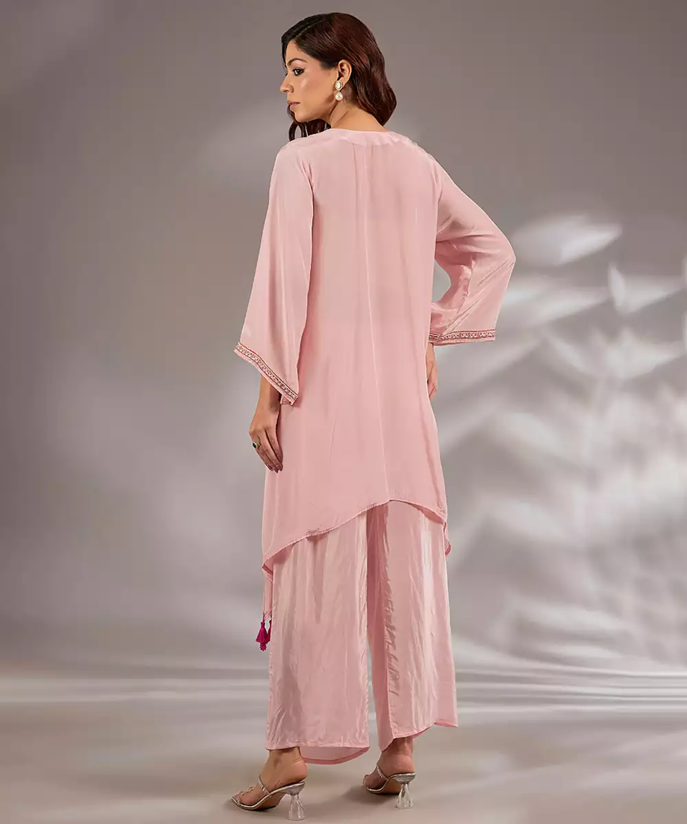 This Pink Embroidered Crepe Kurta Set Radiates Feminine Elegance With Its Lightweight, Flowing Fabric And Graceful Drape. Intricate Embroidery Adds A Festive, Artisanal Touch, Enhancing Its Traditional Charm. Perfect For Weddings, Celebrations, And Special Occasions, It Blends Comfort With Sophistication, Creating A Stylish And Timeless Ethnic Ensemble.