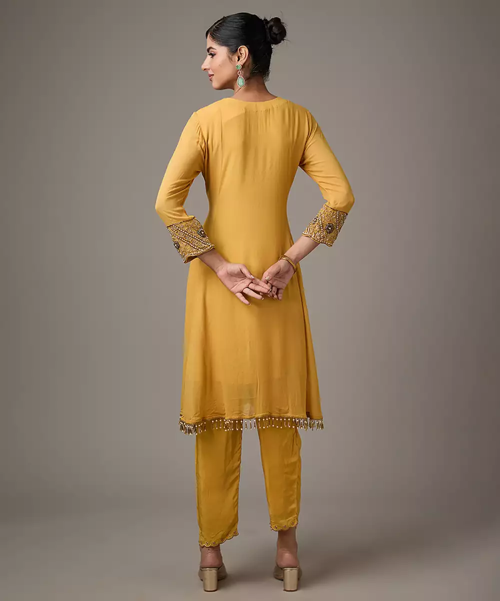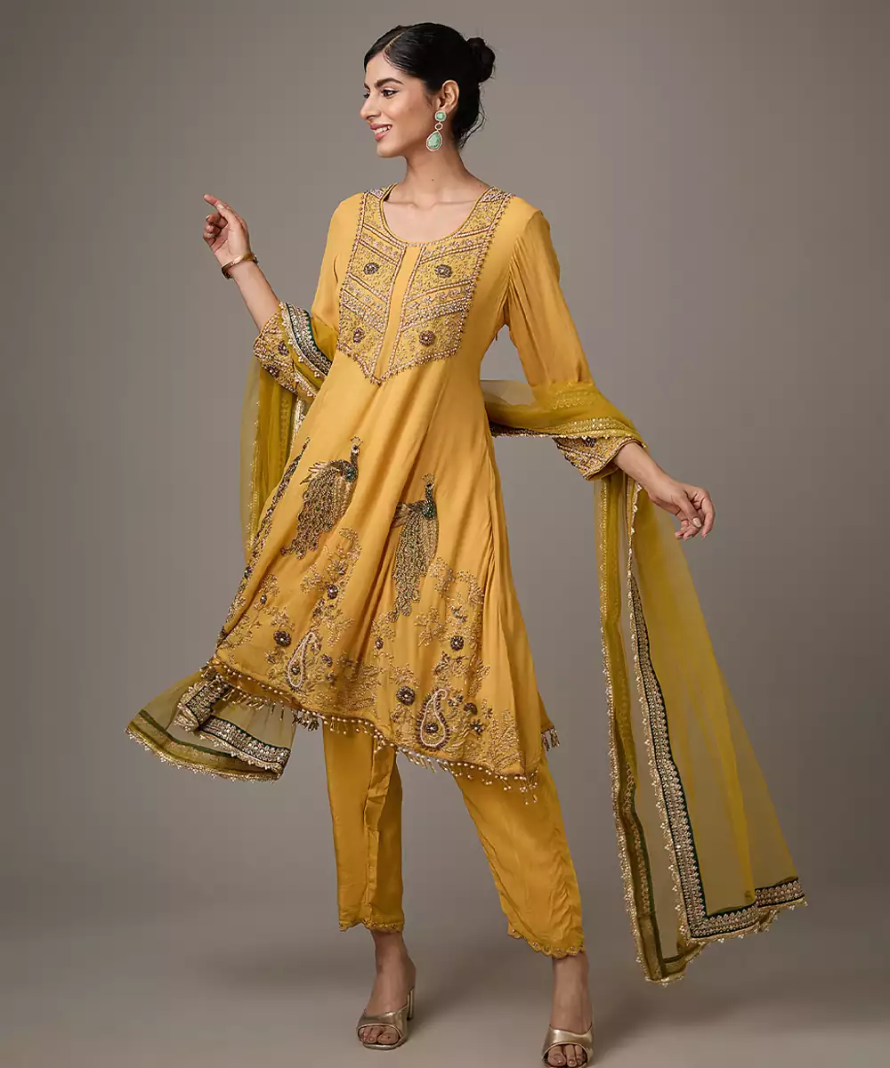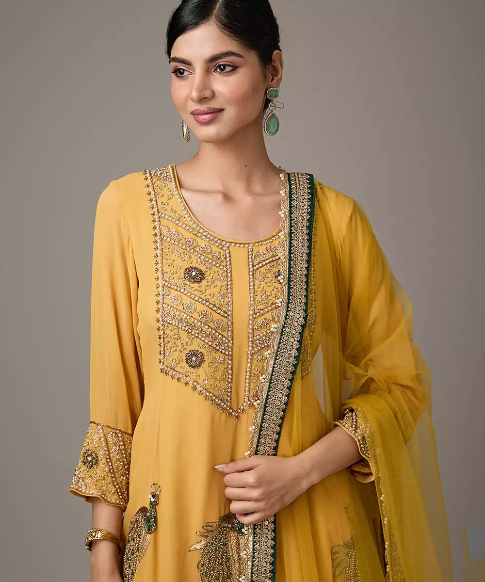 This Yellow Embroidered Net Anarkali Shines With Vibrant Elegance And A Light, Ethereal Flow. Delicate Embroidery Enhances Its Graceful Silhouette, Adding Festive Charm. Perfect For Weddings, Sangeet, And Celebratory Occasions, It Blends Traditional Beauty With Contemporary Refinement, Creating A Radiant And Sophisticated Look Ideal For Day Or Evening Events.