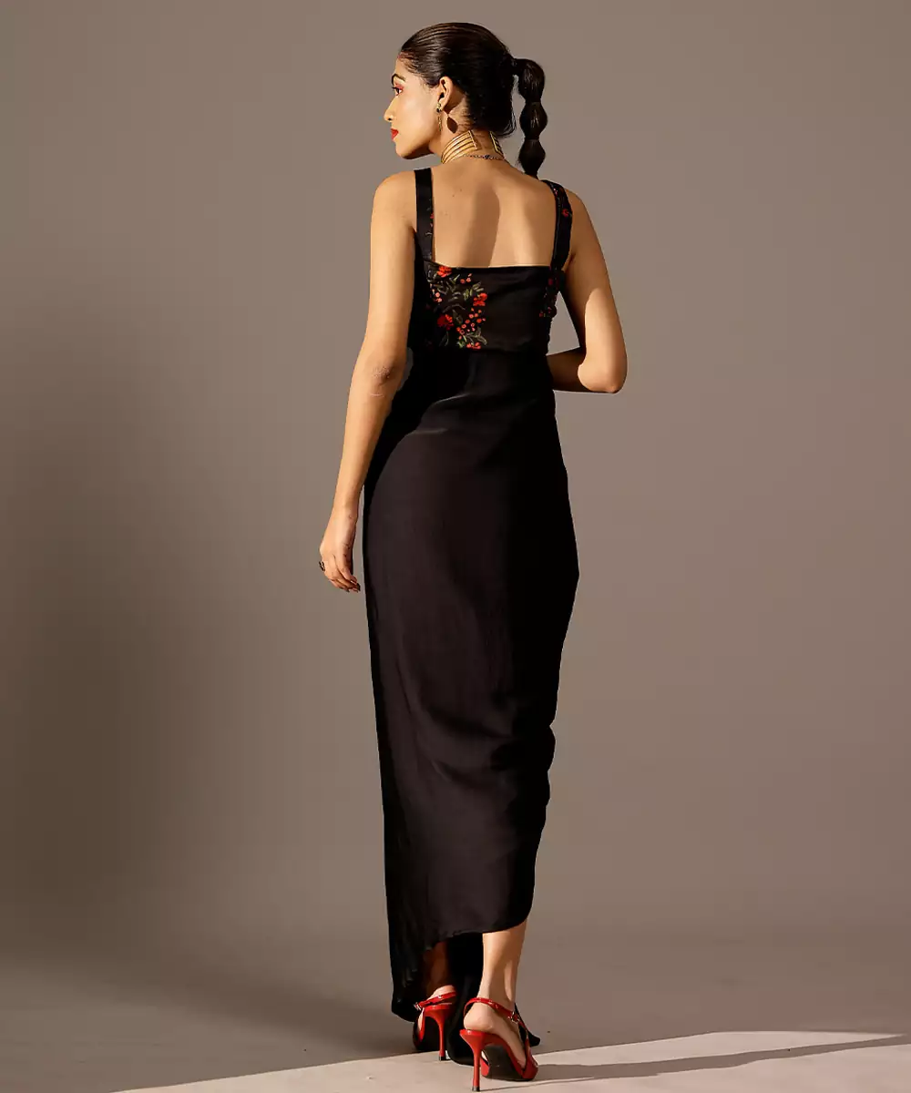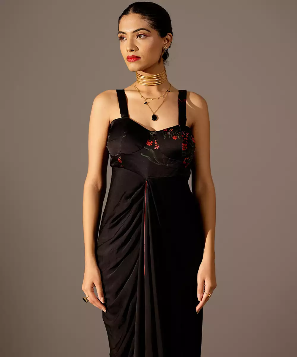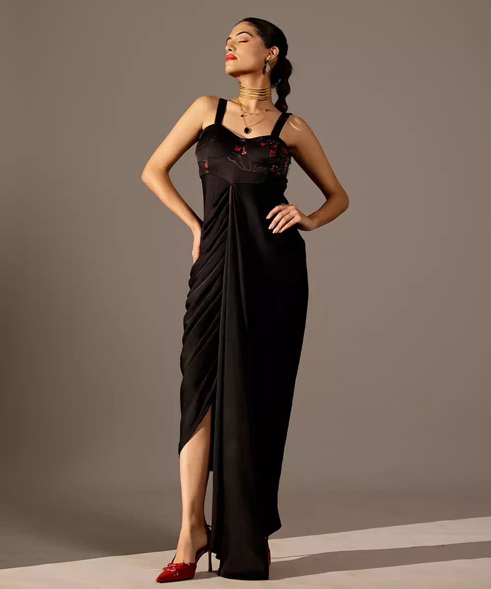 This Black Printed Georgette Gown Radiates Graceful Charm With Its Vibrant Hue And Flowing Silhouette. The Lightweight Georgette Fabric Drapes Beautifully, While The Delicate Prints Add A Touch Of Artistic Elegance. Perfect For Celebrations, Evening Events, And Festive Gatherings, It Blends Comfort With Effortless Sophistication For A Standout Look.