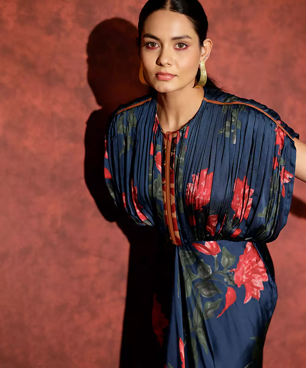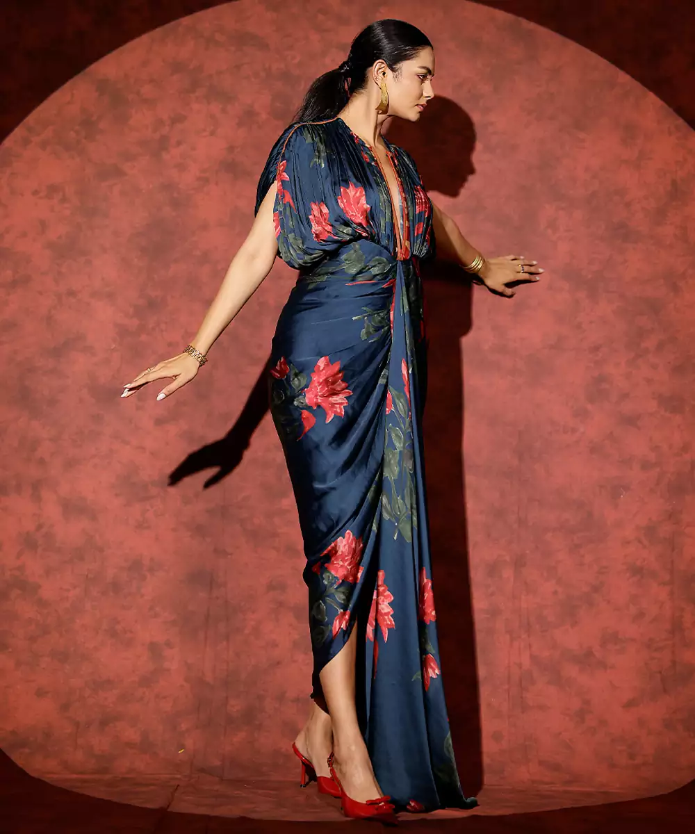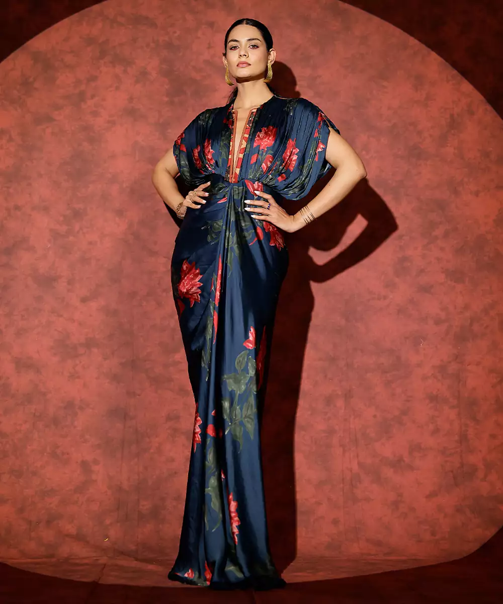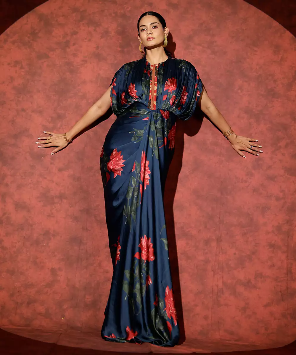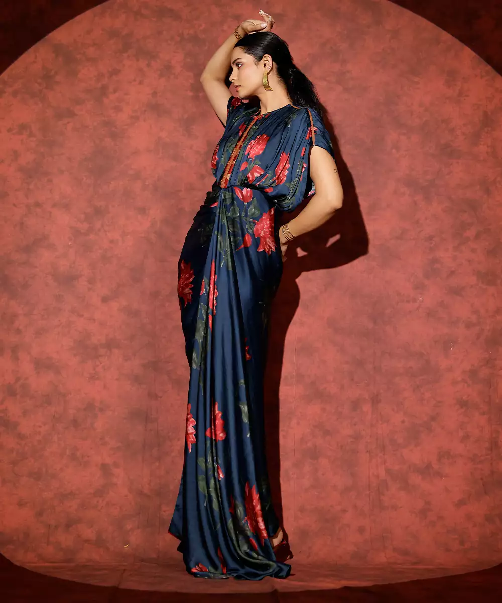 This Blue Printed Georgette Gown Radiates Graceful Charm With Its Vibrant Hue And Flowing Silhouette. The Lightweight Georgette Fabric Drapes Beautifully, While The Delicate Prints Add A Touch Of Artistic Elegance. Perfect For Celebrations, Evening Events, And Festive Gatherings, It Blends Comfort With Effortless Sophistication For A Standout Look.