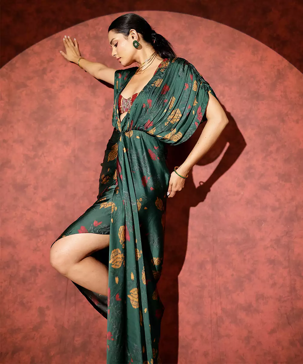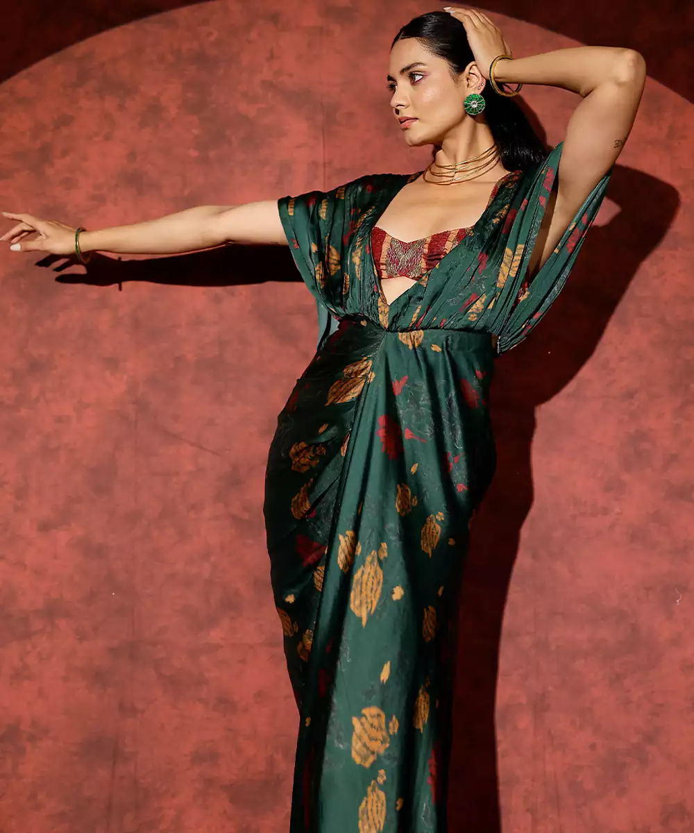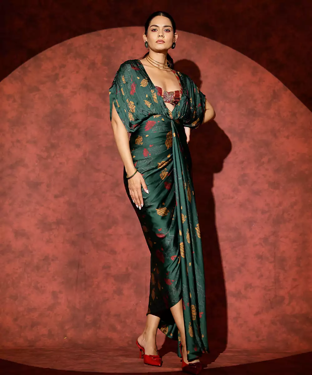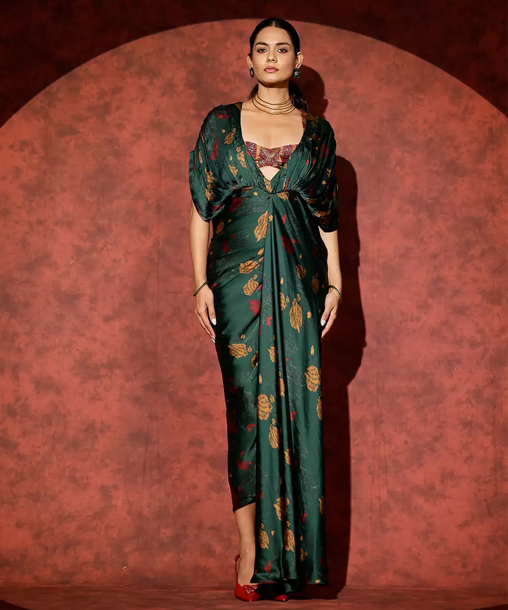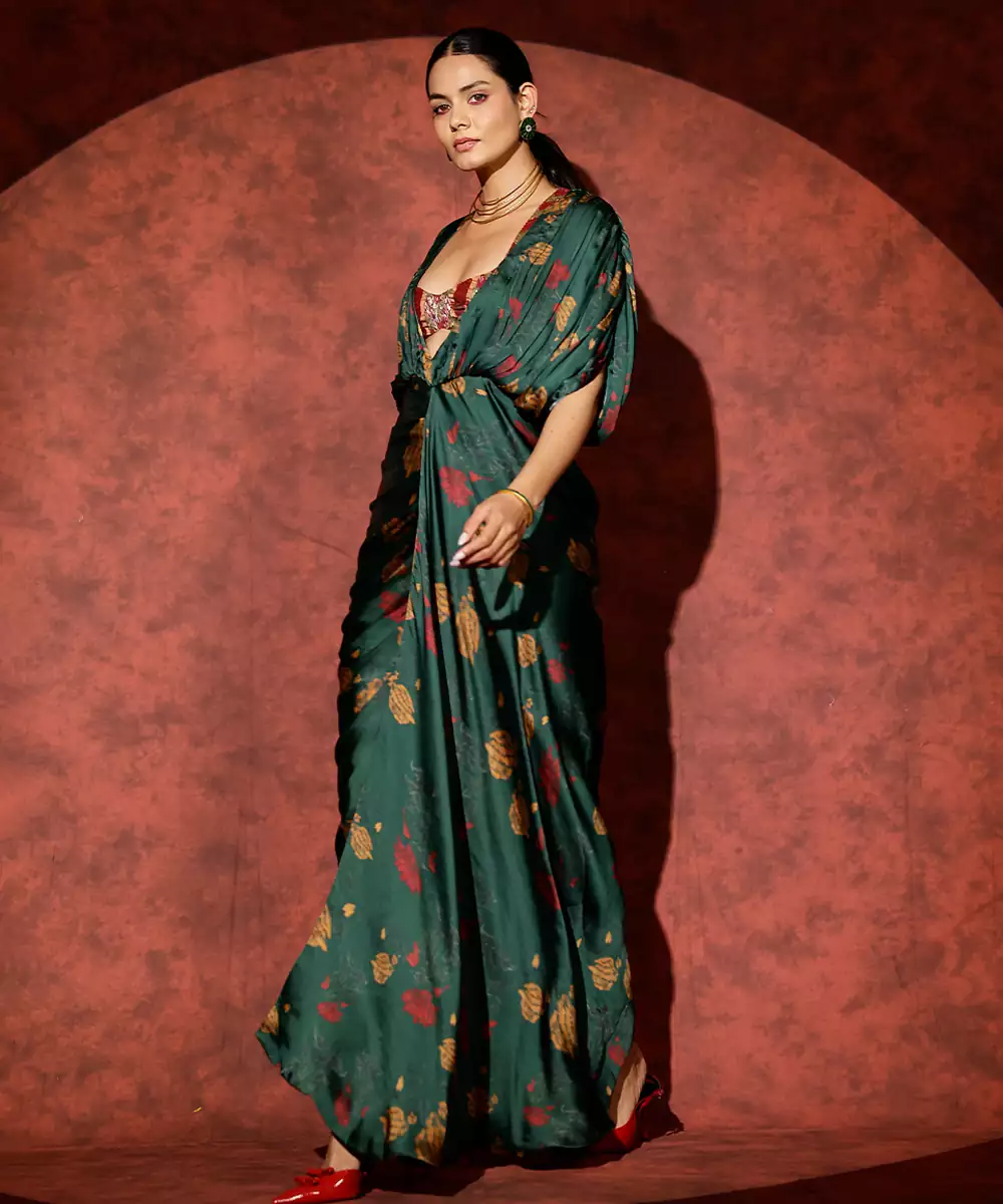 This Green Printed Georgette Gown Radiates Graceful Charm With Its Vibrant Hue And Flowing Silhouette. The Lightweight Georgette Fabric Drapes Beautifully, While The Delicate Prints Add A Touch Of Artistic Elegance. Perfect For Celebrations, Evening Events, And Festive Gatherings, It Blends Comfort With Effortless Sophistication For A Standout Look.