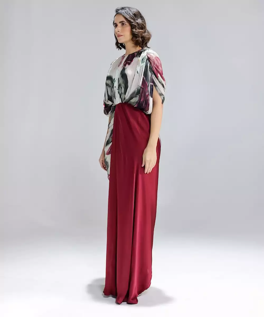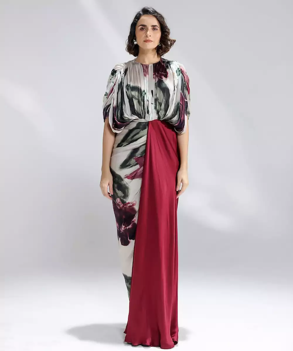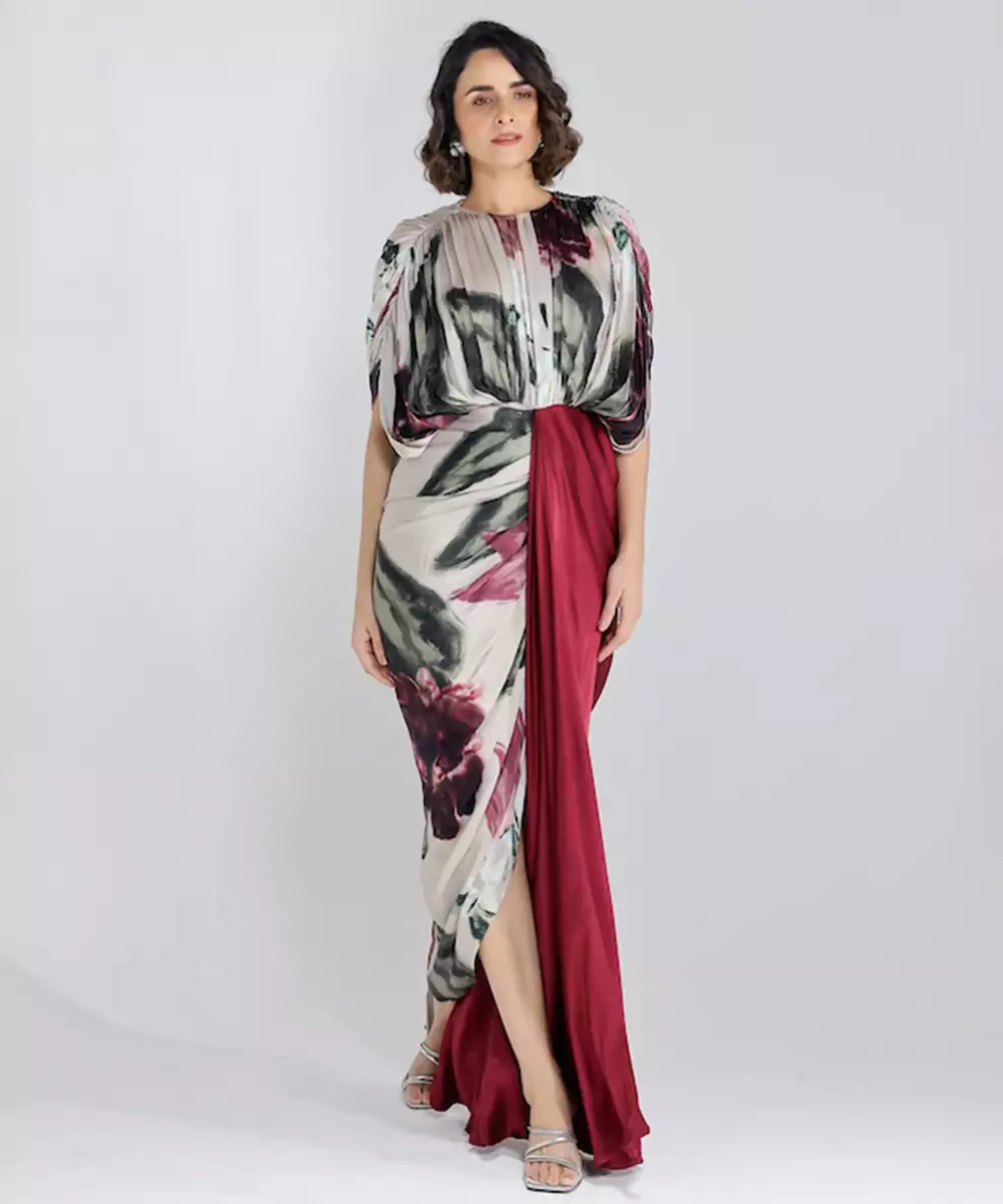 This Multicolor Printed Georgette Gown Radiates Vibrant Elegance With Its Flowing Silhouette And Lightweight, Airy Drape. The Lively Prints Add A Festive, Artistic Charm, Creating A Striking Yet Graceful Look. Perfect For Celebrations, Evening Events, And Special Occasions, It Blends Comfort With Contemporary Sophistication For An Effortlessly Stylish Ensemble.