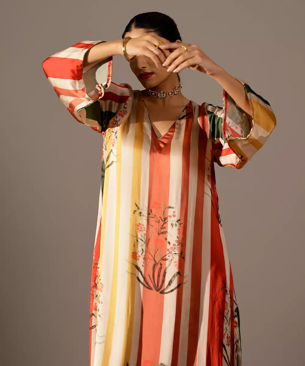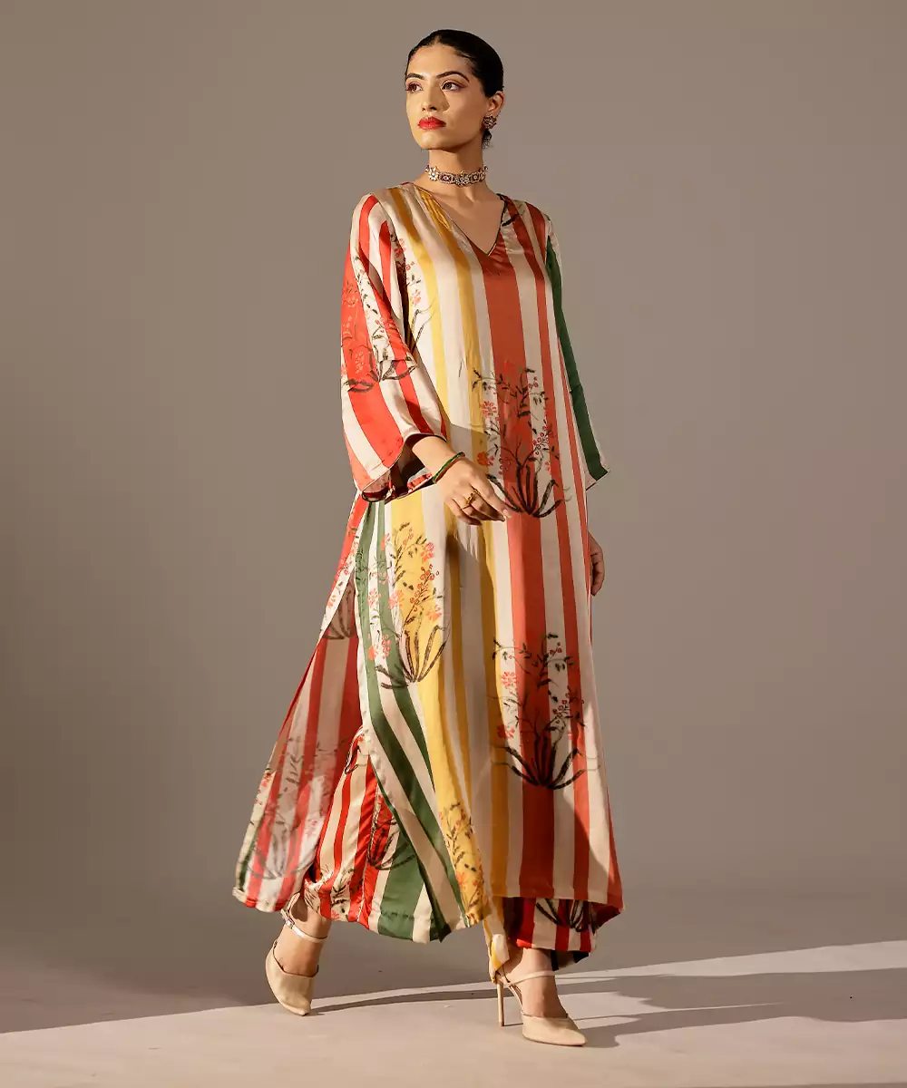 This Multicolor Printed Georgette Kurta Set Exudes Breezy Elegance With Its Vibrant Patterns And Fluid Drape. The Lightweight Georgette Fabric Offers All Day Comfort, While The Lively Prints Add A Festive, Artistic Touch. Perfect For Daytime Events, Celebrations, And Casual Gatherings, It Blends Effortless Style With Modern Sophistication For A Chic Ethnic Look.