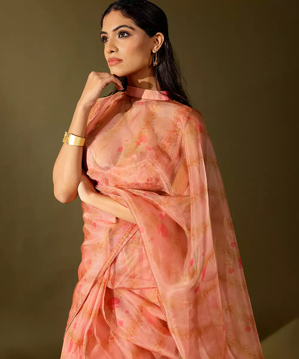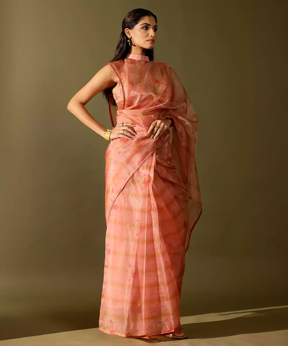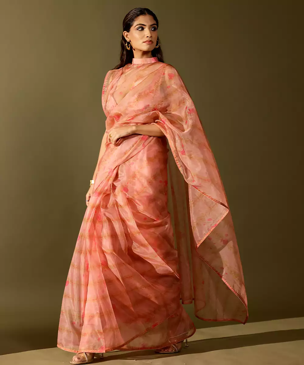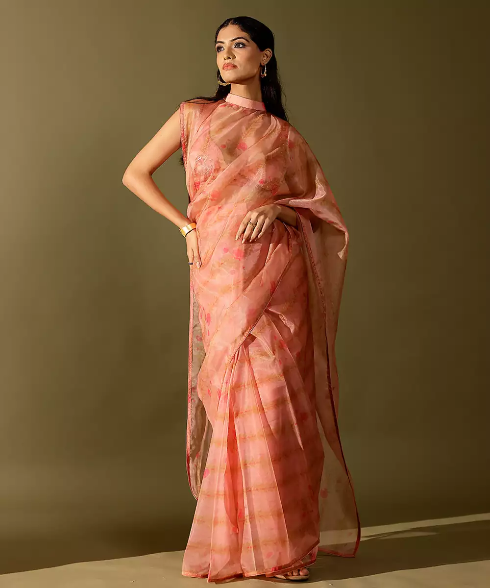 This Pink Printed Organza Saree Exudes Delicate Elegance With Its Sheer, Lightweight Texture And Graceful Drape. The Soft Pink Hue Paired With Artistic Prints Adds A Romantic, Festive Charm. Perfect For Celebrations, Daytime Events, And Special Occasions, It Blends Sophistication With Effortless Style For A Beautifully Refined Look.