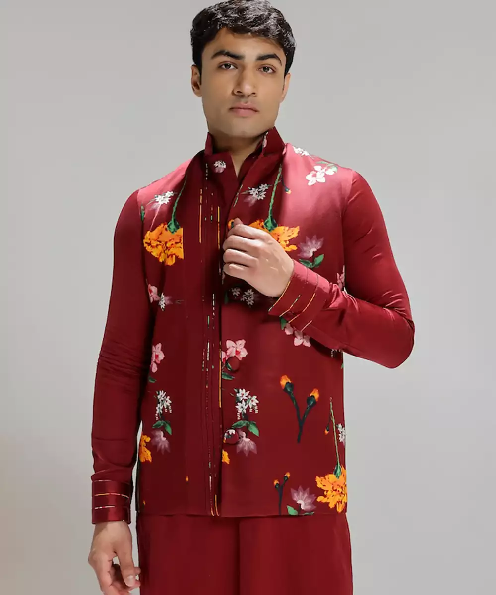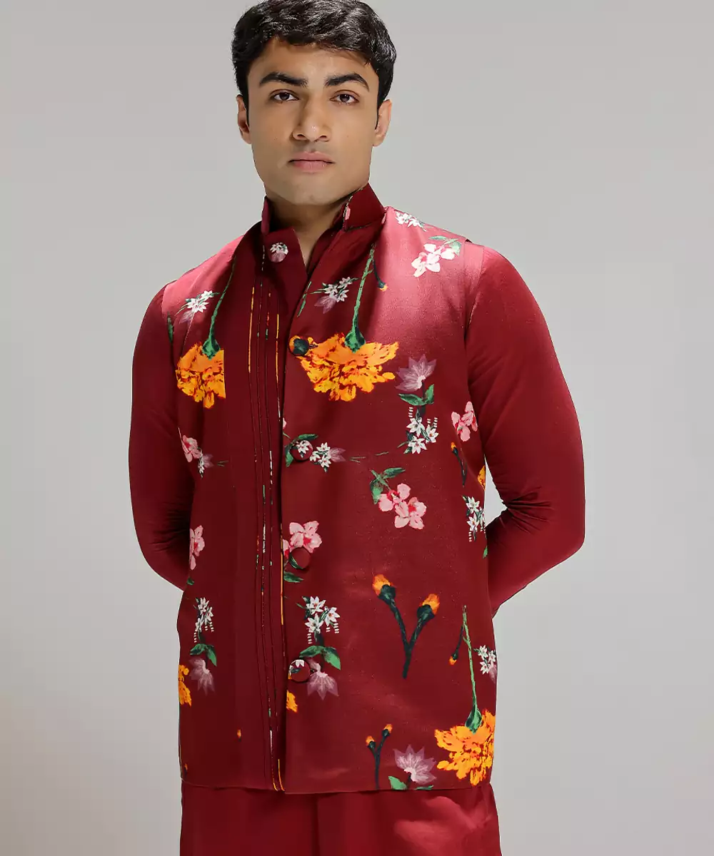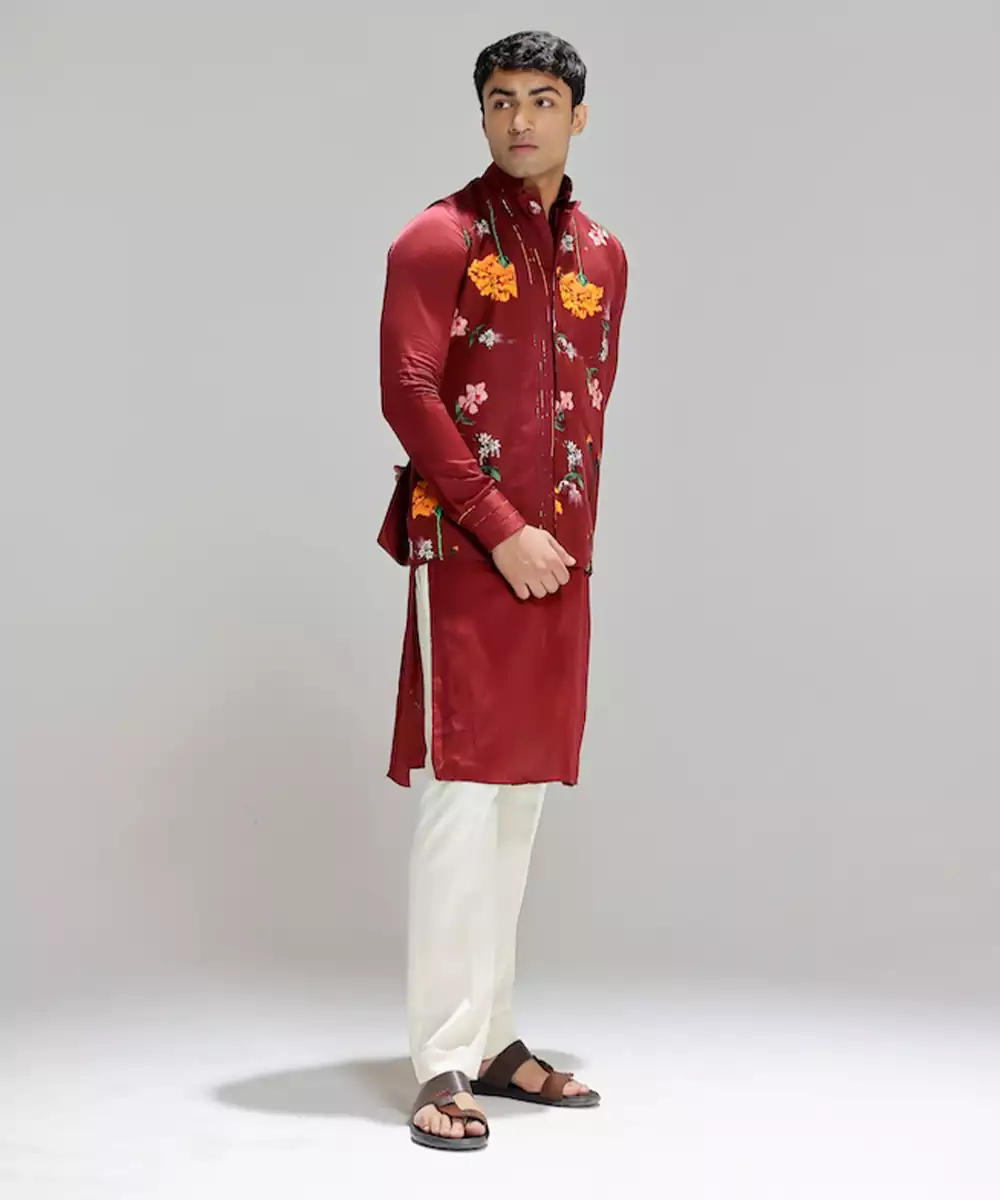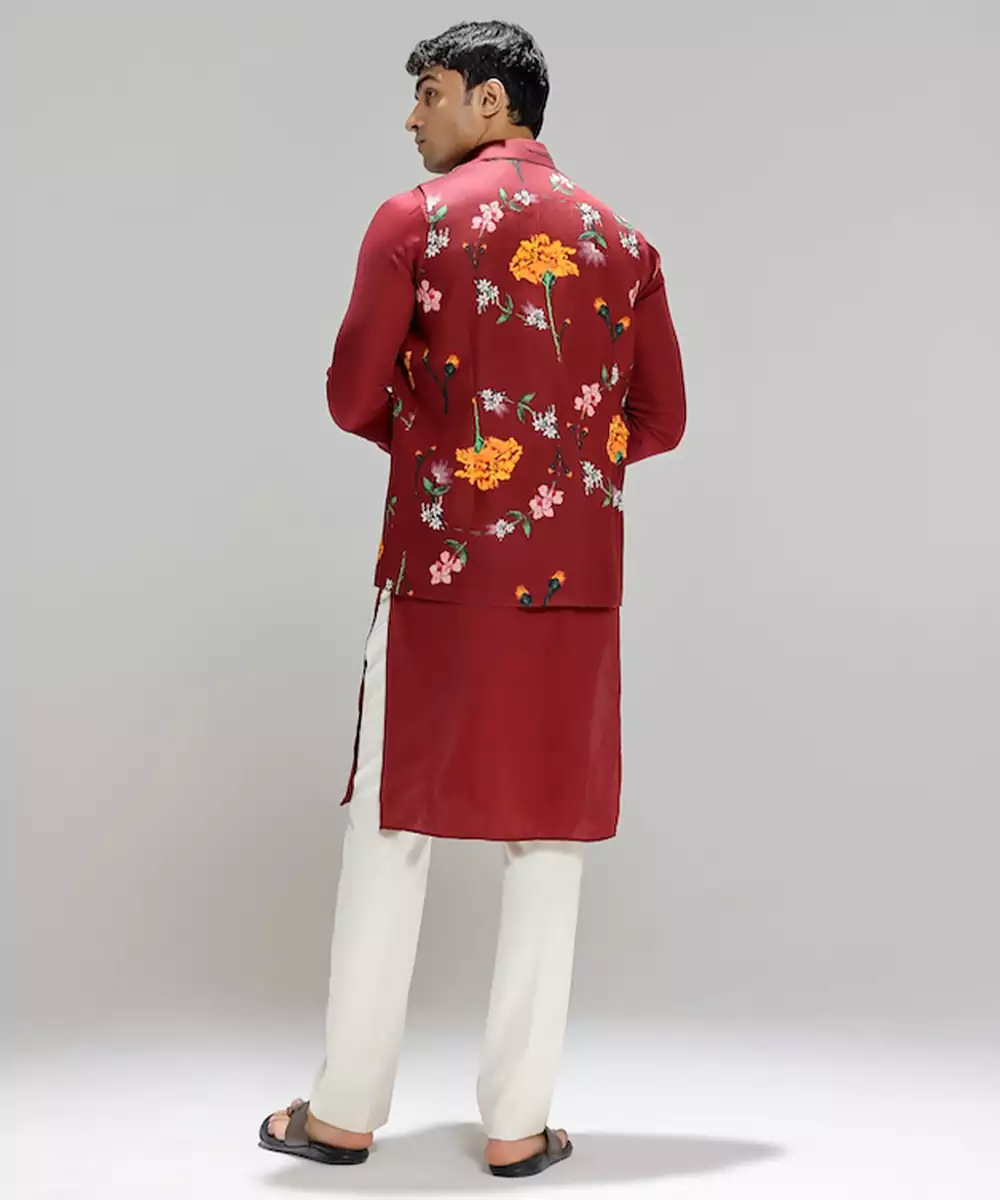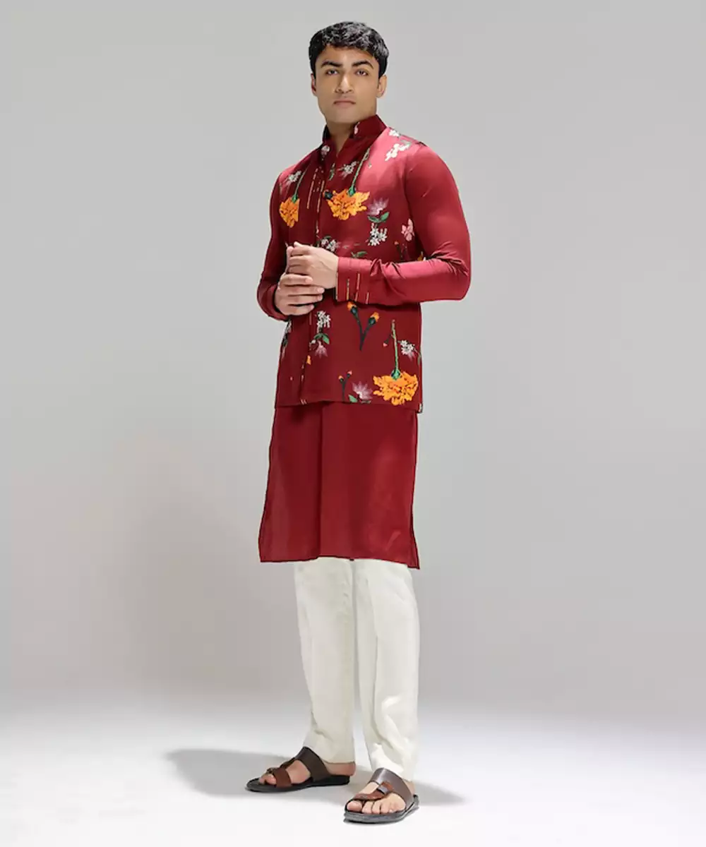 This Red Printed Cotton Silk Kurta Jacket Set Exudes Refined Elegance With Its Soft Sheen And Smooth, Comfortable Drape. The Vibrant Prints Add A Stylish, Contemporary Charm, While The Matching Jacket Enhances Its Festive Appeal. Perfect For Celebrations, Weddings, And Cultural Events, It Blends Tradition With Modern Sophistication For A Polished Ethnic Look.