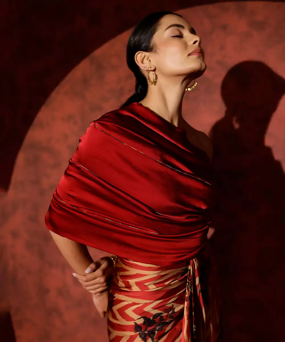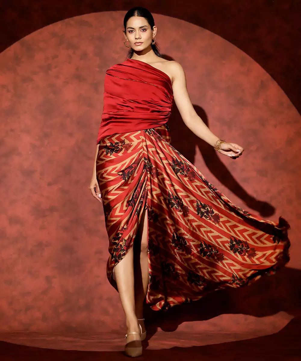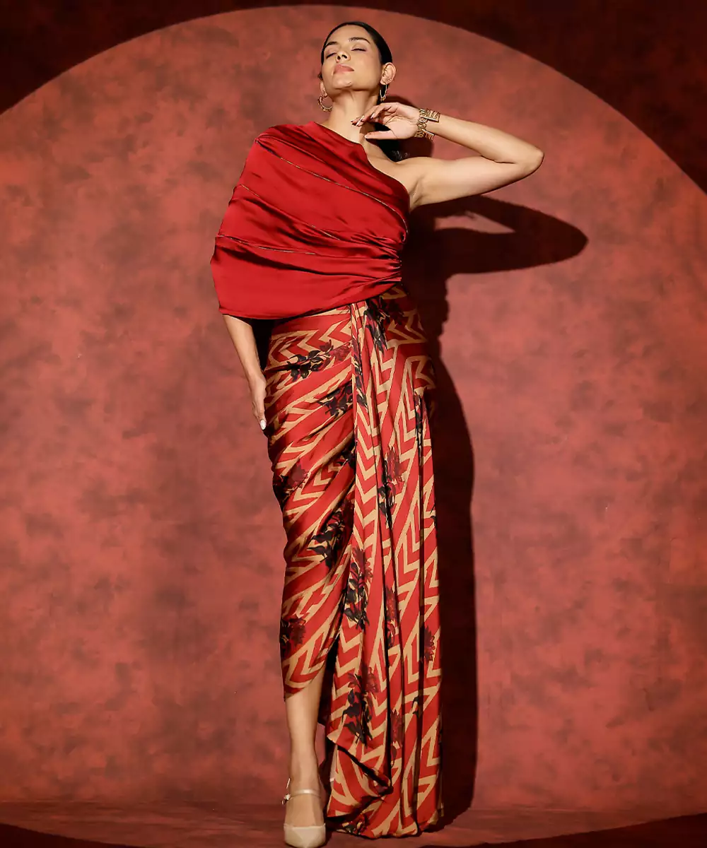 This Red Printed Georgette Gown Radiates Graceful Charm With Its Vibrant Hue And Flowing Silhouette. The Lightweight Georgette Fabric Drapes Beautifully, While The Delicate Prints Add A Touch Of Artistic Elegance. Perfect For Celebrations, Evening Events, And Festive Gatherings, It Blends Comfort With Effortless Sophistication For A Standout Look.