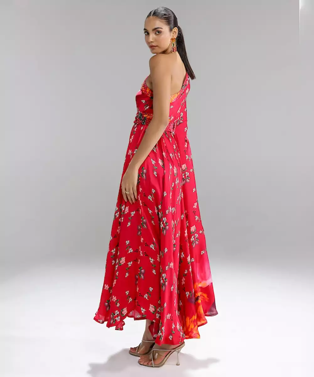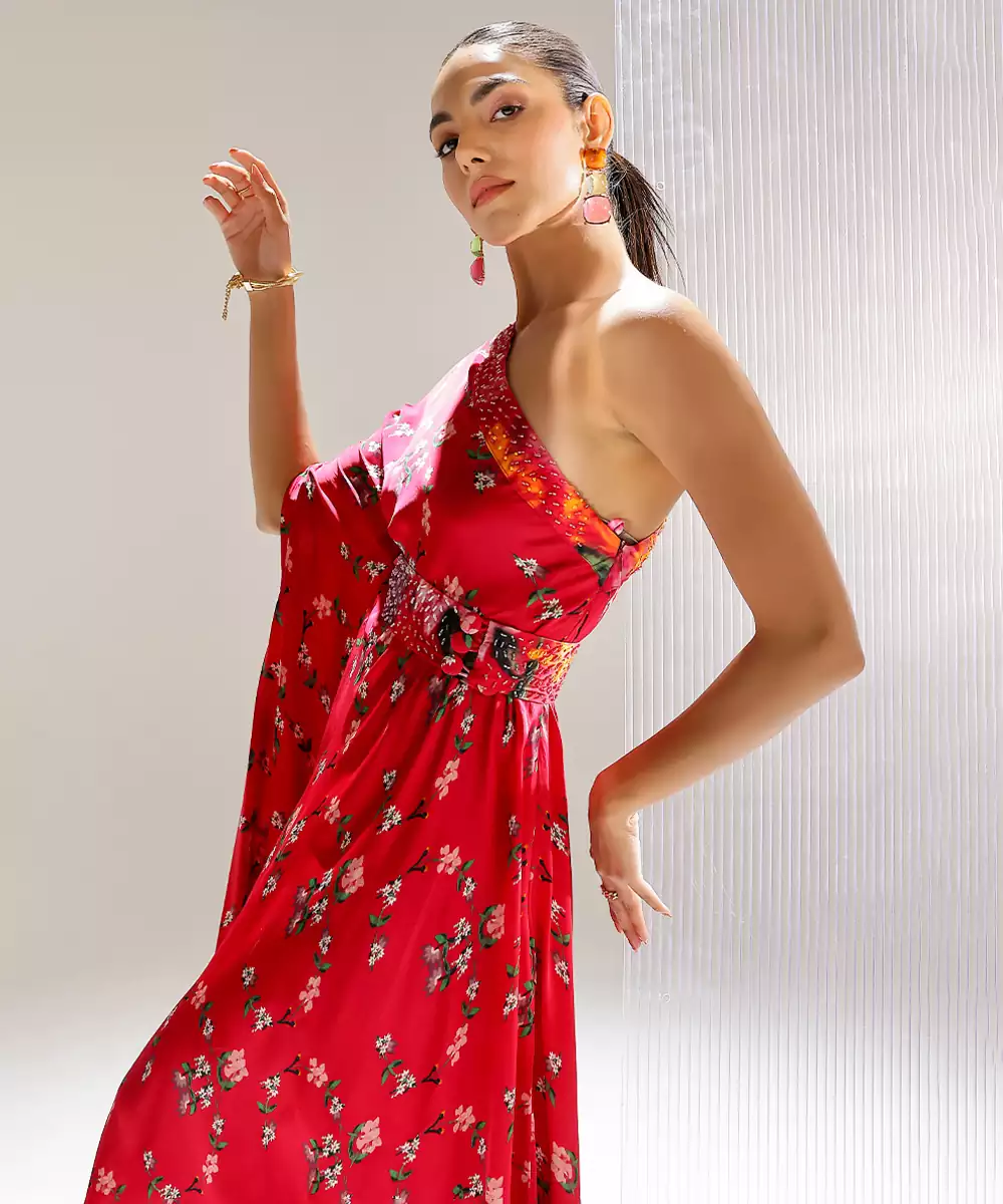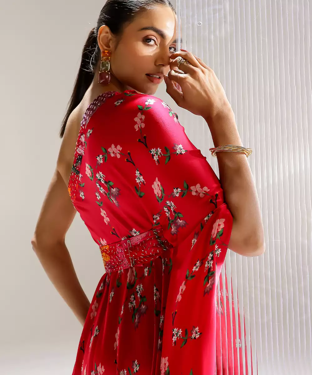 This Red Printed Georgette Gown Radiates Graceful Charm With Its Flowing Silhouette And Lightweight, Airy Drape. The Refreshing Hue Paired With Artistic Prints Adds A Touch Of Contemporary Elegance. Perfect For Festive Gatherings, Celebrations, And Evening Events, It Blends Comfort With Effortless Sophistication For A Beautifully Refined Look.