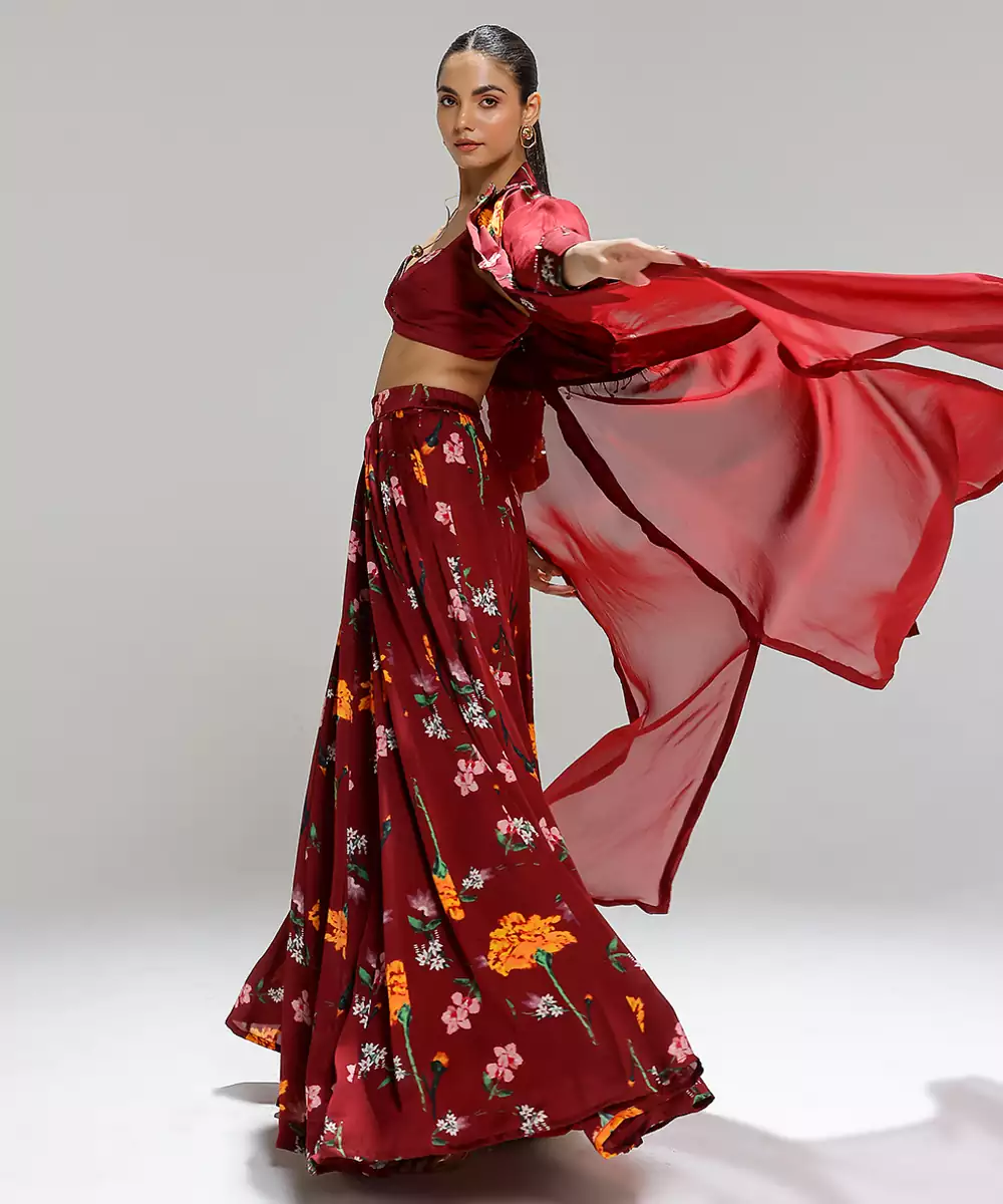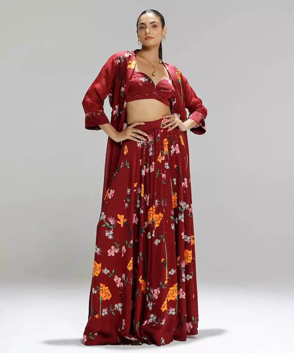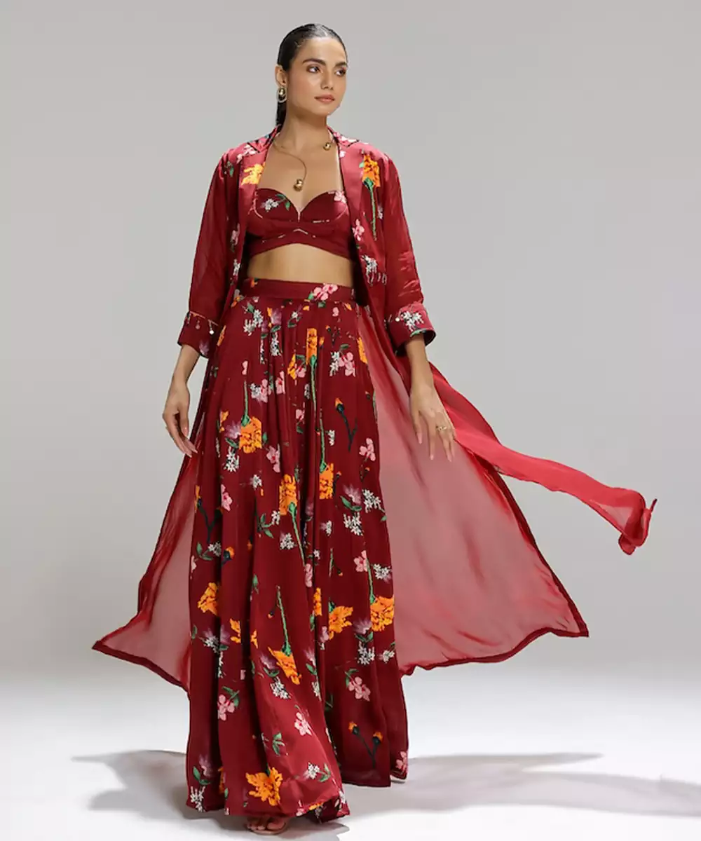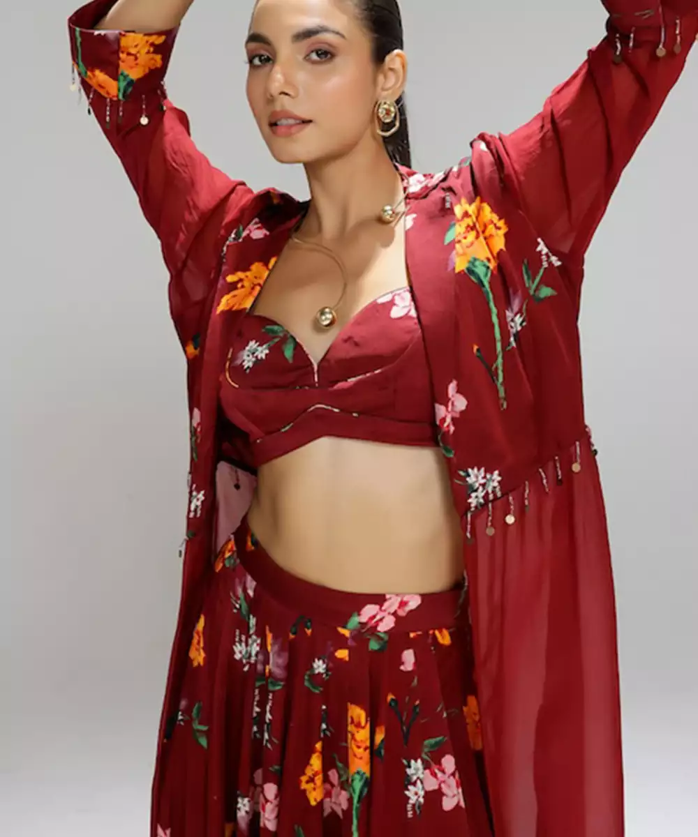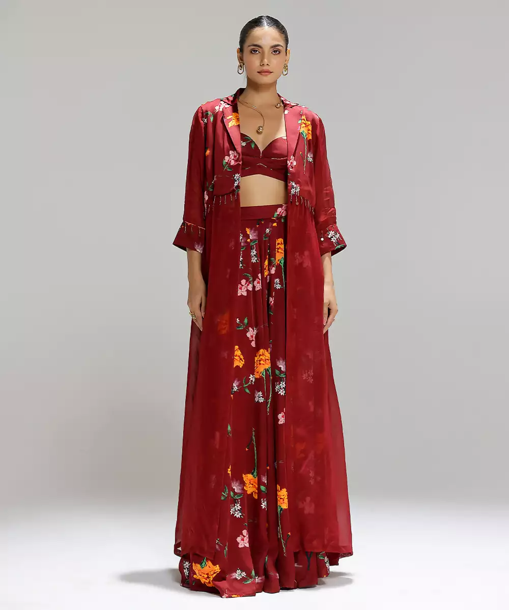 This Red Printed Organza Co Ord Set Exudes Airy Elegance With Its Sheer Texture And Graceful, Lightweight Drape. The Vibrant Prints Add A Festive, Artistic Charm, Creating A Chic Contemporary Look. Perfect For Celebrations, Daytime Events, And Special Gatherings, It Blends Sophistication With Effortless Style For A Standout Ensemble.