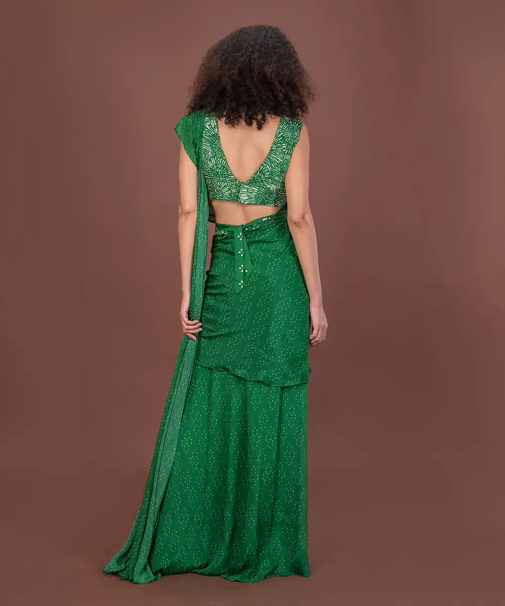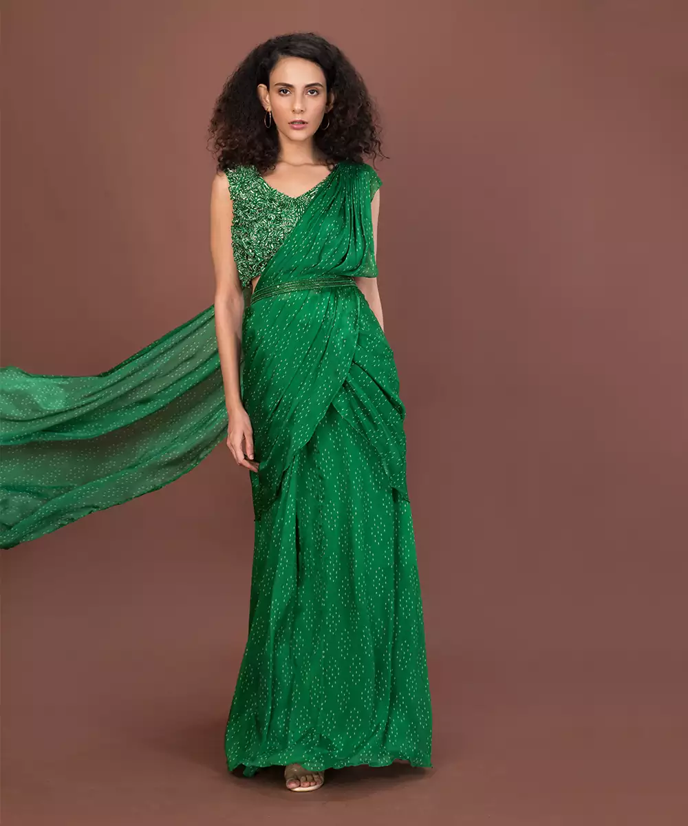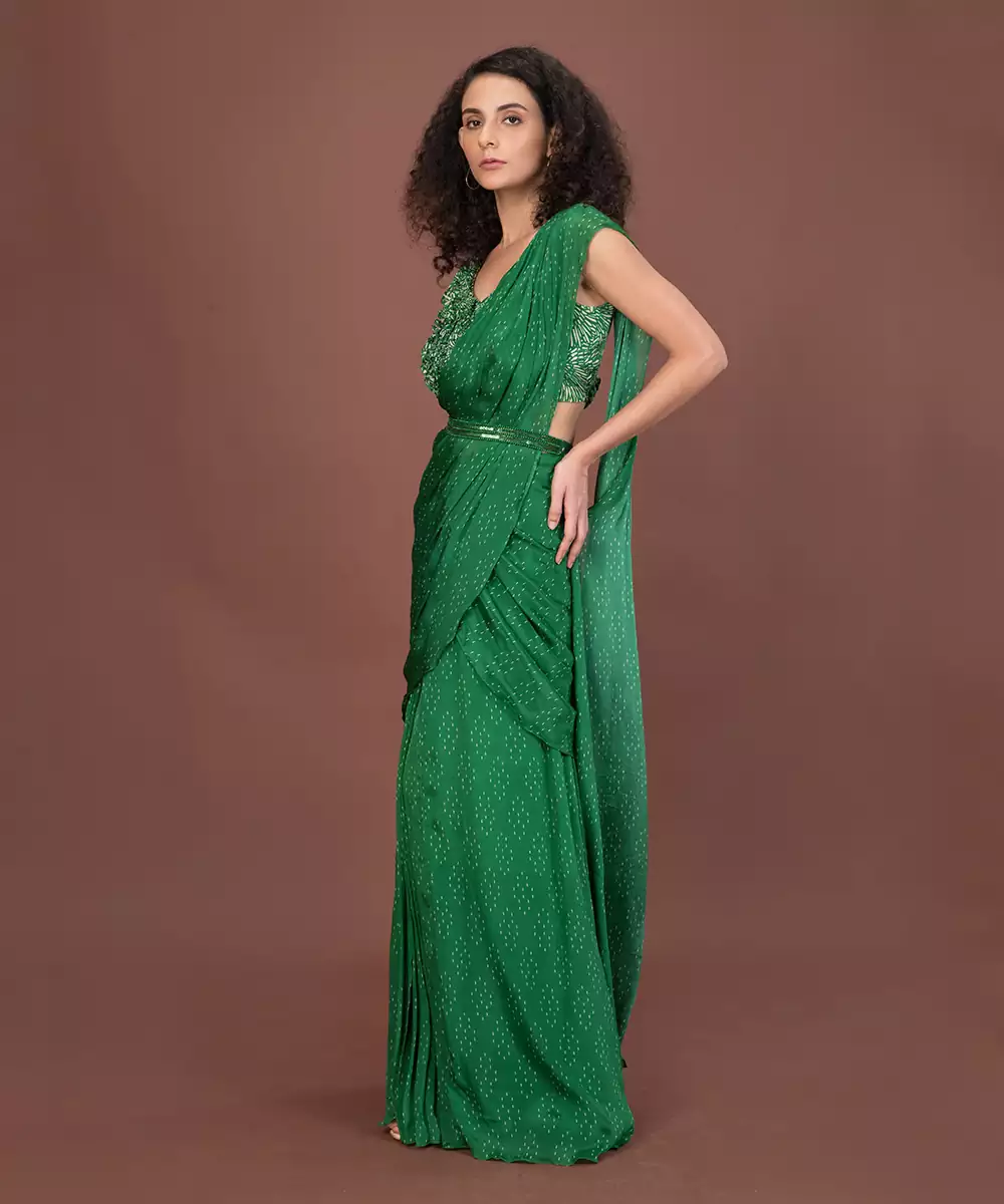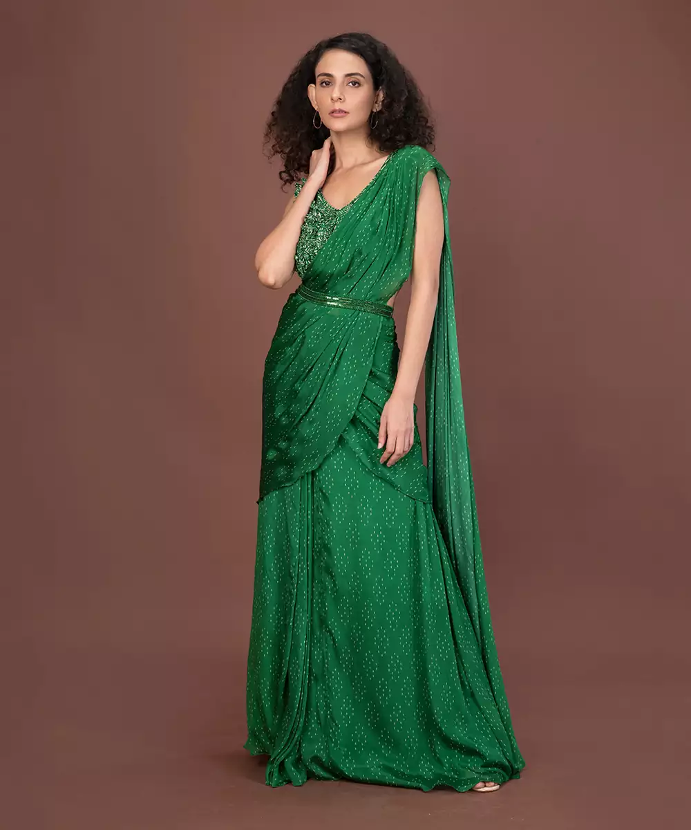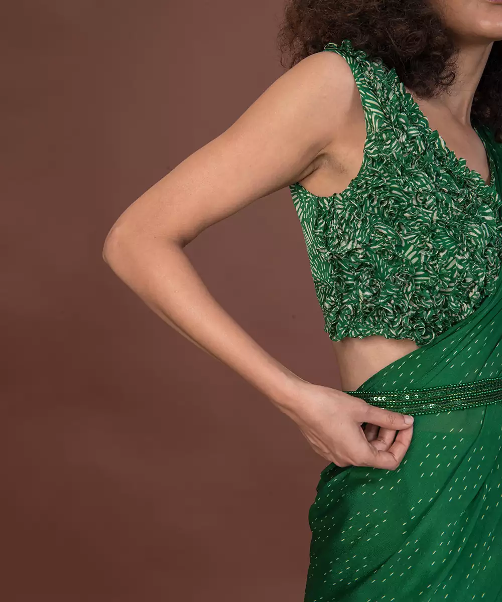 A Ruffled Printed Blouse With A Rich Silk Pre Stitched Saree. The Hand Embroidered Belt Adds The Extra Oomph.