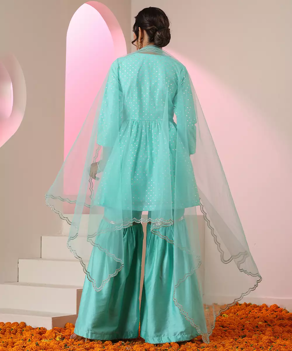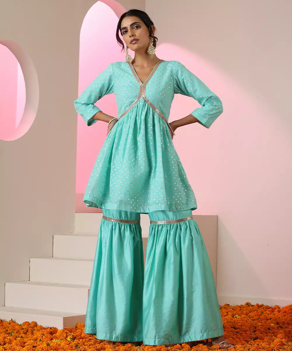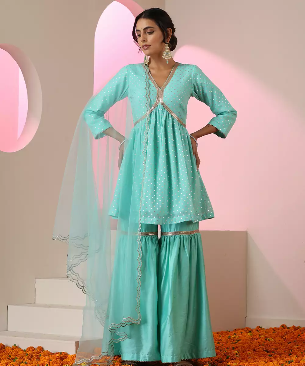 This Blue Embroidered Chanderi Gharara Set Radiates Elegance With Its Rich Hue And Intricate Detailing. Crafted From Premium Chanderi Fabric, It Offers A Lightweight, Graceful Drape And A Beautifully Flared Gharara For A Regal Look. Perfect For Festive Occasions, Weddings, Or Celebrations, This Set Blends Tradition With Refined Sophistication.