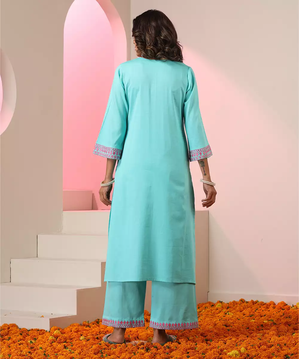 This Blue Embroidered Cotton Kurta Set Blends Comfort With Refined Elegance. Crafted From Breathable Cotton, The Kurta Features Intricate Embroidery That Adds A Touch Of Sophistication. Paired With A Matching Bottom, The Set Offers A Graceful Silhouette Ideal For Festive Celebrations, Family Gatherings, Or Stylish Everyday Wear.