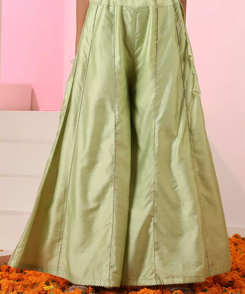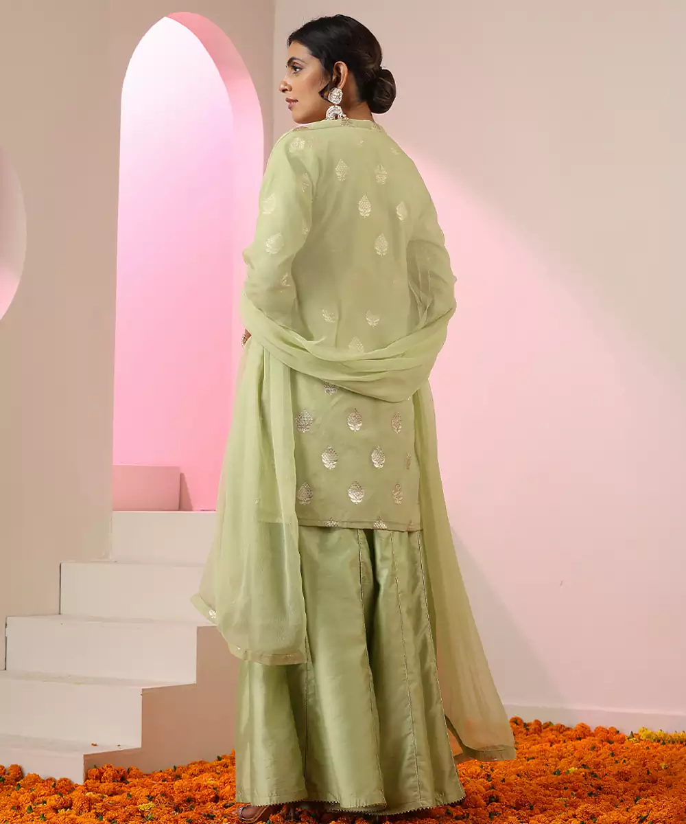 This Green Embroidered Chanderi Kurta Set Exudes Classic Elegance With Its Subtle Sheen And Intricate Detailing. Crafted From Premium Chanderi Fabric, It Offers A Lightweight, Flowy Silhouette Perfect For Festive Occasions, Pujas, Or Daytime Celebrations. The Delicate Embroidery Enhances Its Refined And Graceful Appeal, Making It A Timeless Ethnic Staple.