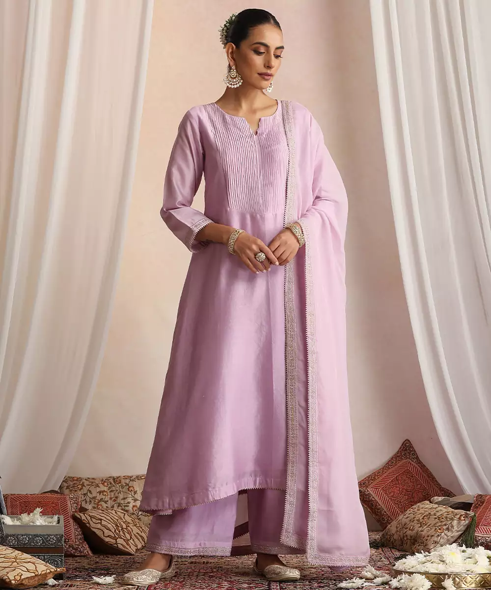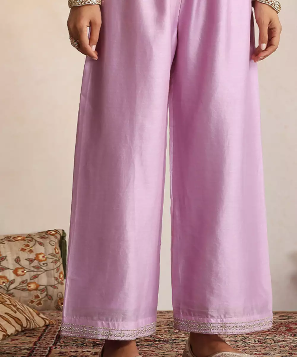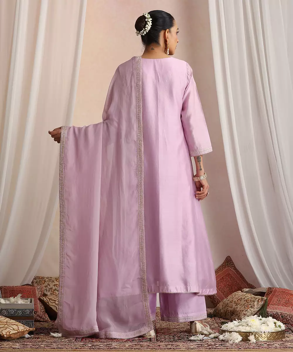 This Lavender Embroidered Chanderi Kurta Set Exudes Classic Elegance With Its Subtle Sheen And Intricate Detailing. Crafted From Premium Chanderi Fabric, It Offers A Lightweight, Flowy Silhouette Perfect For Festive Occasions, Pujas, Or Daytime Celebrations. The Delicate Embroidery Enhances Its Refined And Graceful Appeal, Making It A Timeless Ethnic Staple.