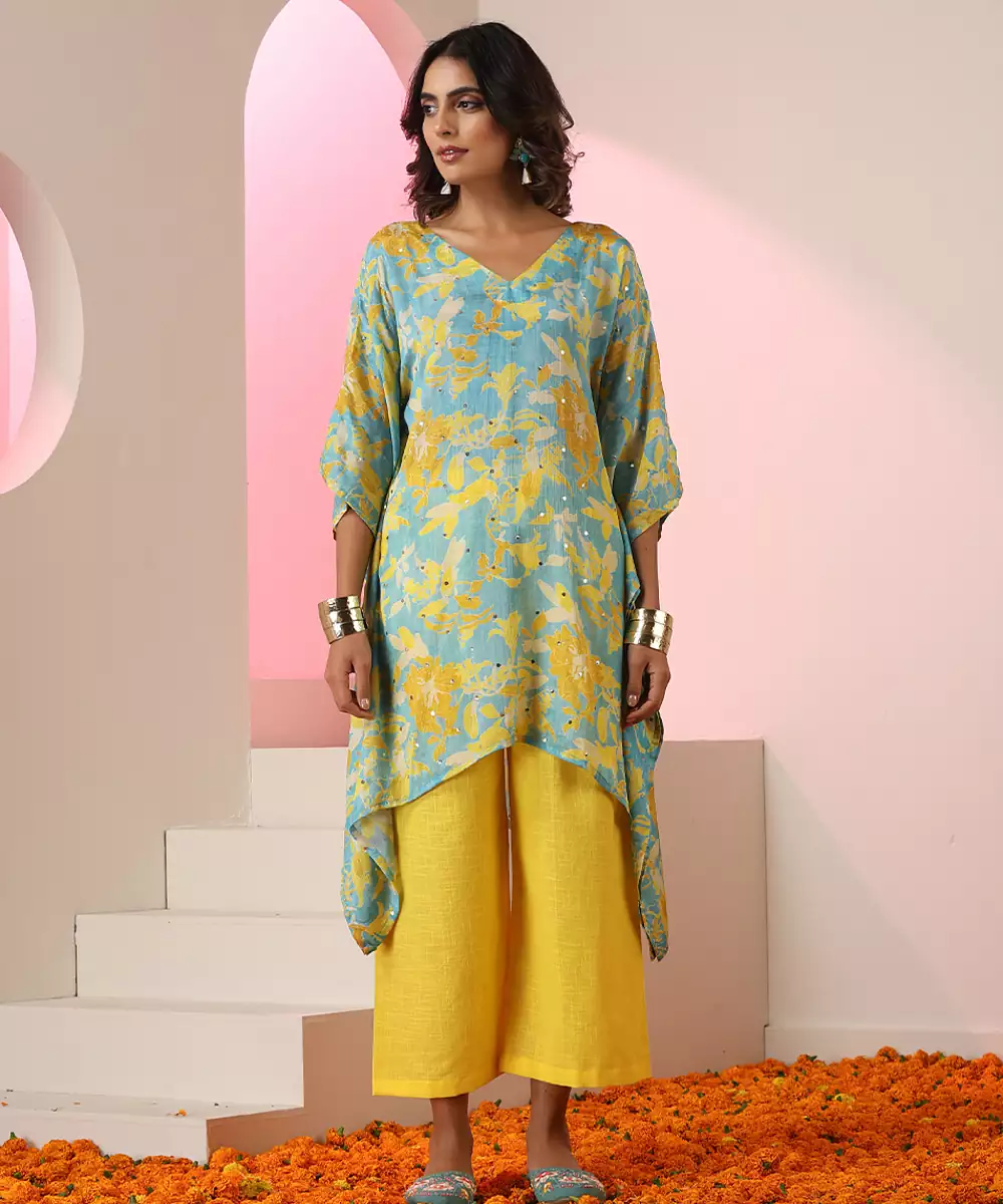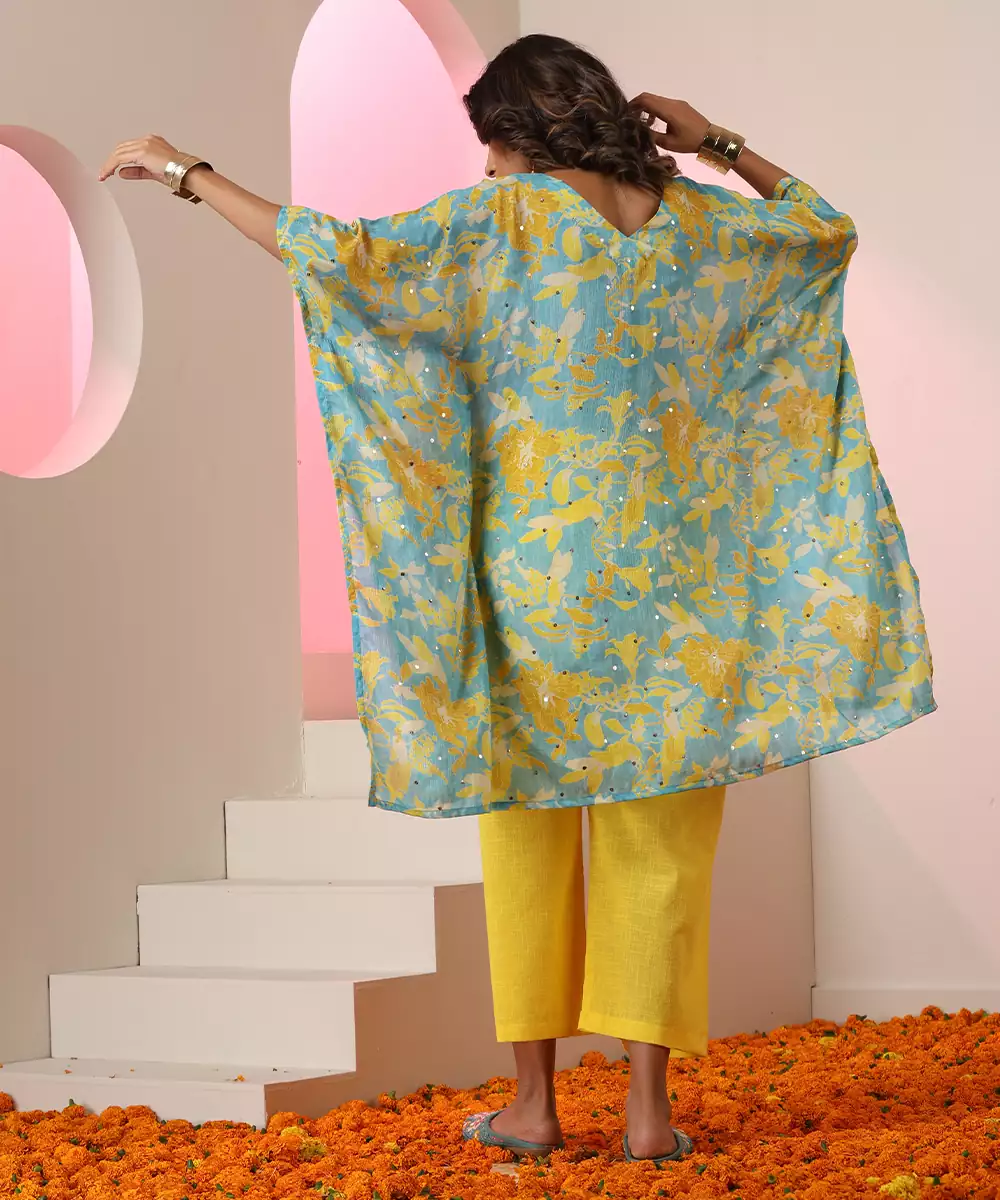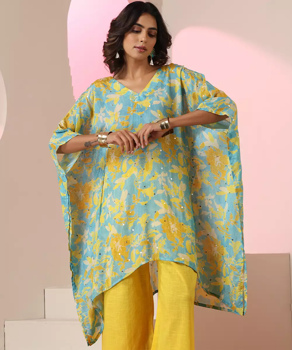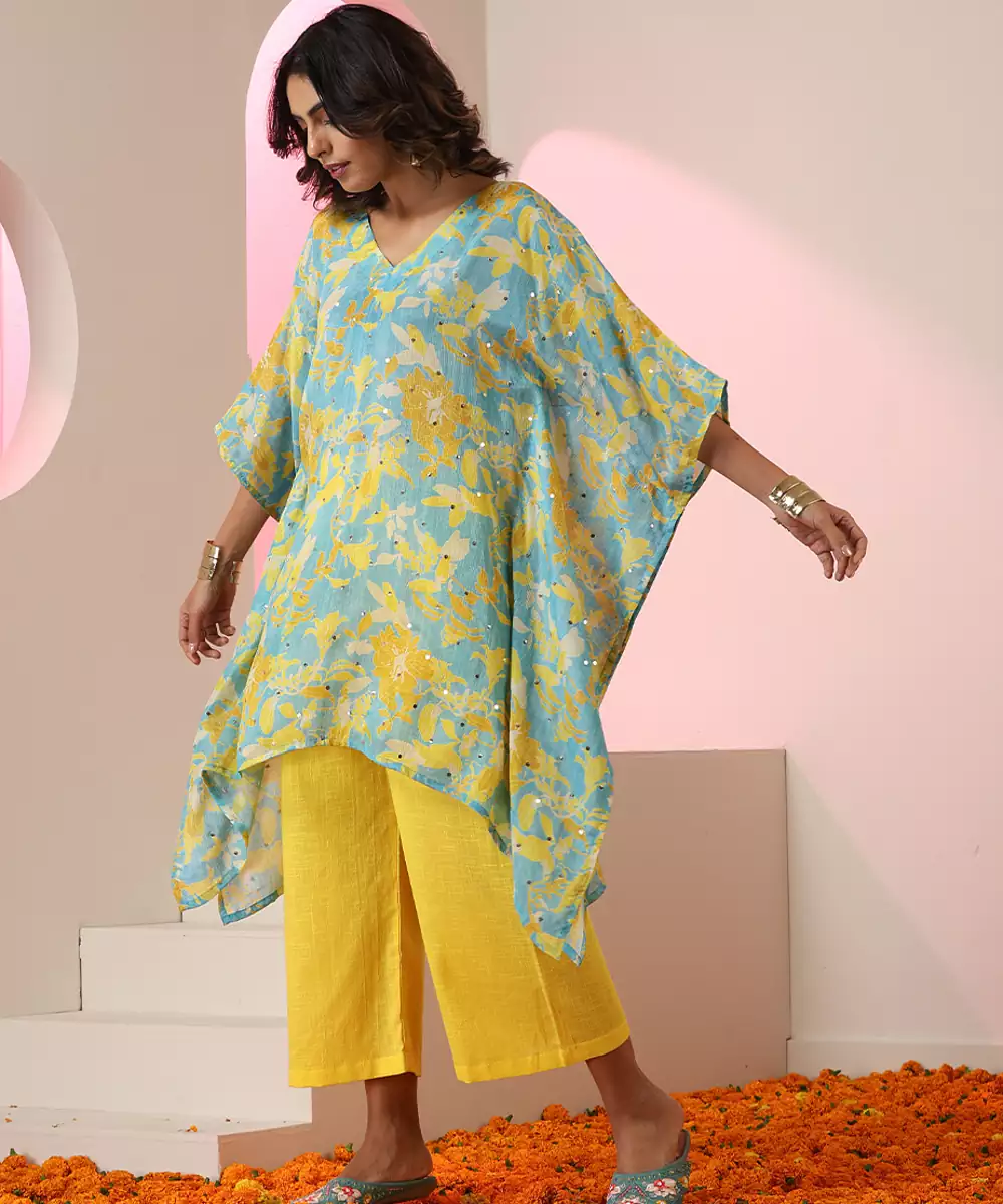 This Multicolour Printed Crepe Kaftan Showcases Vibrant Patterns And A Breezy Silhouette, Perfect For Stylish Comfort. Crafted From Lightweight Crepe Fabric, It Drapes Beautifully And Allows Easy Movement. Ideal For Vacations, Brunches, Or Relaxed Outings, This Kaftan Adds A Lively, Elegant Touch To Your Wardrobe With Its Effortless Charm.