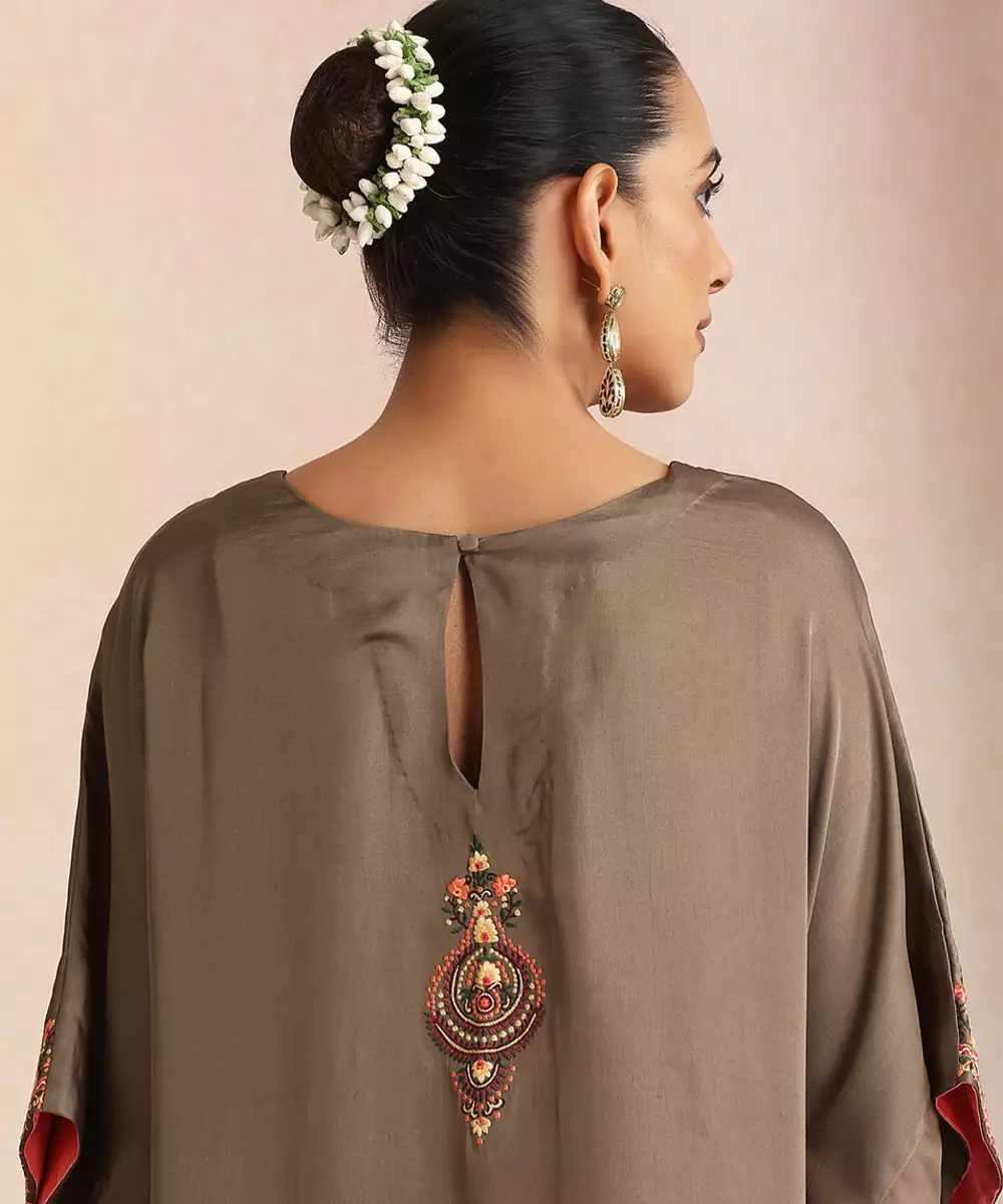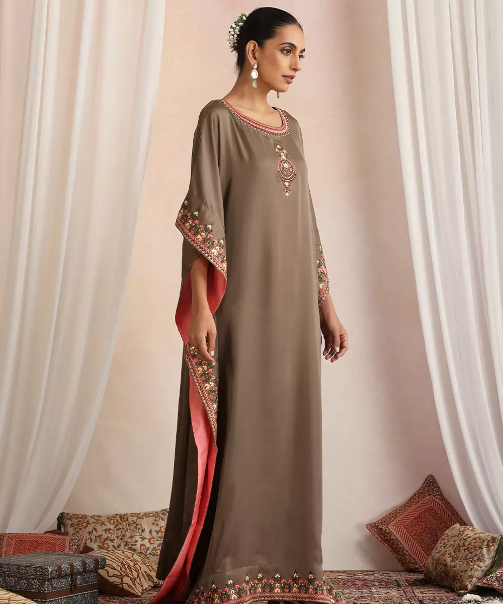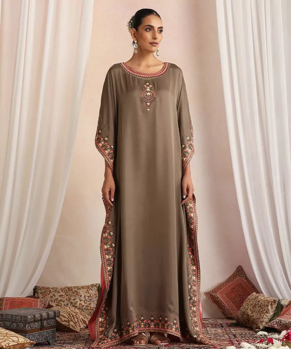 This Olive Embroidered Cotton Kaftan Blends Comfort With Refined Elegance. Crafted From Soft, Breathable Cotton, It Features Intricate Embroidery That Adds A Touch Of Sophistication. The Relaxed, Flowy Silhouette Ensures Ease Of Movement, Making It Perfect For Casual Outings, Vacations, Or Festive Gatherings With An Effortlessly Stylish Appeal.