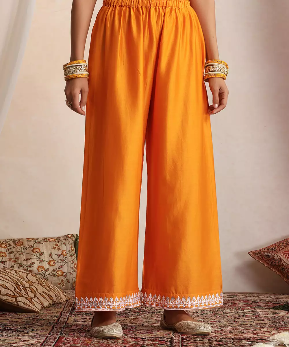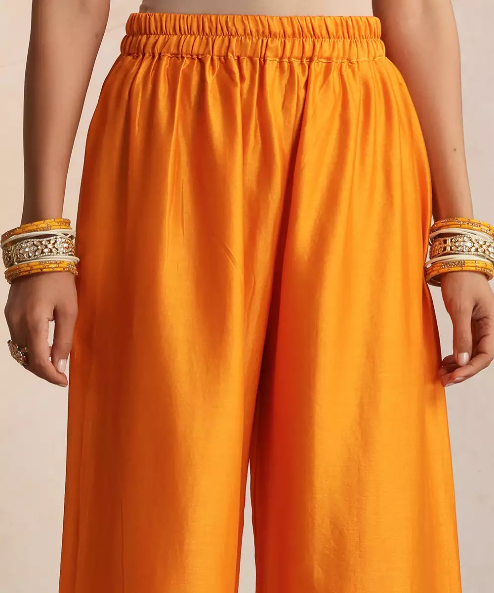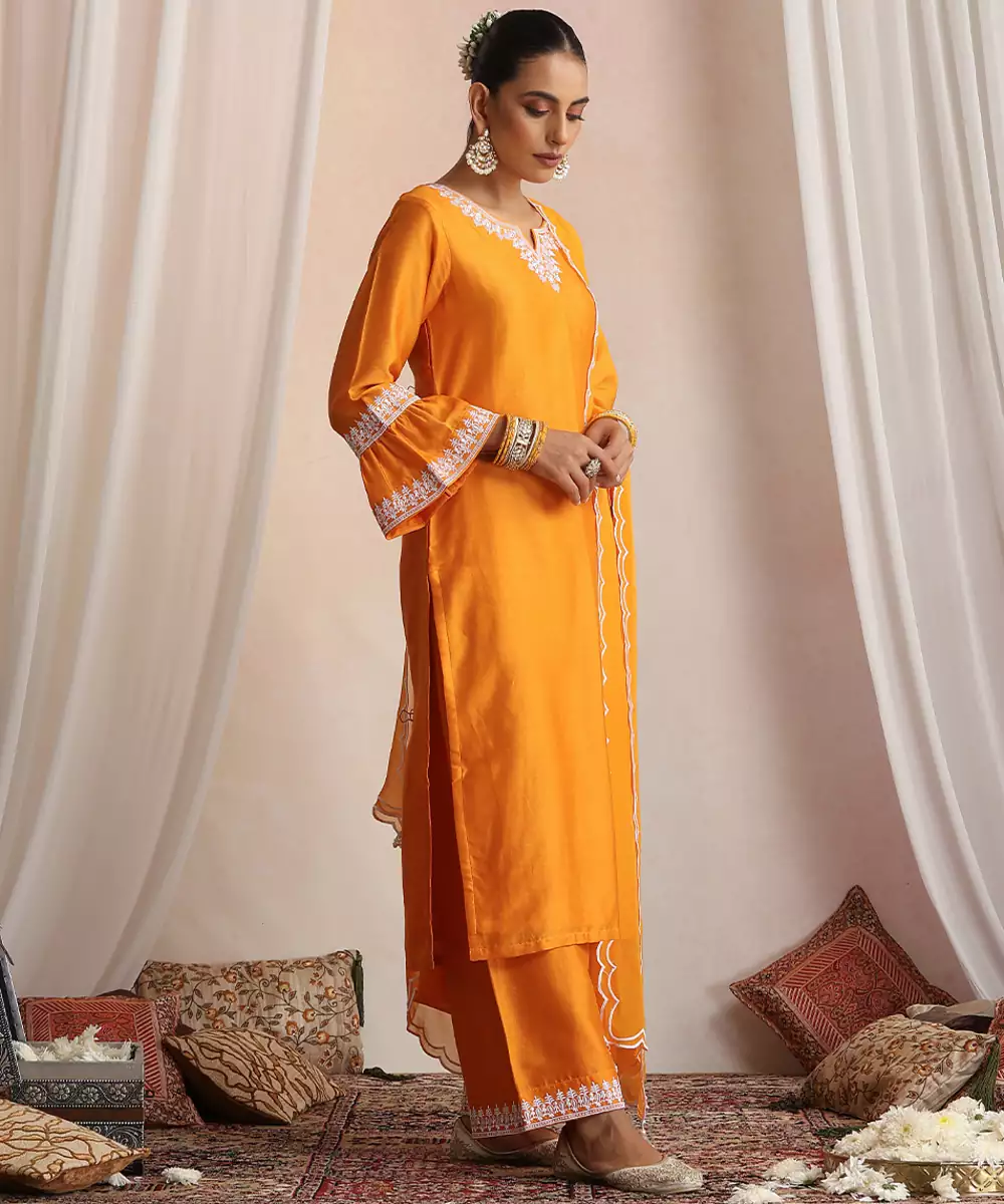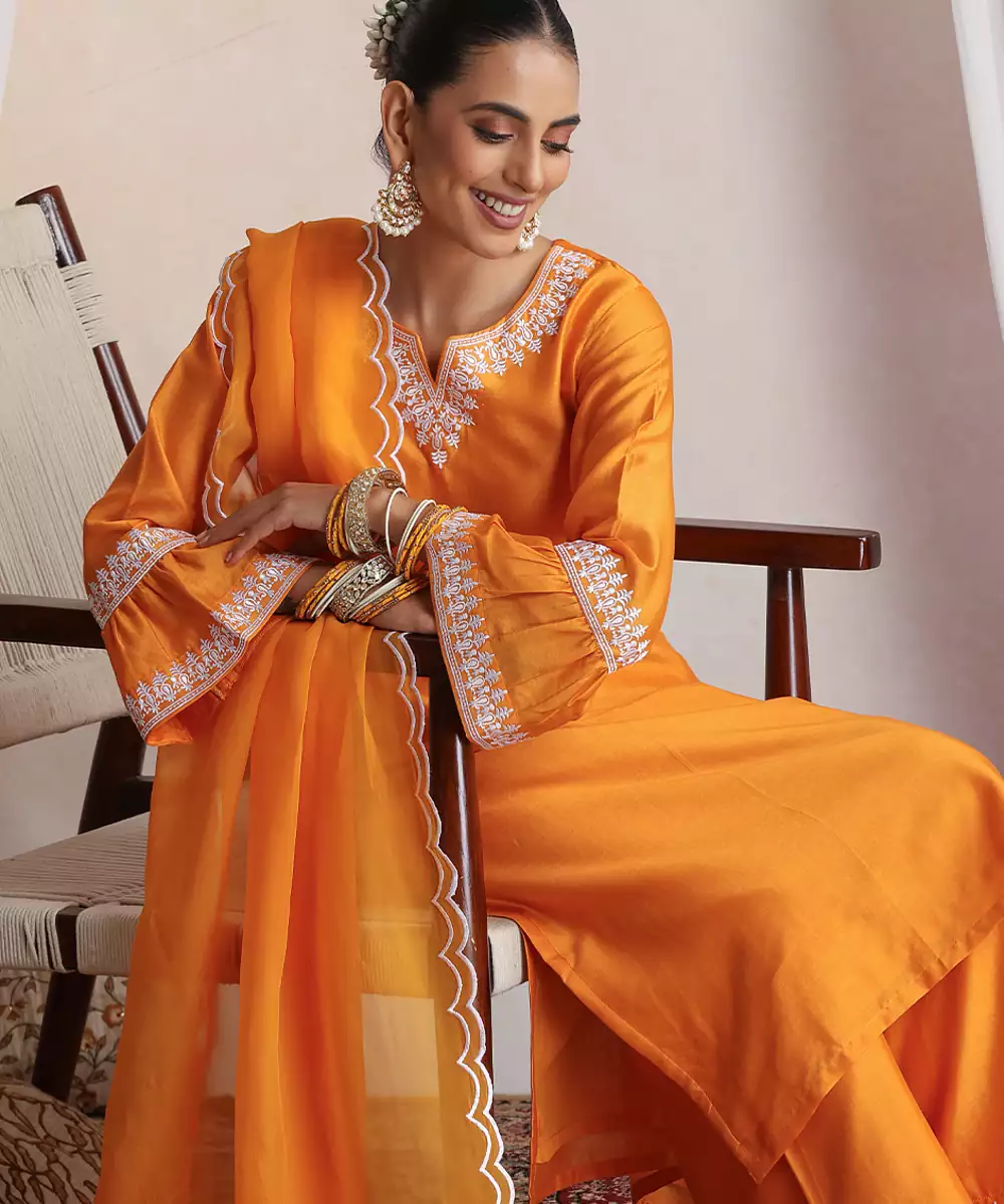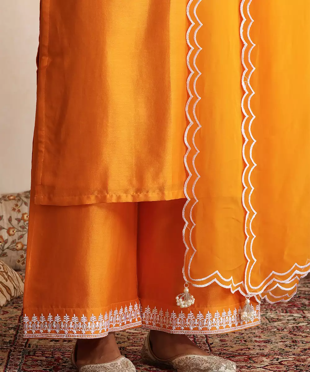 This Orange Embroidered Chanderi Kurta Set Exudes Classic Elegance With Its Subtle Sheen And Intricate Detailing. Crafted From Premium Chanderi Fabric, It Offers A Lightweight, Flowy Silhouette Perfect For Festive Occasions, Pujas, Or Daytime Celebrations. The Delicate Embroidery Enhances Its Refined And Graceful Appeal, Making It A Timeless Ethnic Staple.