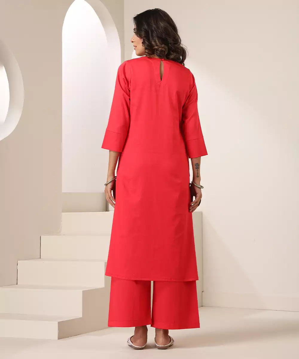 This Red Plain Cotton Kurta Set Offers A Blend Of Simplicity And Everyday Elegance. Made From Soft, Breathable Cotton, It Ensures All Day Comfort. The Minimal Design And Vibrant Red Color Create A Refined Look Suitable For Casual Outings, Festive Events, Or Family Gatherings, Making It A Versatile Wardrobe Essential.